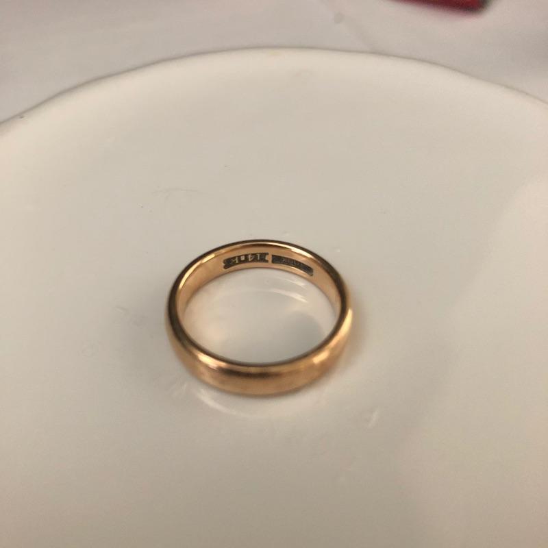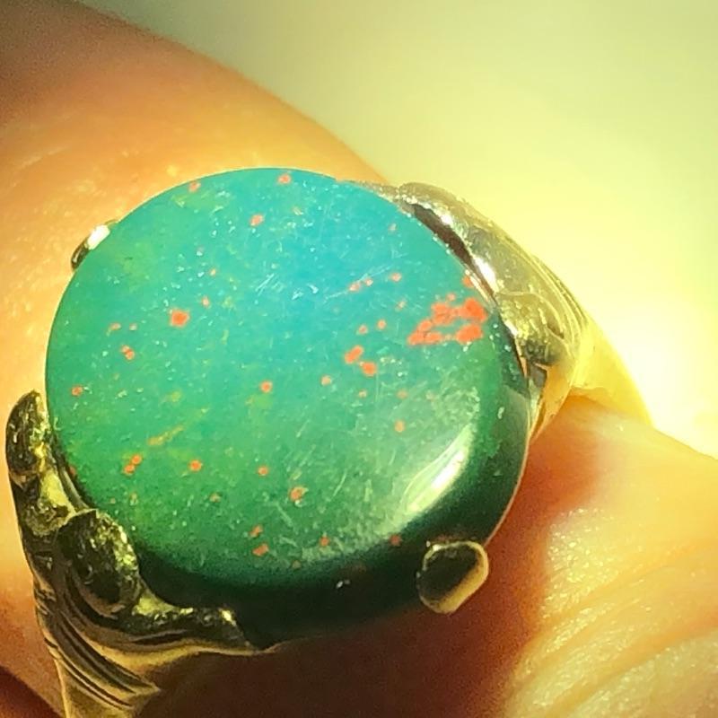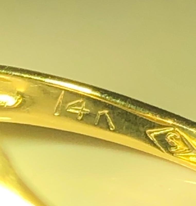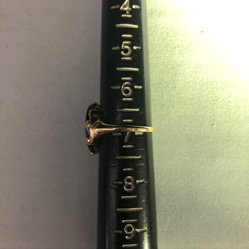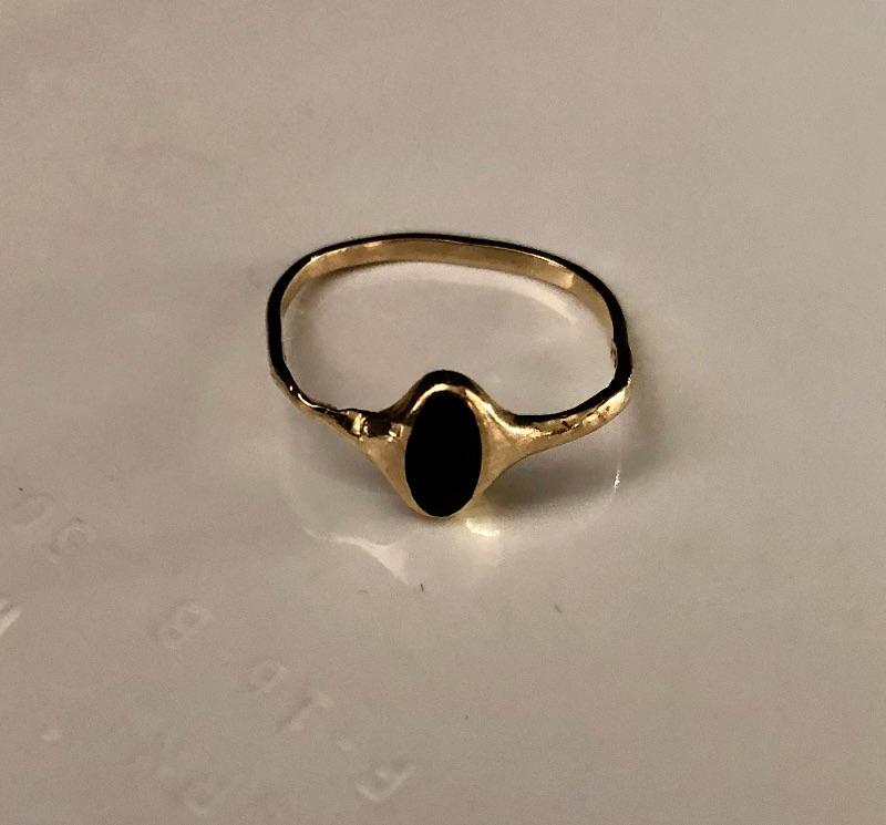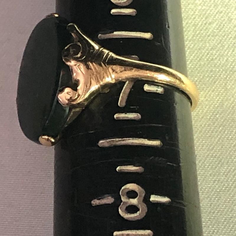 This Crooks 14K gold wedding band is accompanied by two stone rings also in 14K. The larger stone is a very attractive piece that looks black indoors but when in bright light it shows that it’s actually a green stone with red flecks. The smallest of the three rings has a square shaped band and a small black stone centerpiece. See images for markings and sizes.