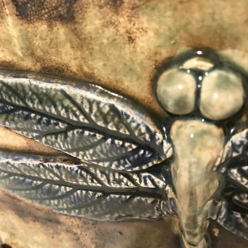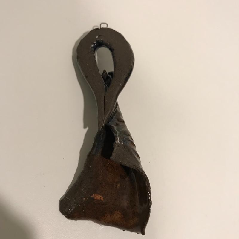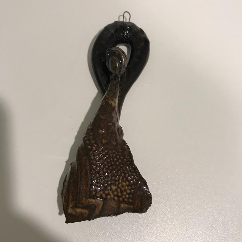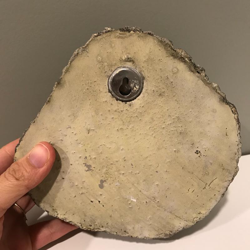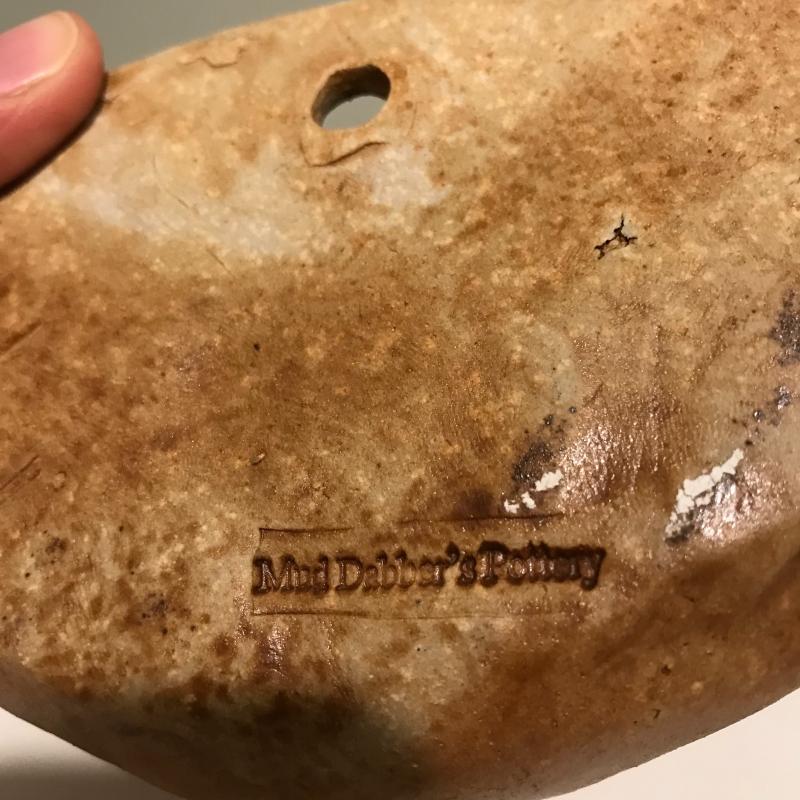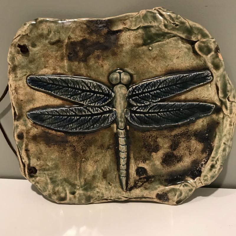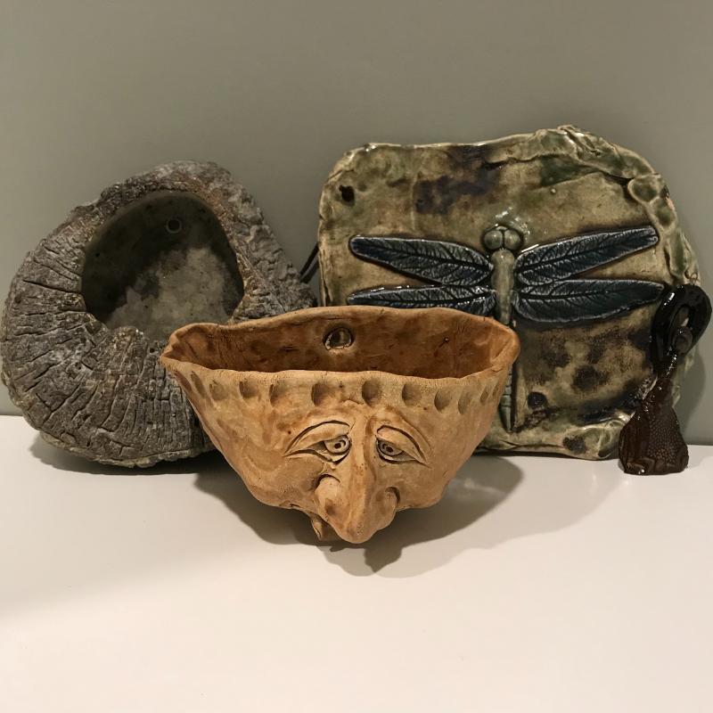 Four unique hanging pieces from a faced pot to a small delicate woman figure. The dragonfly measures approx. 8.5”x7.5 and is by Christopher Mello. The face is by Mudd Dabber. The tree trunk-like piece seems to be made of concrete and has a hollowed out area with lots of details. Shipping available or local pick up in Arden, NC.