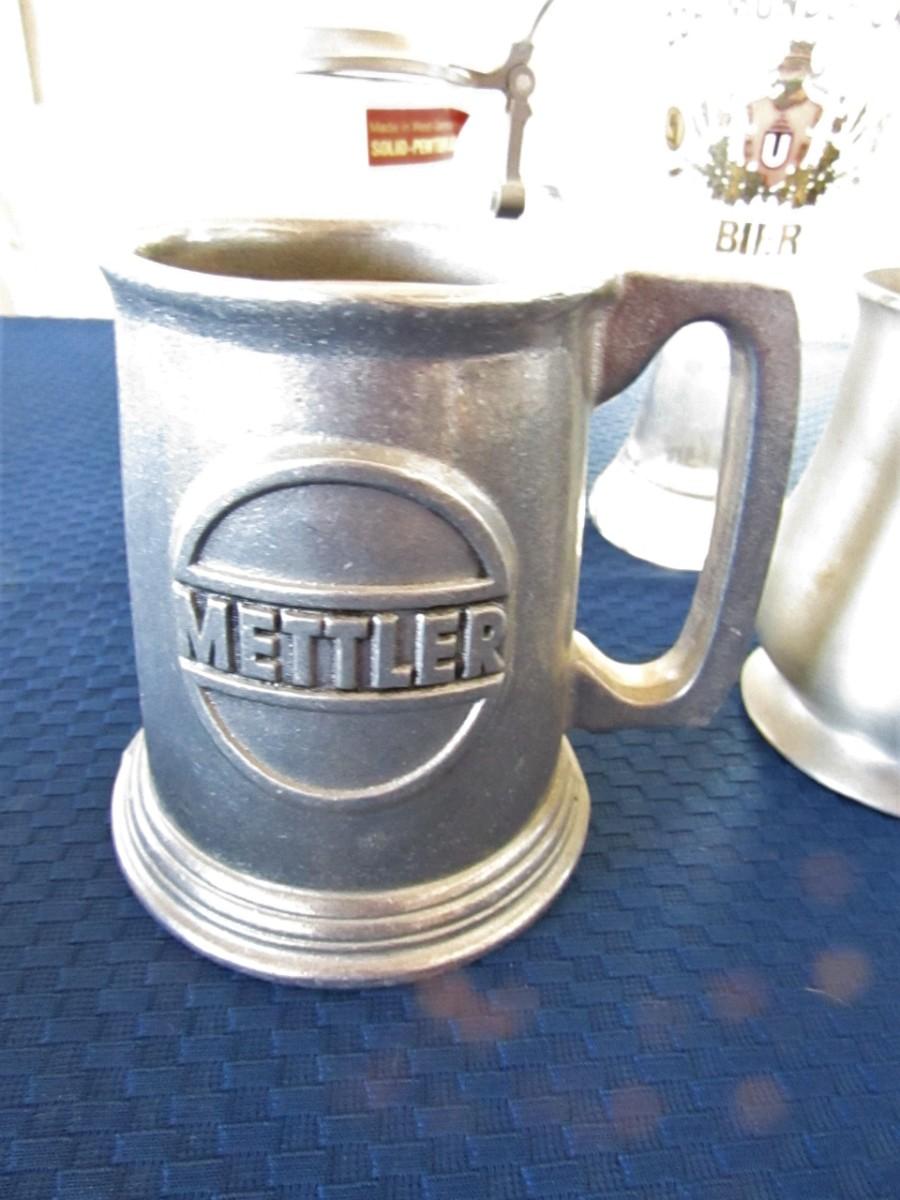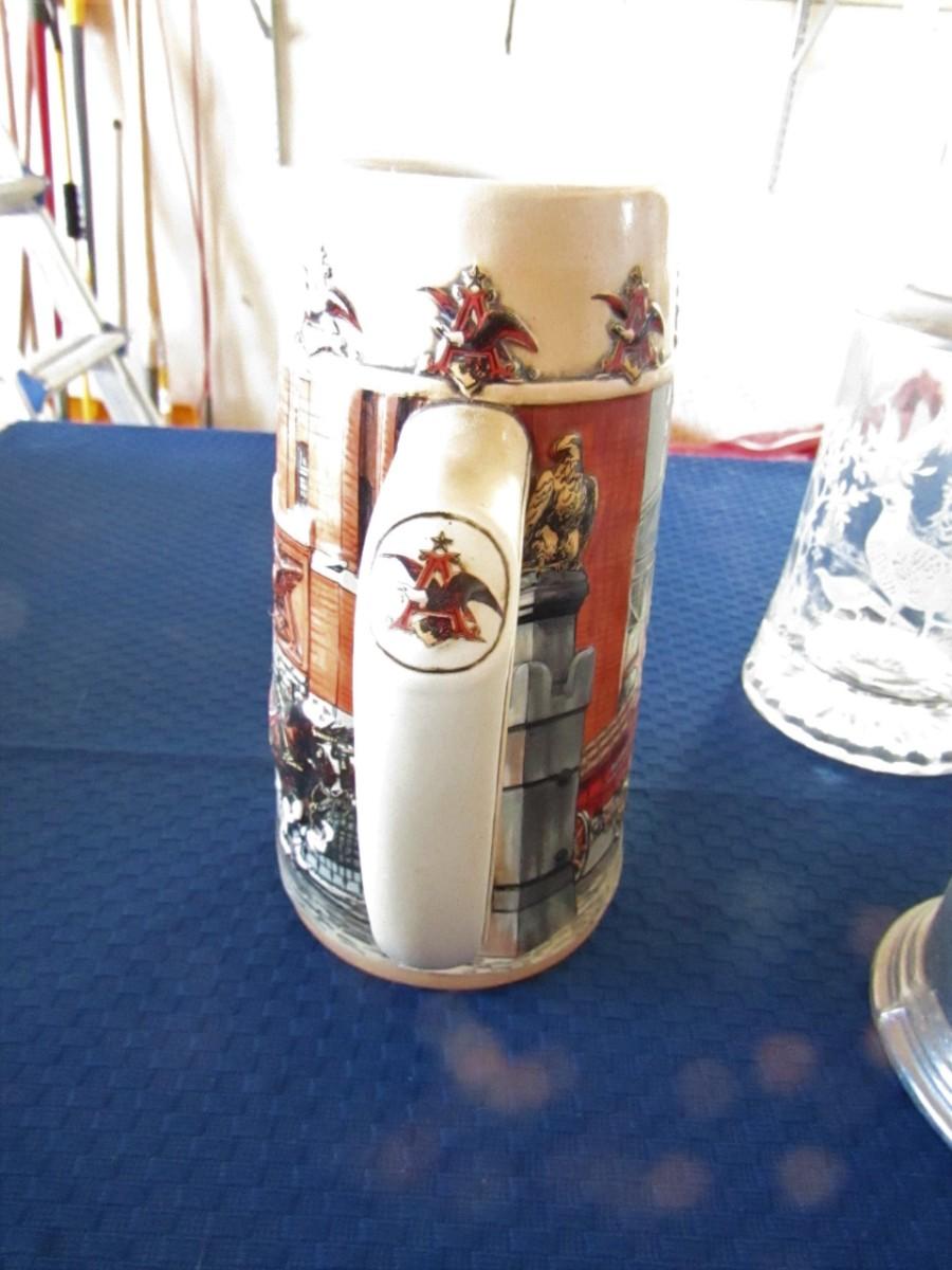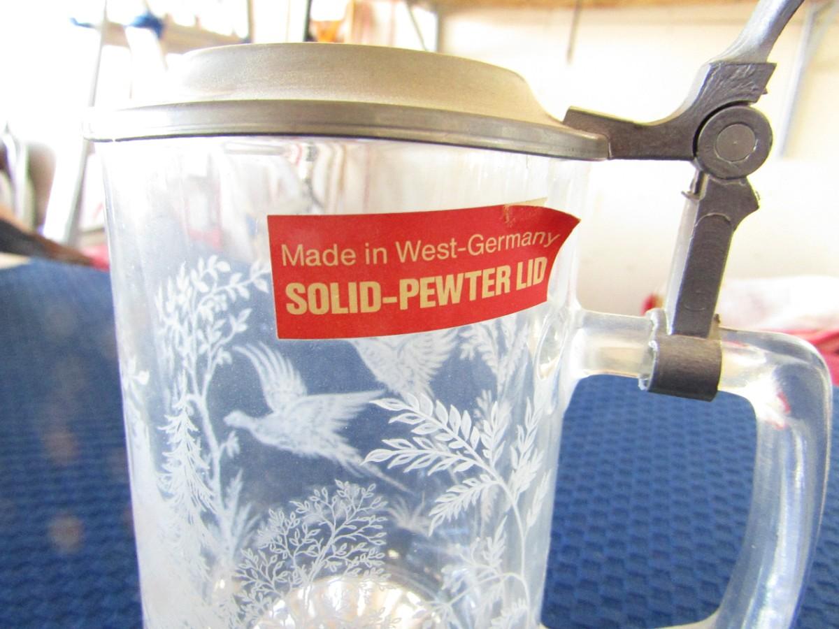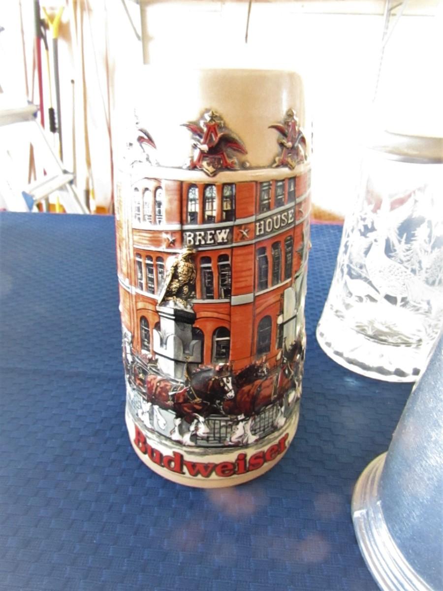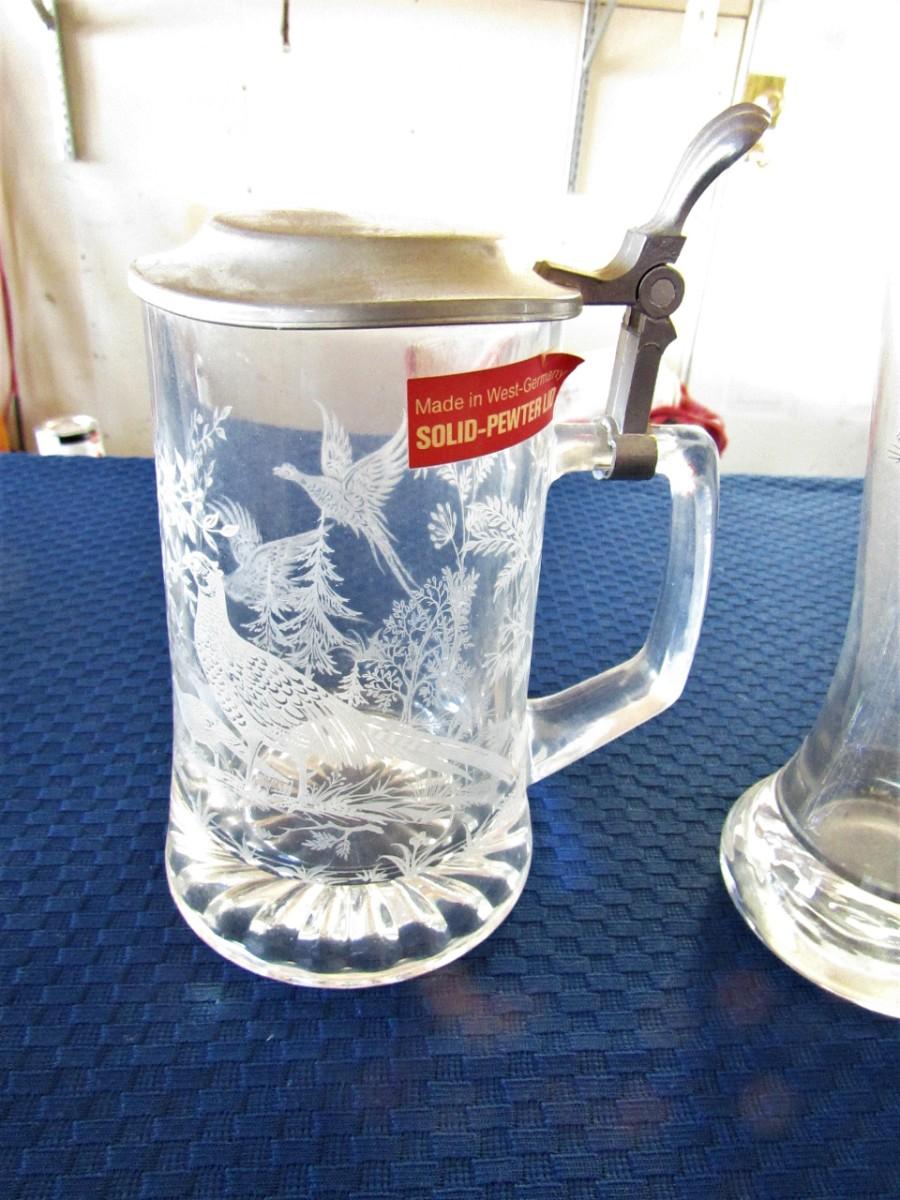 BEER STEINS: ANHEUSER-BUSCH, INC BUDWEISER, NATIONAL HISTORICAL LANDMARK SERIES "A' 98928, " "METTLER" BY WILTON ARMENTLE MADE IN THE USA, ETCHED GLASS WITH SOLID PEWTER LID MADE IN WEST GERMANY, & DORTMUNDER UNION BIER PINT