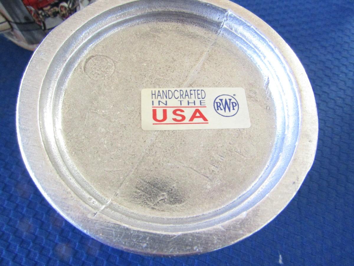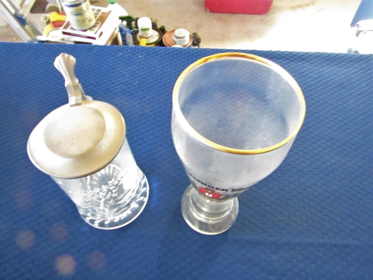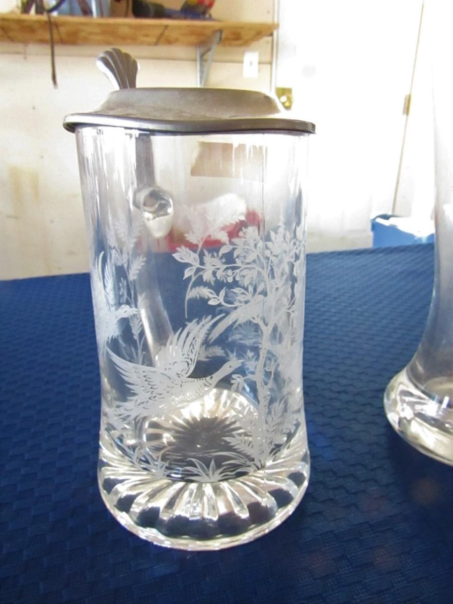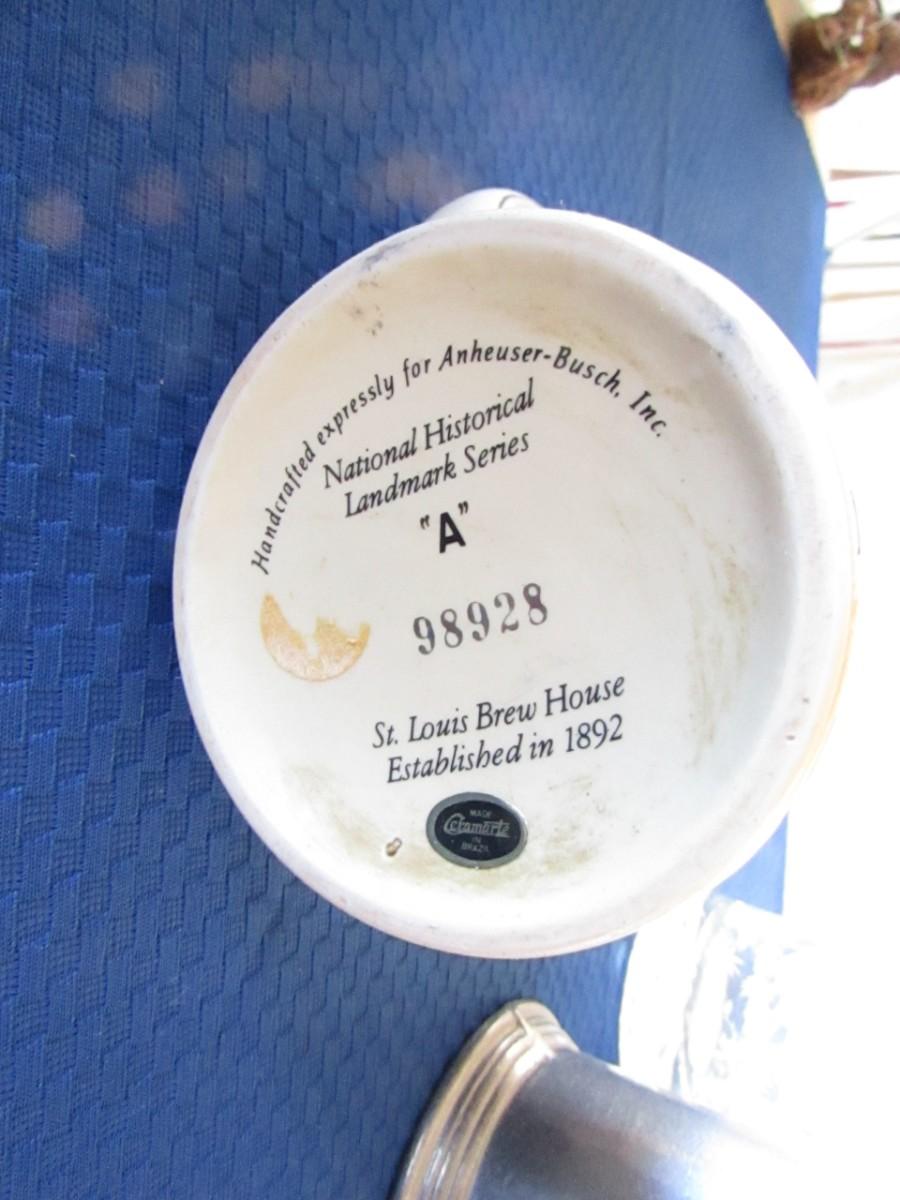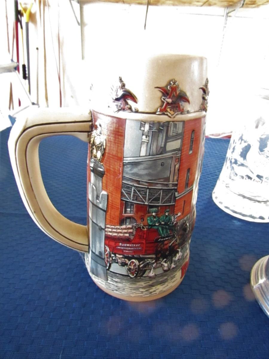 BEER STEINS: ANHEUSER-BUSCH, INC BUDWEISER, NATIONAL HISTORICAL LANDMARK SERIES "A' 98928, " "METTLER" BY WILTON ARMENTLE MADE IN THE USA, ETCHED GLASS WITH SOLID PEWTER LID MADE IN WEST GERMANY, & DORTMUNDER UNION BIER PINT