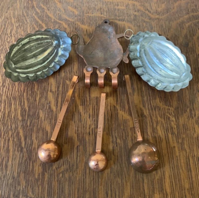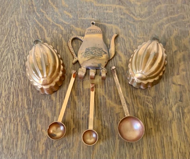 5” Teapot with hooks and 3 measuring spoons and 2 melon shaped, tin lined molds, 3 3/4.” Excellent condition with lovely patina.