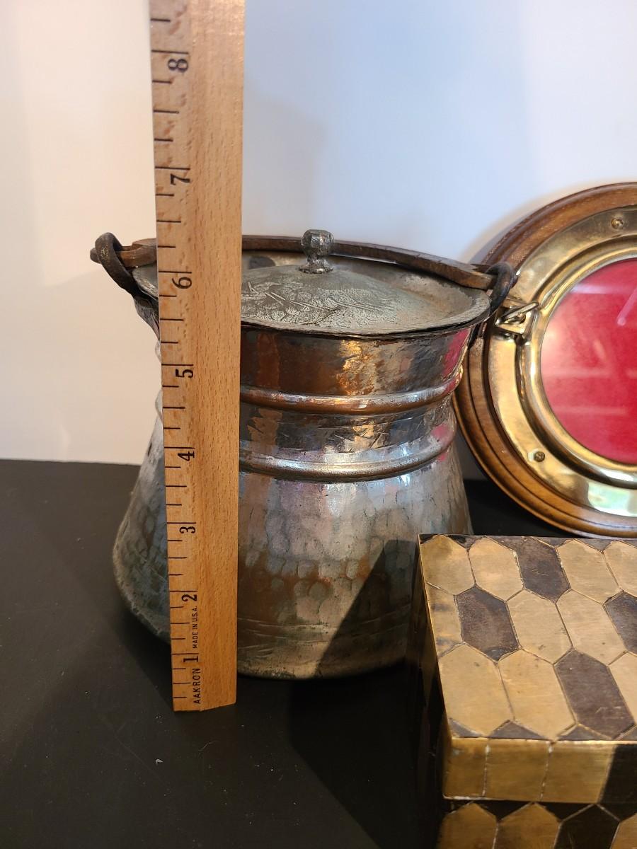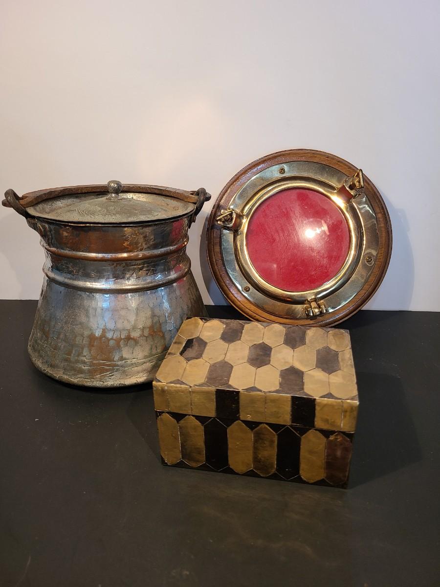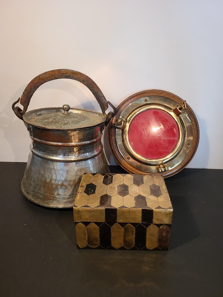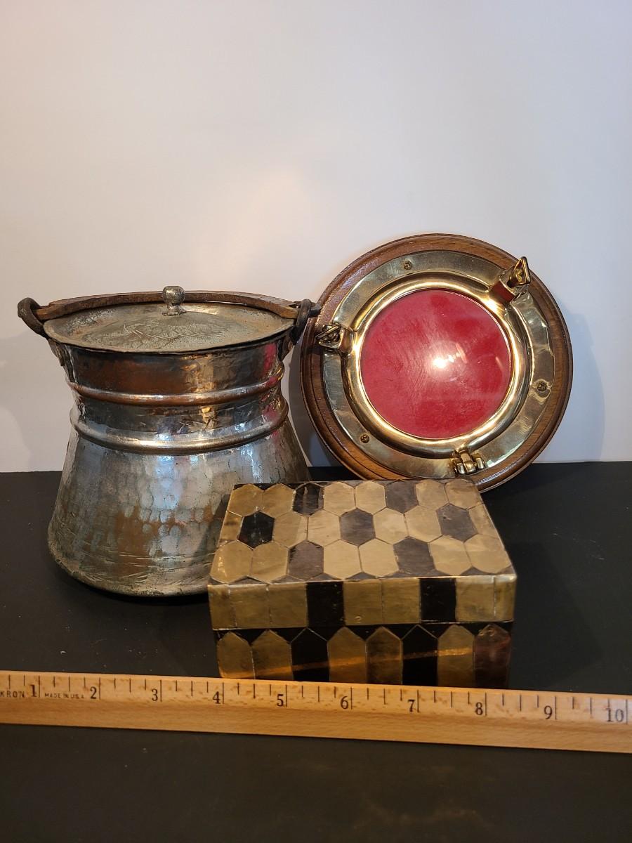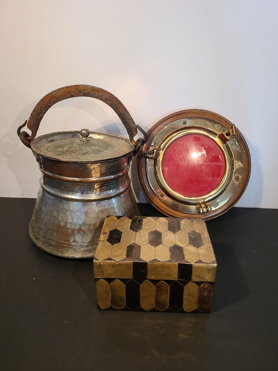 Lot 134: Vintage Dove Tailed Hammered Pot, Metal Box, and Porthole Picture Frame.