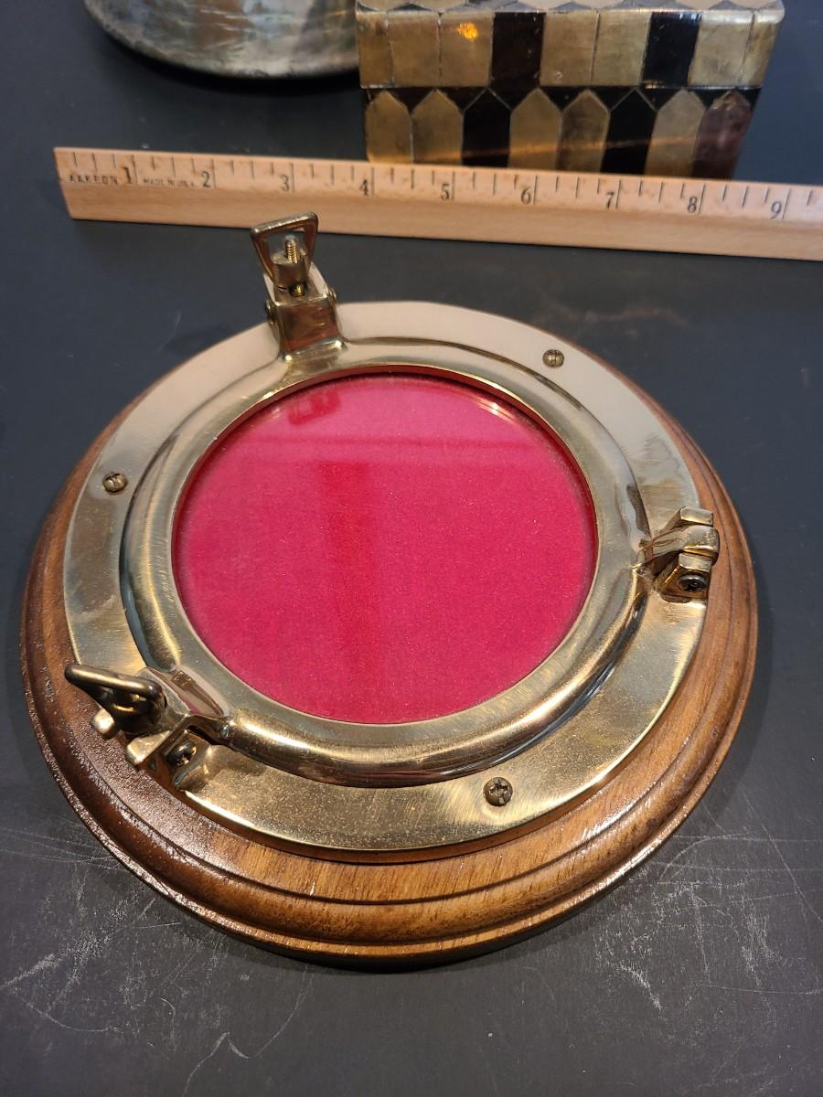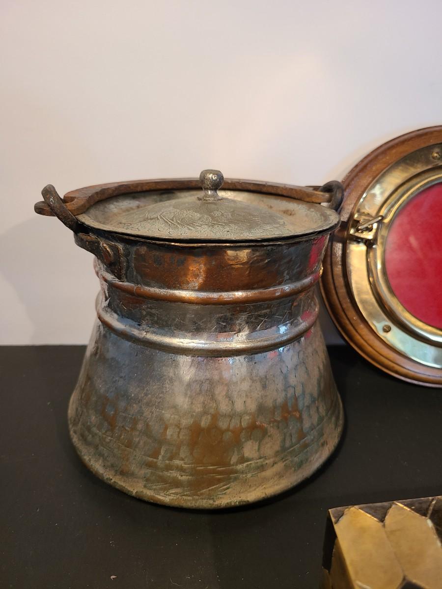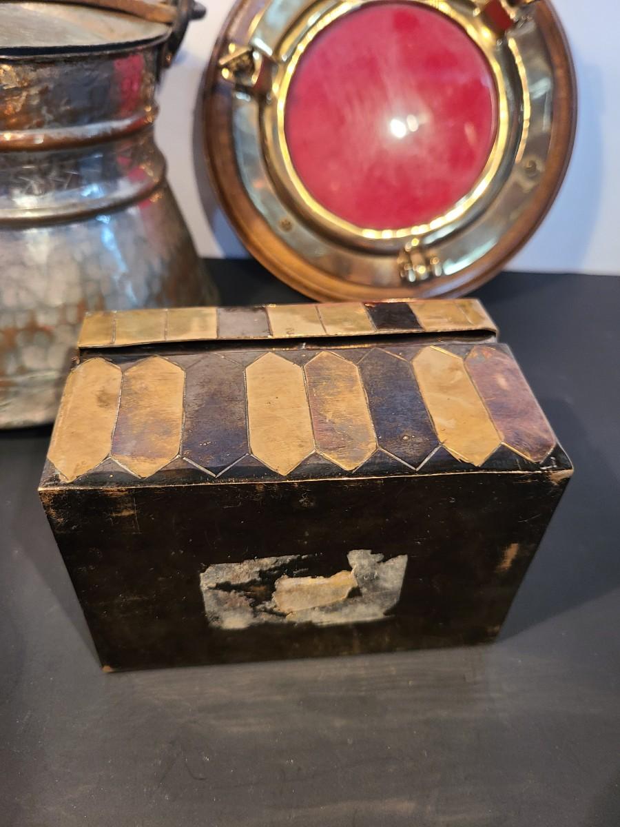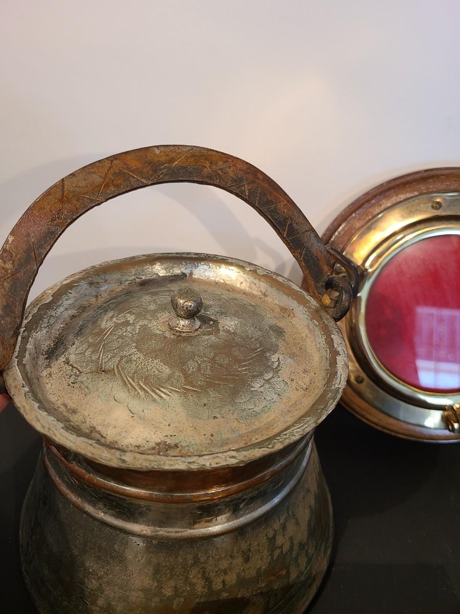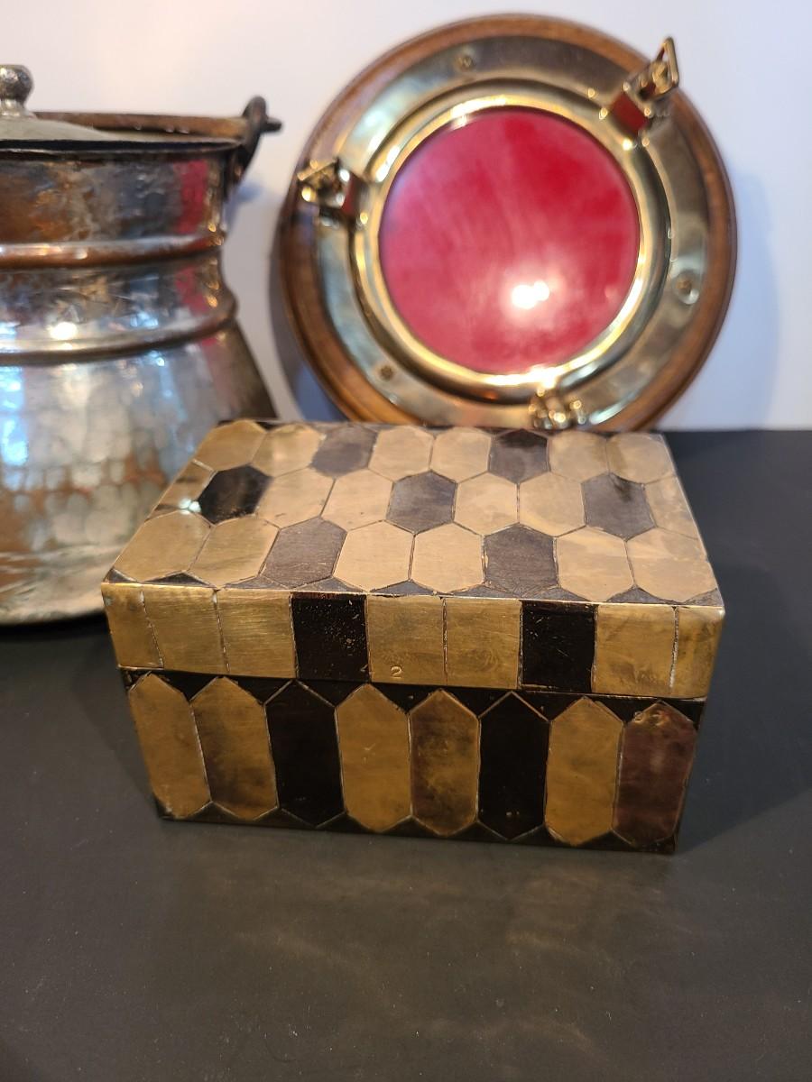 Lot 134: Vintage Dove Tailed Hammered Pot, Metal Box, and Porthole Picture Frame.
