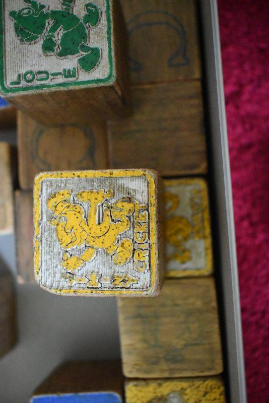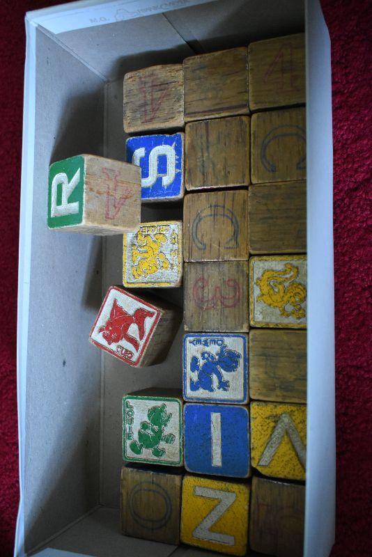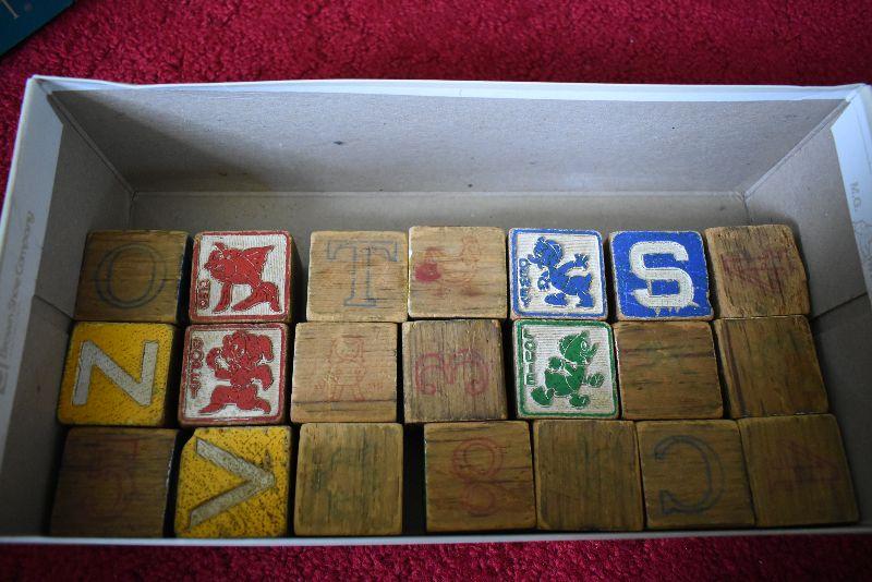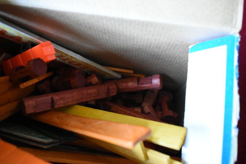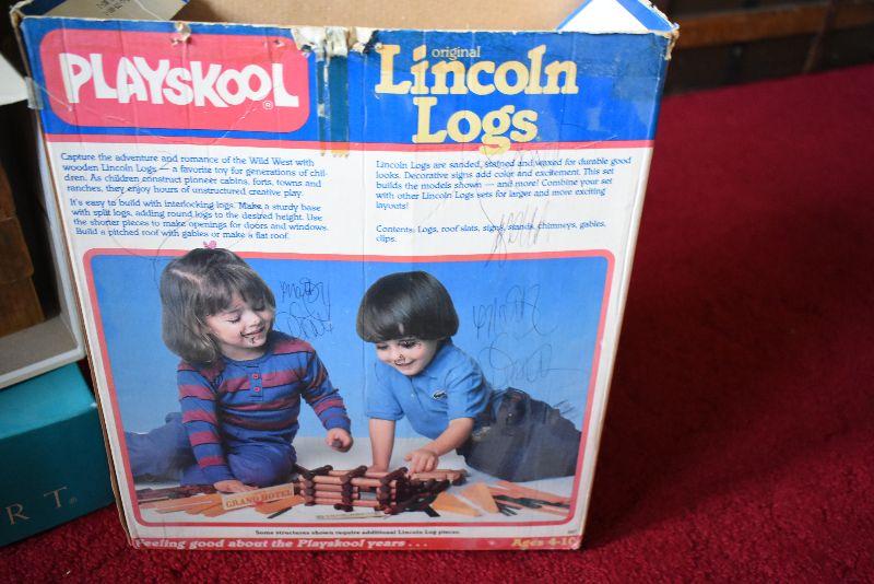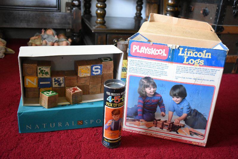 Lincoln Logs in original box, pick up stix, and blocks with alphabet and Disney characters.