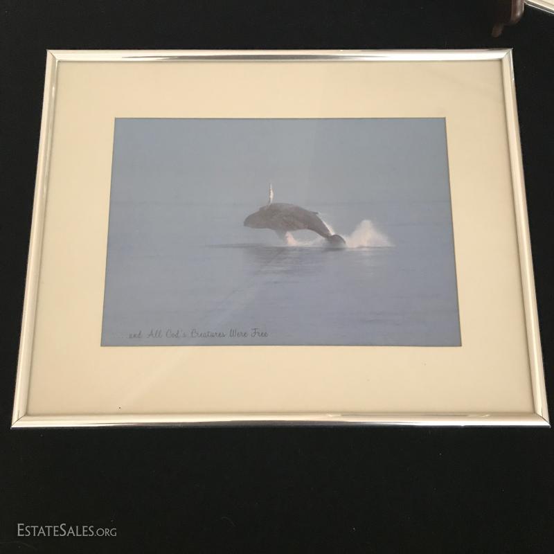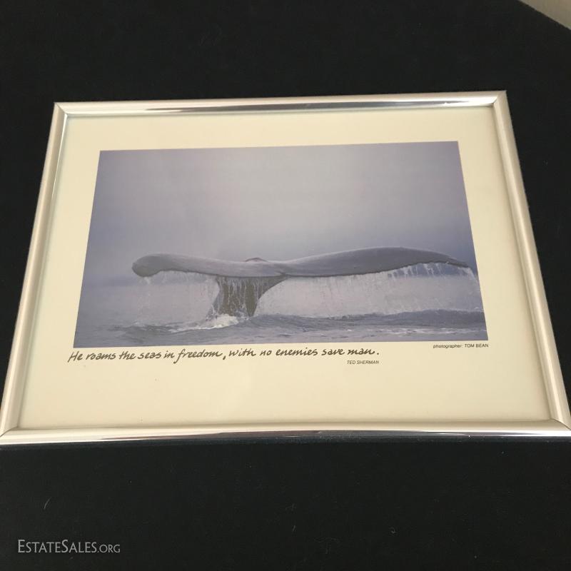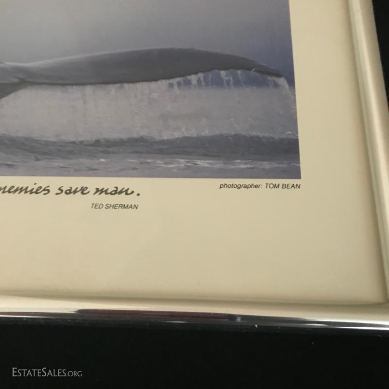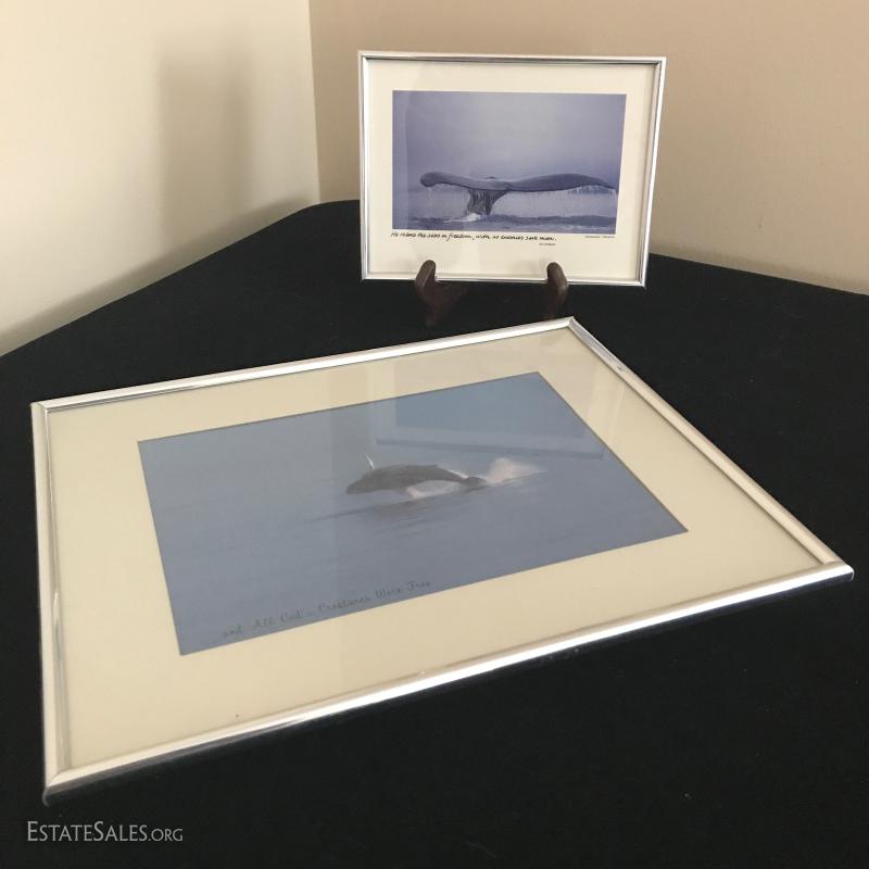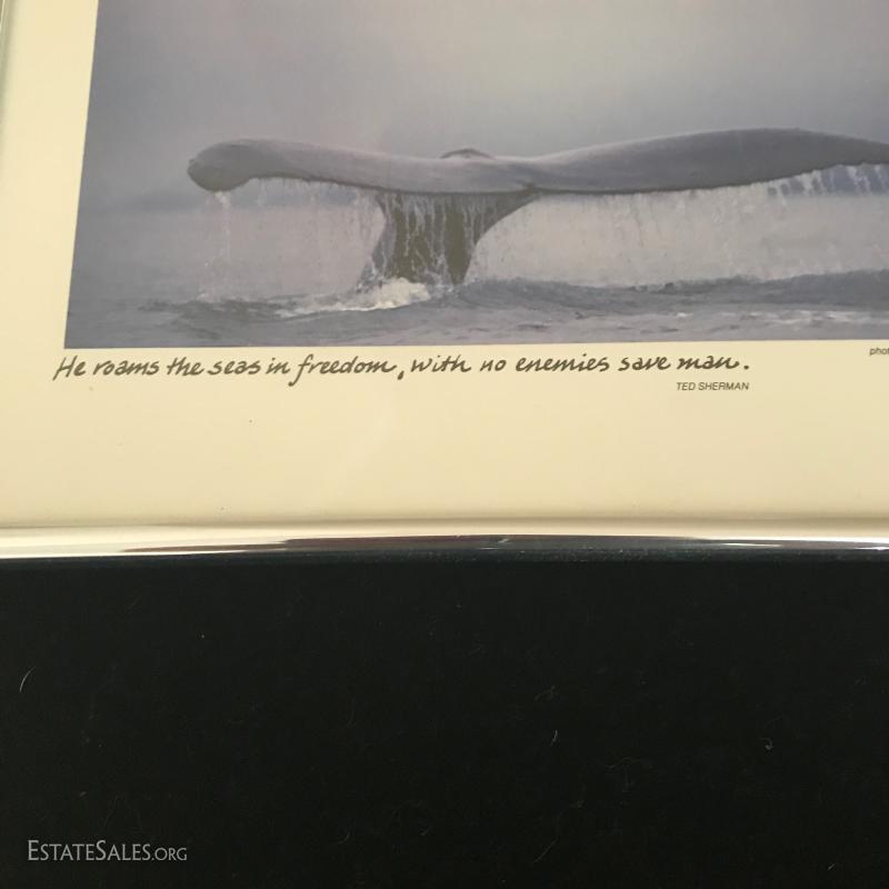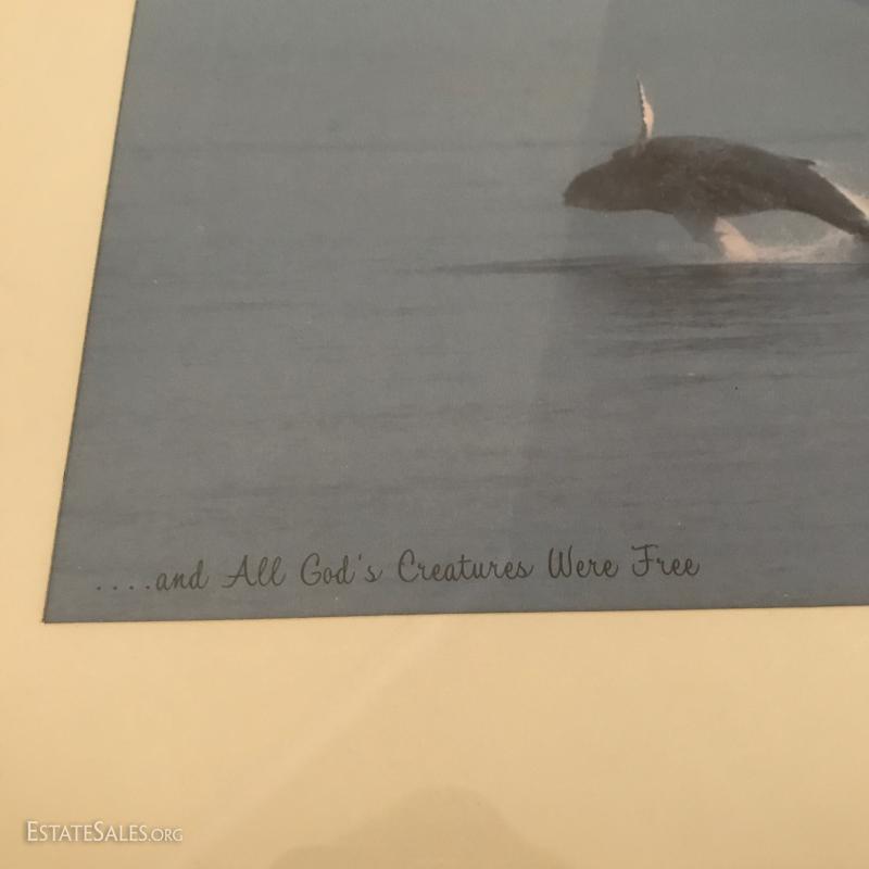 Matching frames and matting of whale photos with hand written quotes. Large measures 14" X 11" with quote "And all God's creatures were free." Small 8" x 6" photo is by Tom Bean and Ted Sherman. Quote reads "He roams the seas in freedom, with no enemies save man."