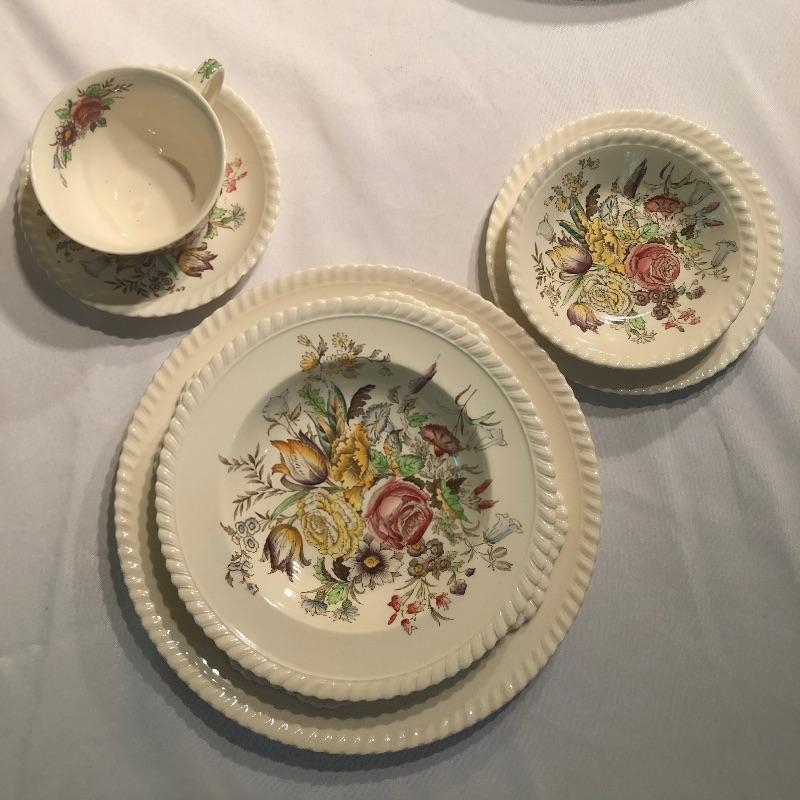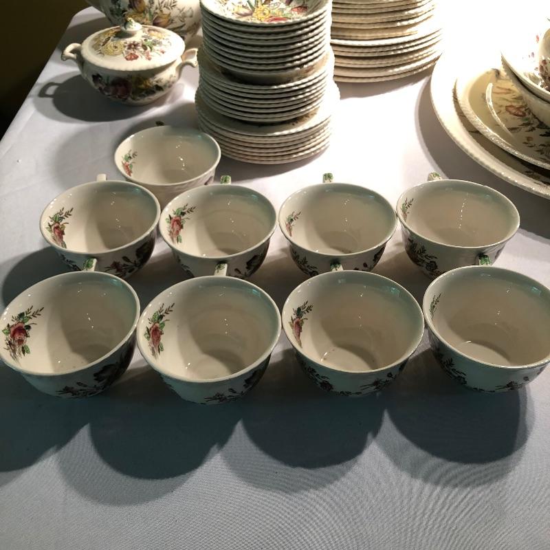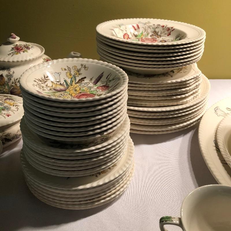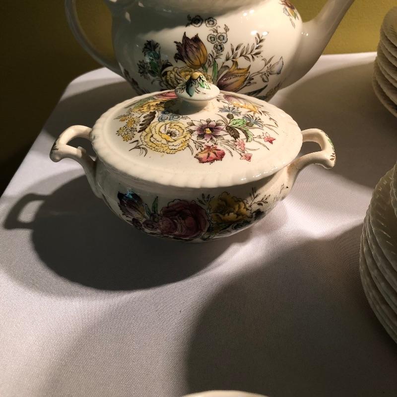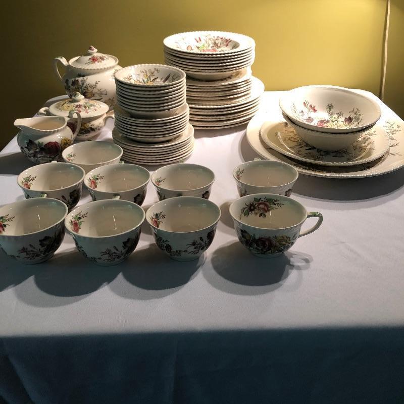 Beautiful Windsor Ware “Garden Bouquet” china set. This lot includes teacups, teapot, sugar bowl with lid, dinner plates (10”), salad plates, soup bowls, dessert plates, tea saucers, appetizer plates, servings bowls, small serving platter and large serving platter (16”). There are 67 total pieces. 8 place settings with extra dessert plate and teacup. Perfect for a fancy dinner with family or friends. Very minimal stains and cracks, most pieces are in pristine shape. Shipping available.