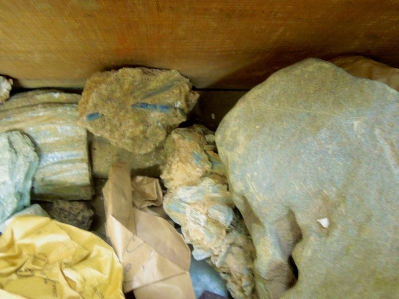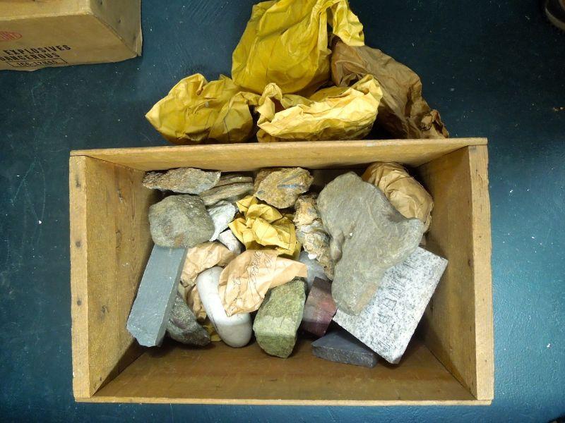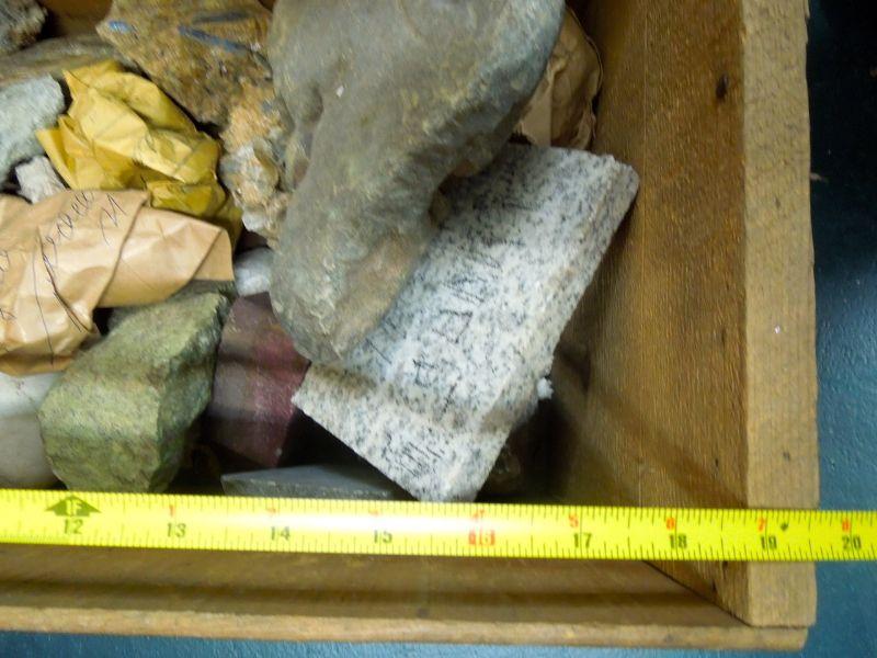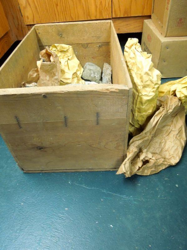 Crate is 20" x 12" and contains many bags of roks, some unopened. Others marked pyrite, pidote in quartz, quartz and calcite and more.