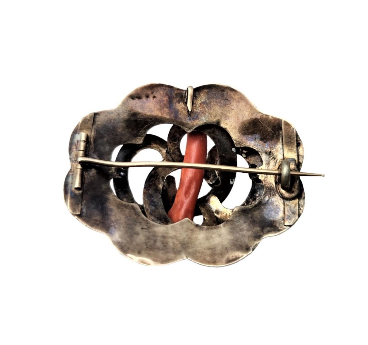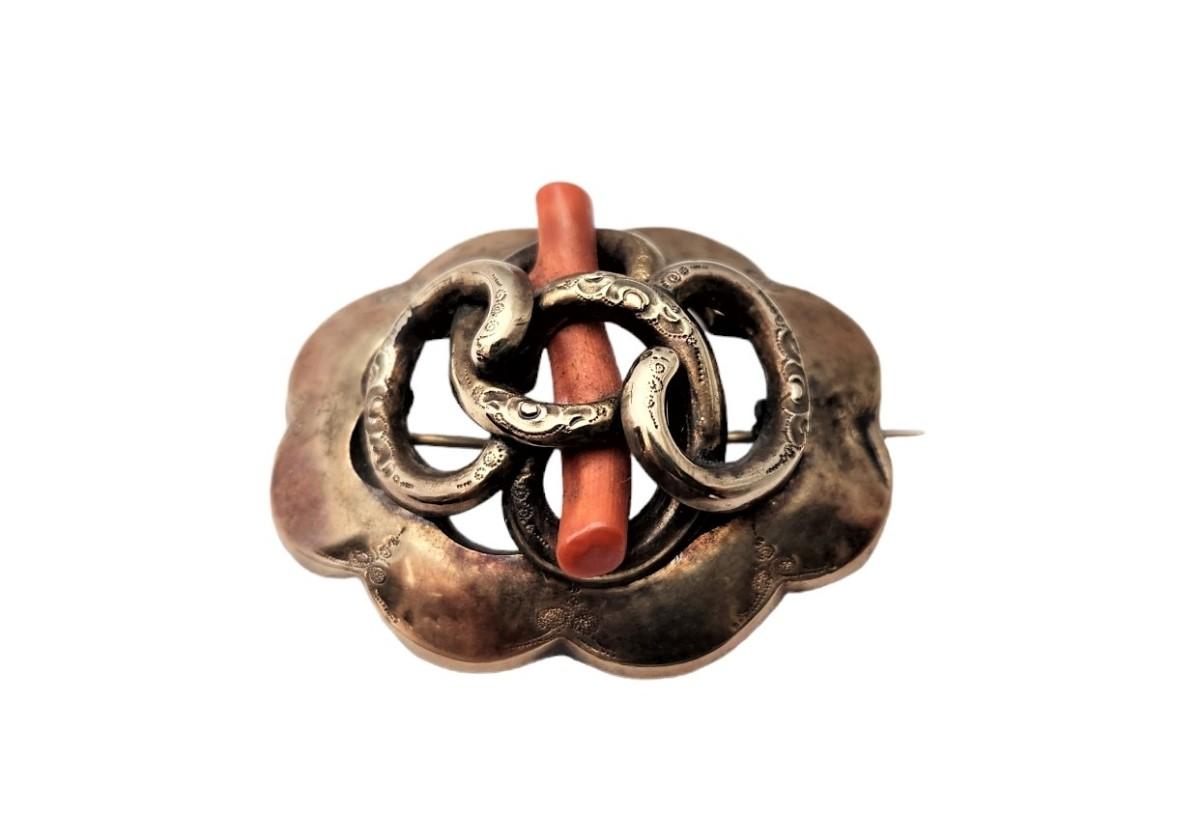 We had this piece tested by our jeweler and it is 10kt gold. Ca. 1870, old style "c" clasp. Note the Red Coral incorporated into the design. It is illegal to harvest this now. Coral was believed to bestow good luck on the wearer and keep away the "Evil Eye." Weighs about 5.7 grams. Price is a little above scrap price.