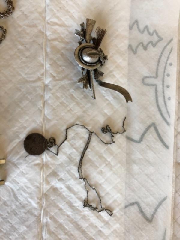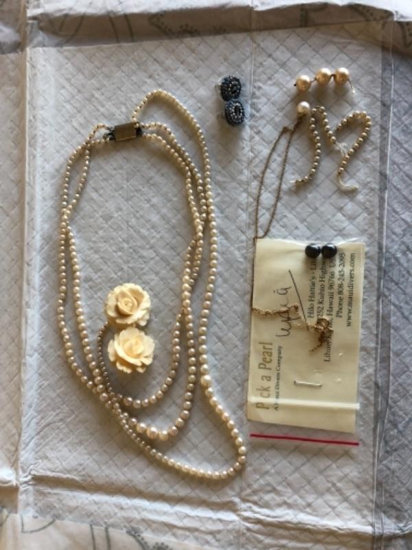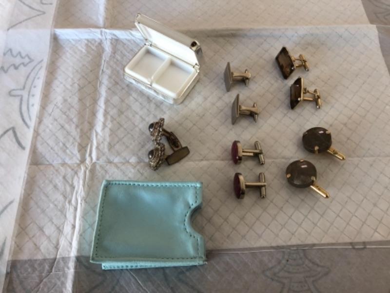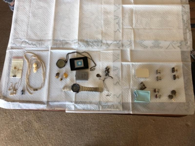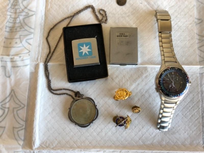 Lot 134U. Cufflinks, earrings, Zippo Maersk Line lighter, chains, pill box, pearl necklace, earrings of bone, flag pins“”$45