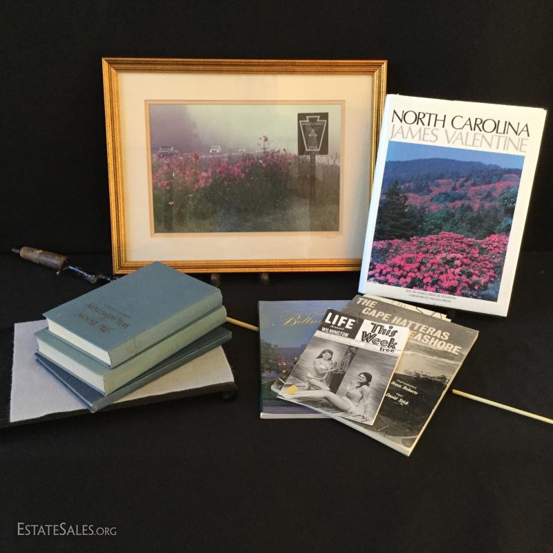 Attention North Carolina lovers... this lot is calling you. Includes several books about various regions in the state as well as a framed photograph by R.W. Agnew (19.5"l x 15") and a vintage fishing pole with a cork handle. Pole needs some work to be able to use. See photos for details. No Shipping. Local pick up only in Flat Rock, NC.