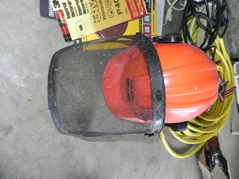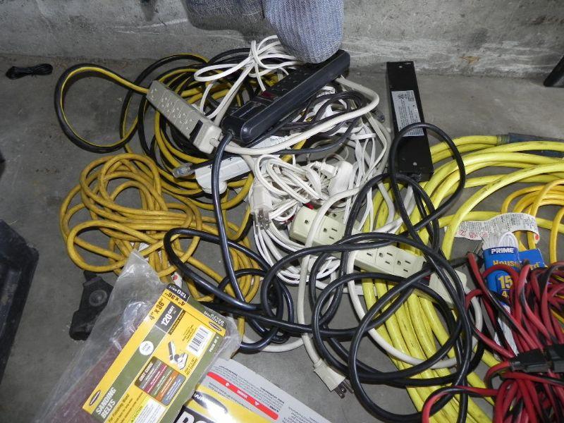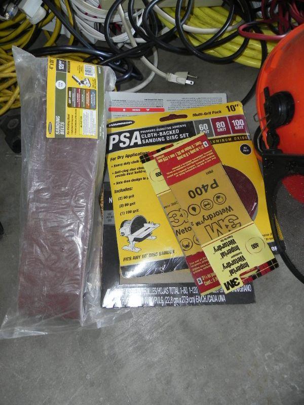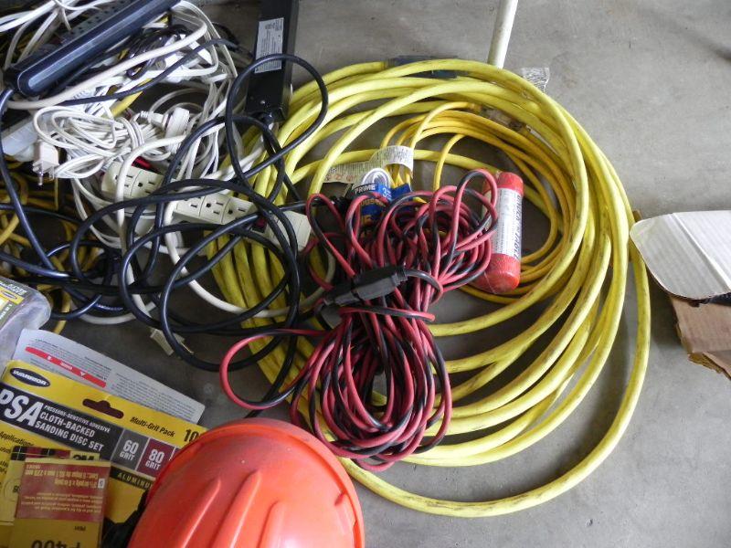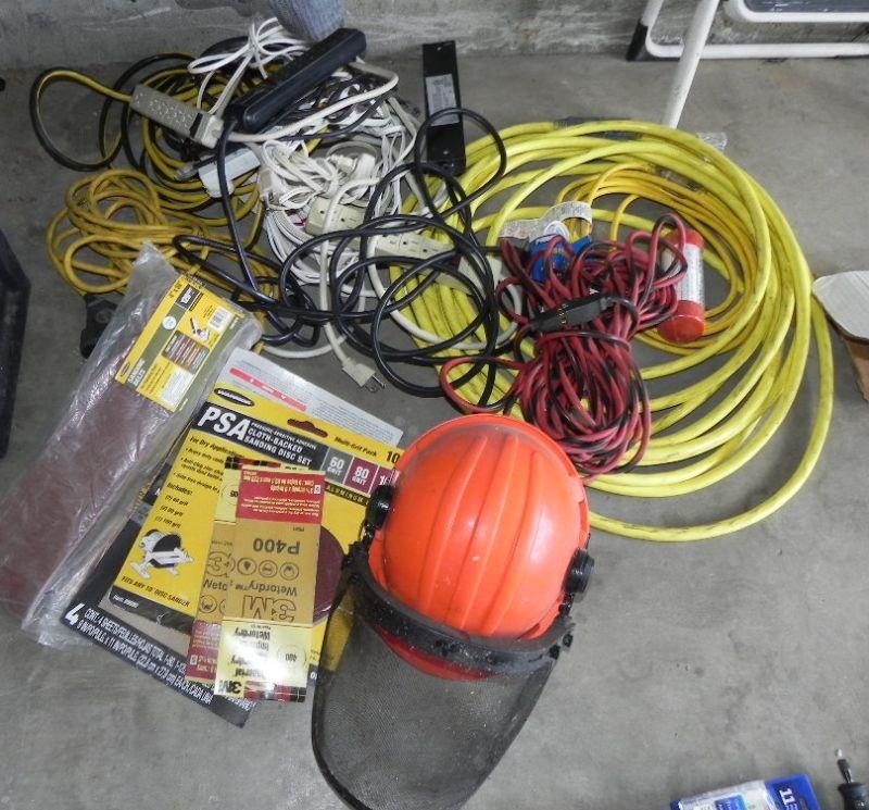 SEVERAL EXTENSION CORDS, SURGE PROTECTORS, SAND PAPER & SAFETY HAT WITH EAR & EYE PROTECTION