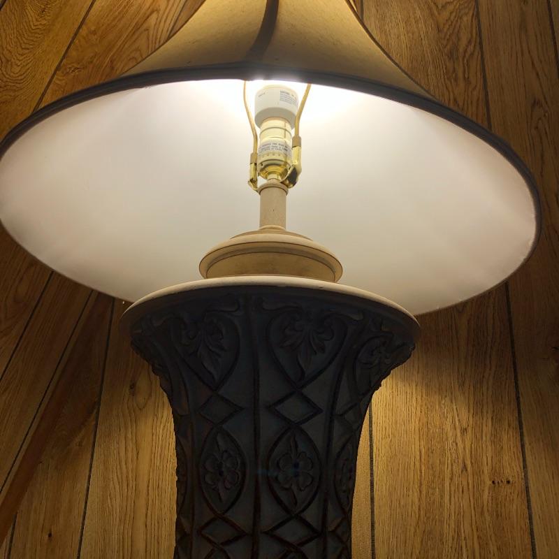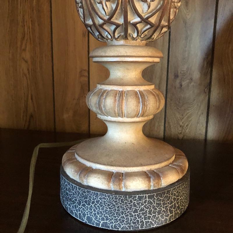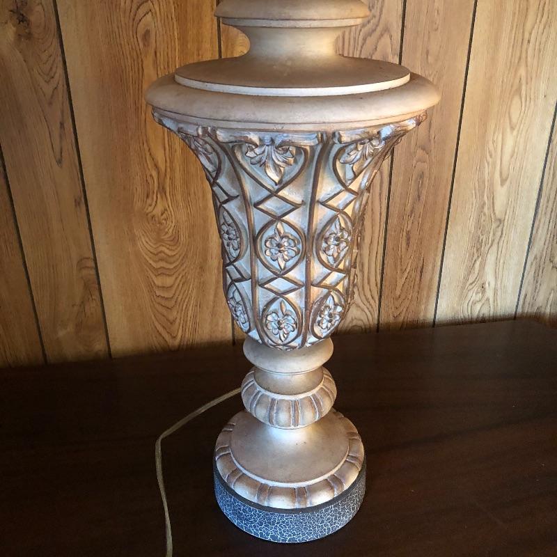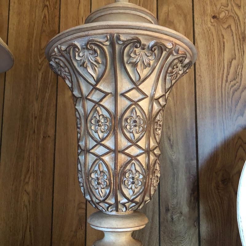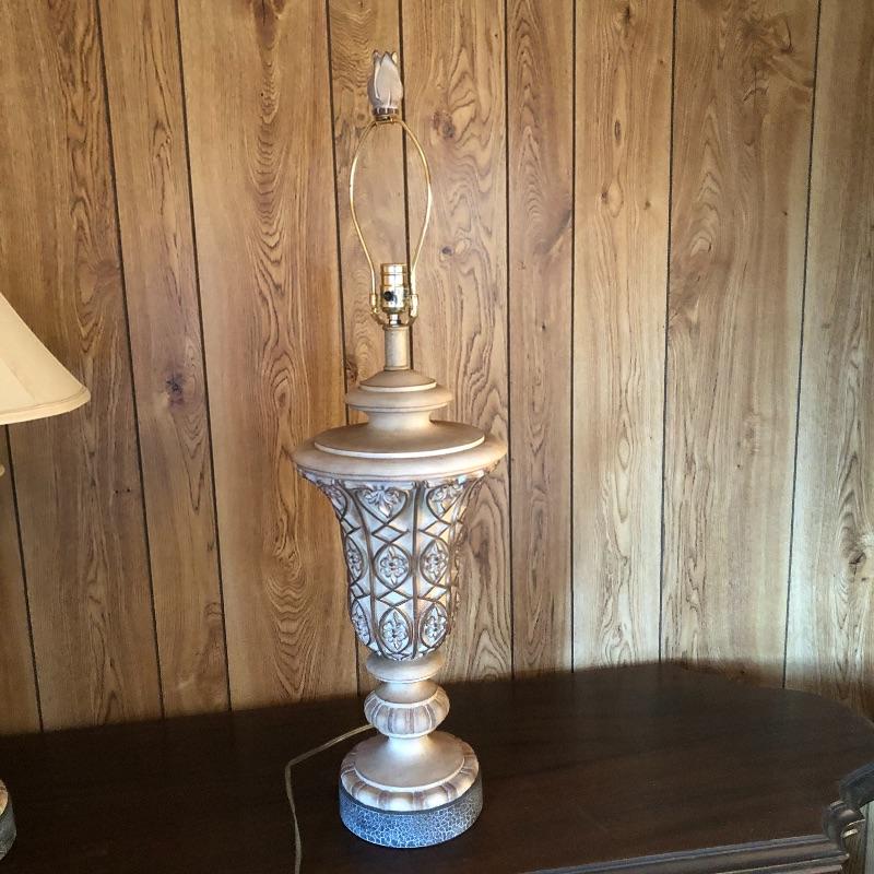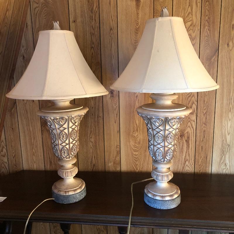 Add a touch of elegance to your home with these unique and beautiful lamps. These matching ornate lamps measure 36” high and approximately 11” at the widest part of the base. Lamp shades are included. Lights turned on when plugged in. Local pick up only.