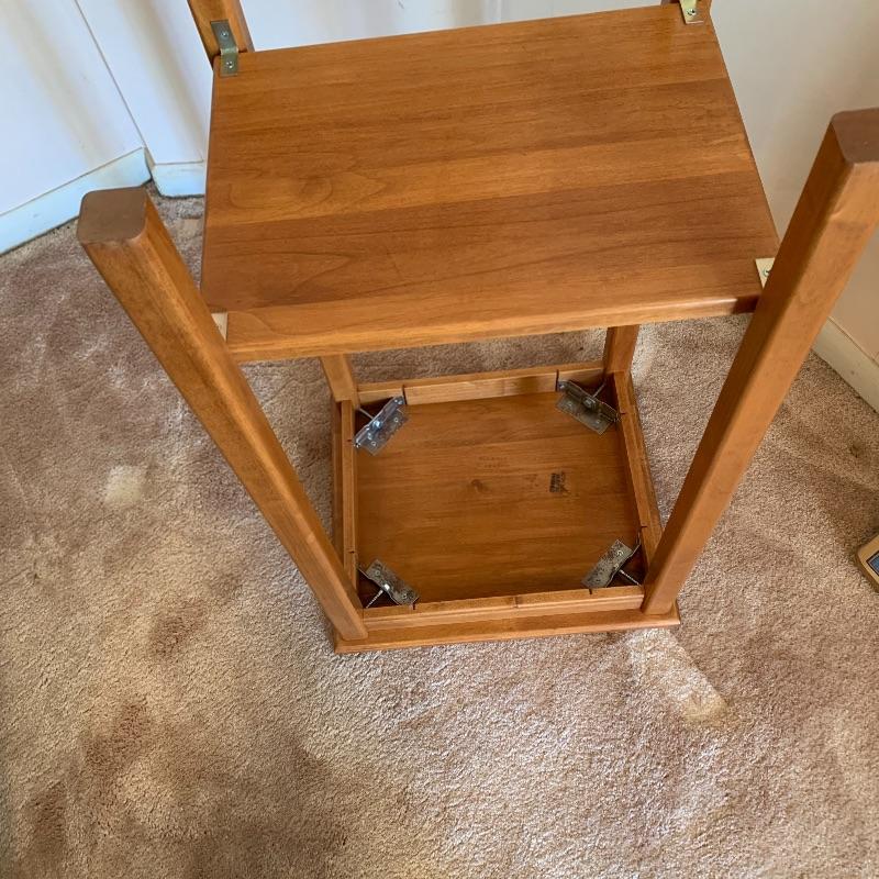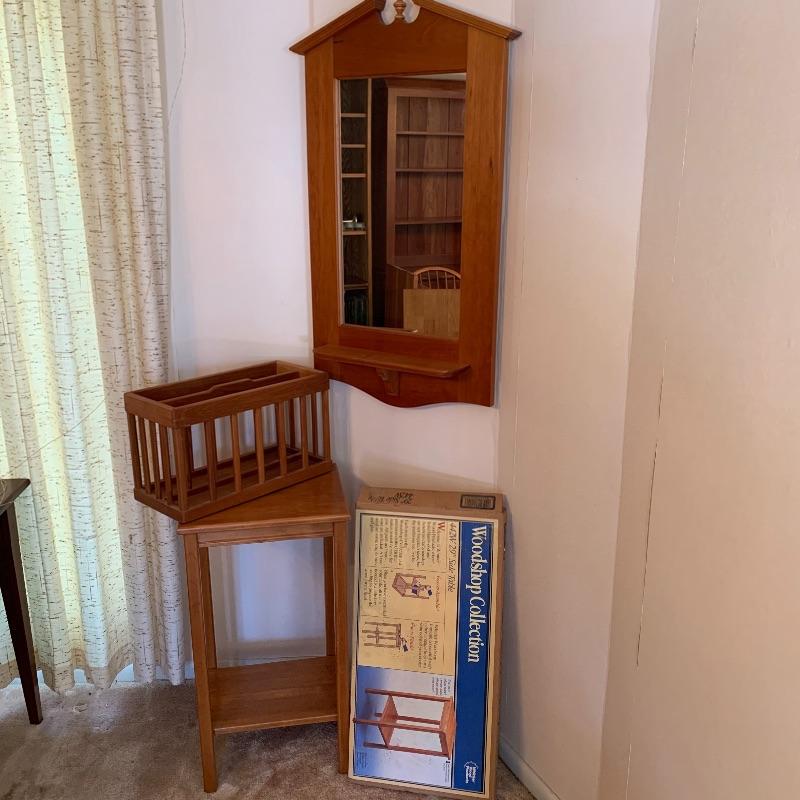 Spruce up your furnishings with these beautiful wood pieces. Lot 135 includes a wood framed mirror that measures approximately 21” x 38”. Also two end tables that are 14” square and 29” tall. ( one table is unassembled, see pic) Magazine rack is teak Good Wood brand, and measures 18” x 9🔔 and is 11” tall. All pieces are in great condition. Local pick up only.