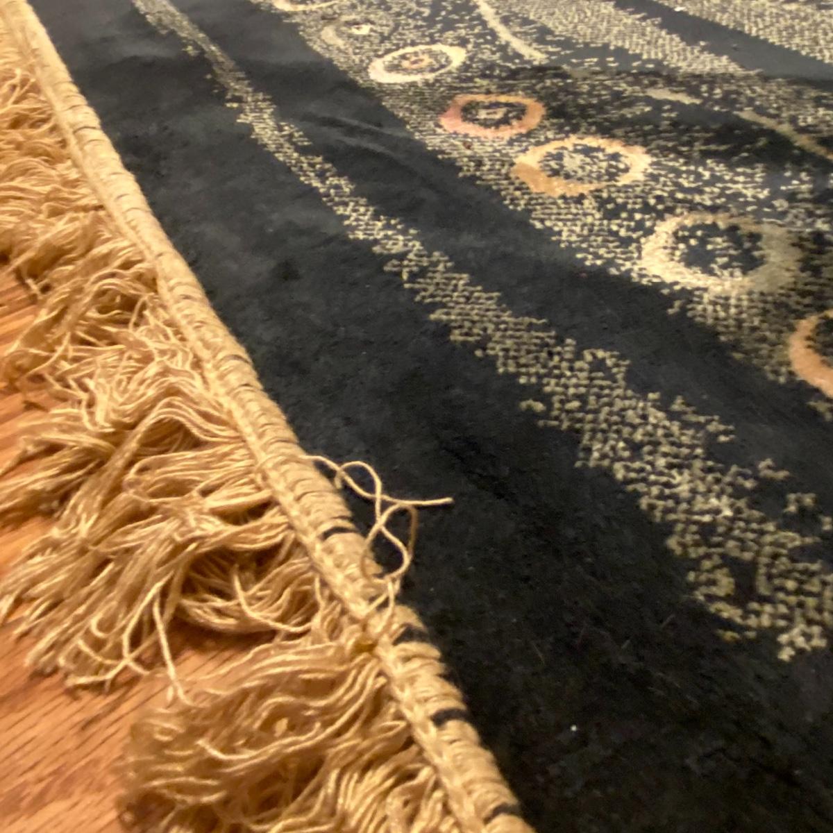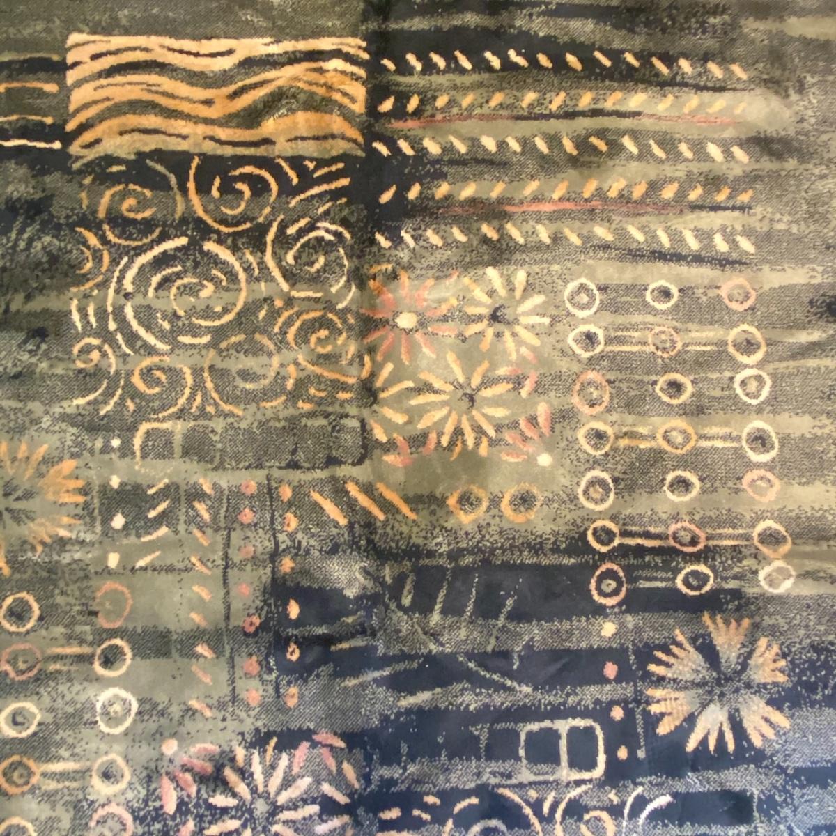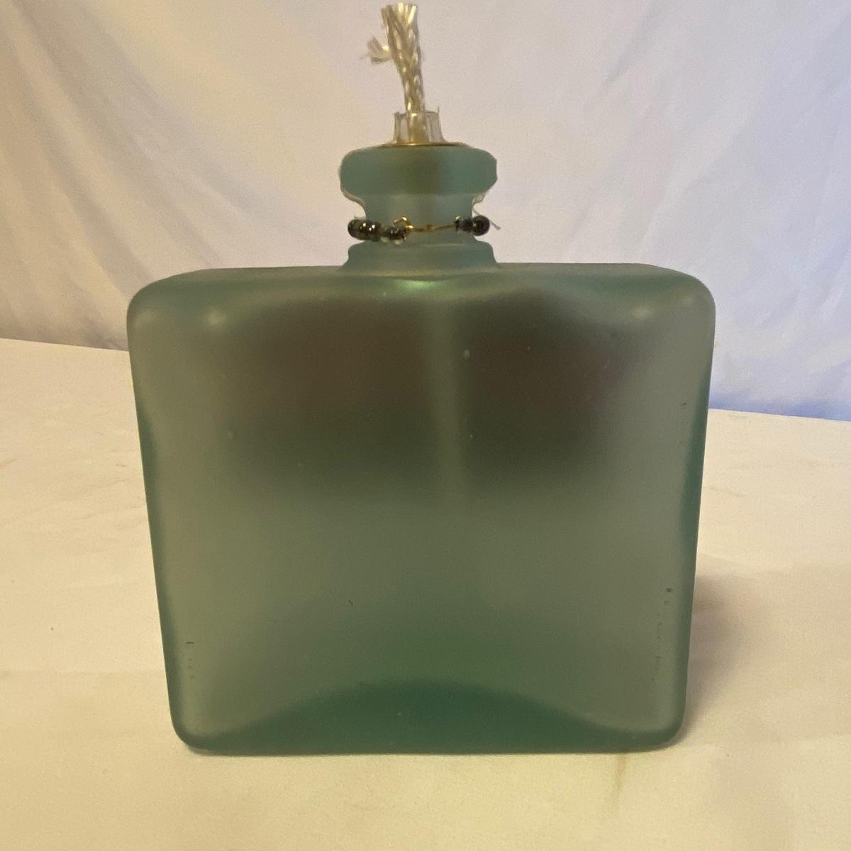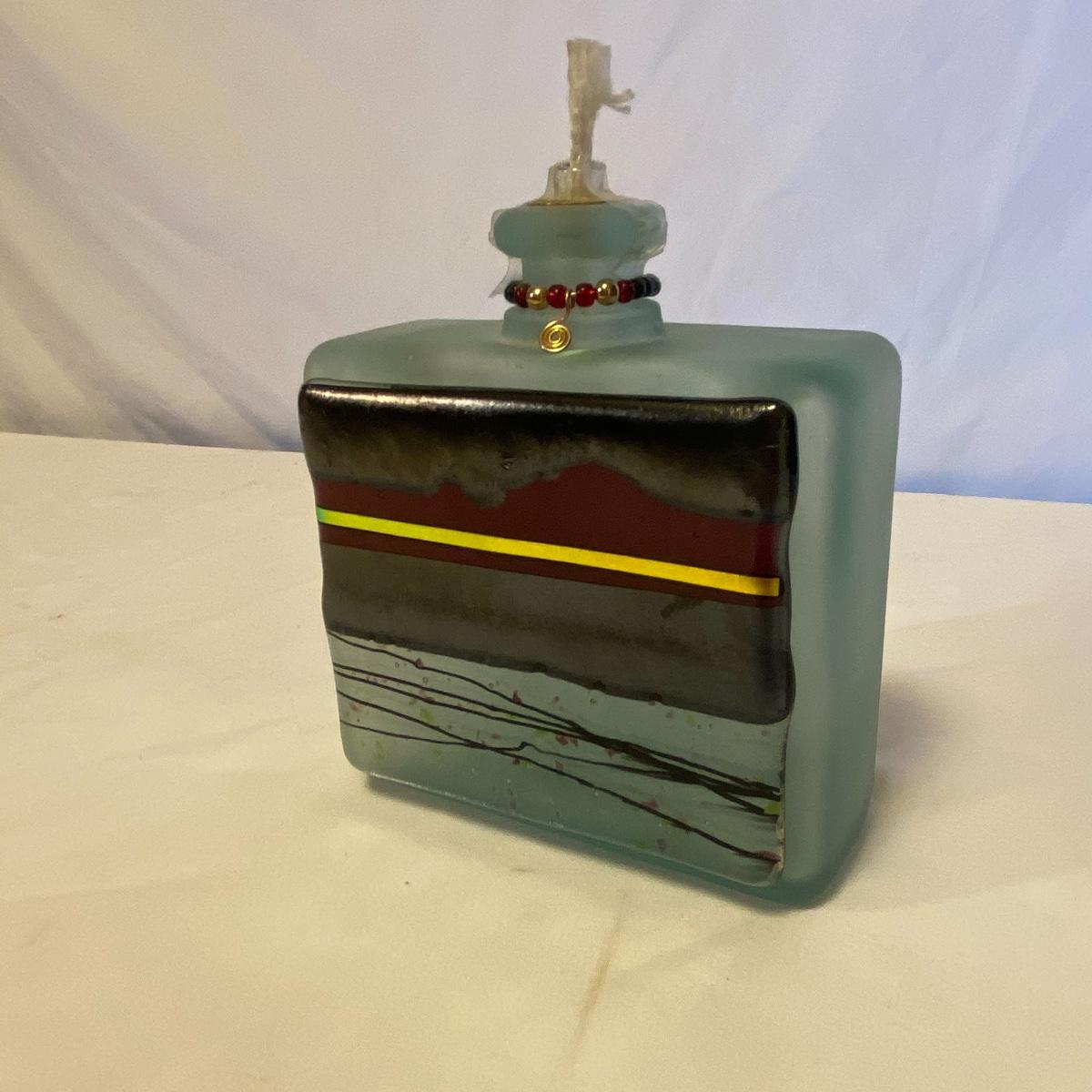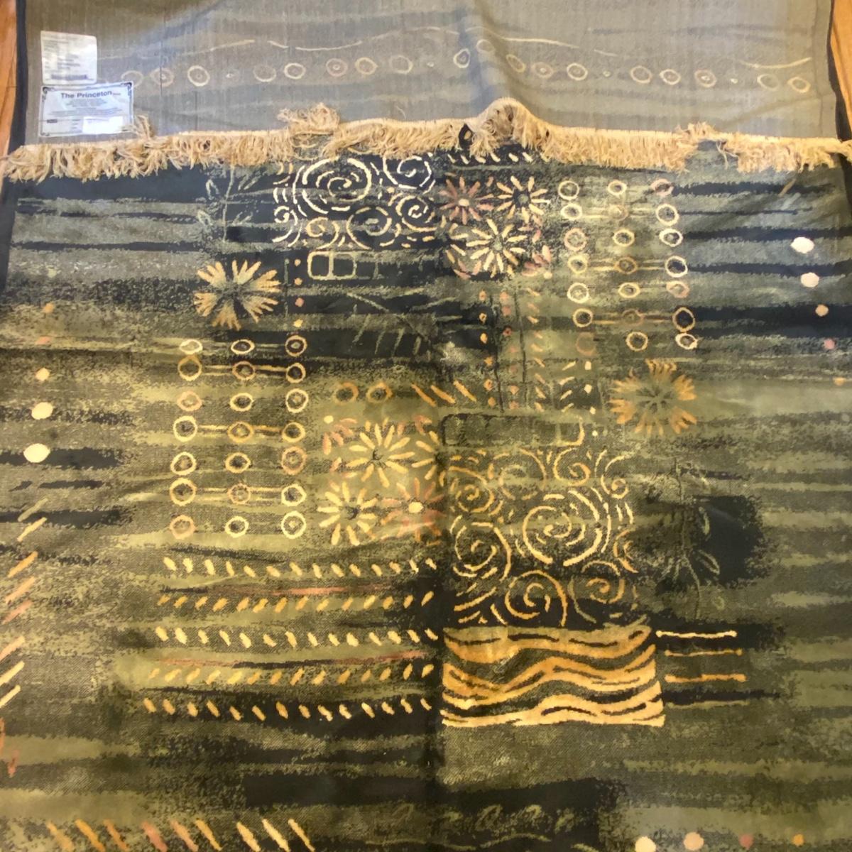 A beautiful blue-designed rug that measures 5'3"x7'7' has frayed ends and fun floral designs and shapes. See photos for close-up details. Lot also includes wall art measuring 12”x12’ and a small oil lamp that stand 7”tall. See photos. Local pickup only.