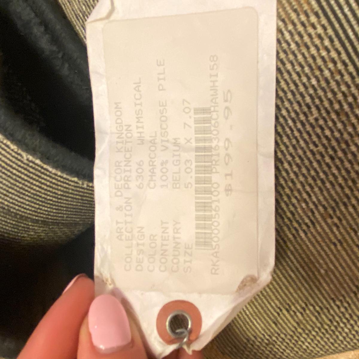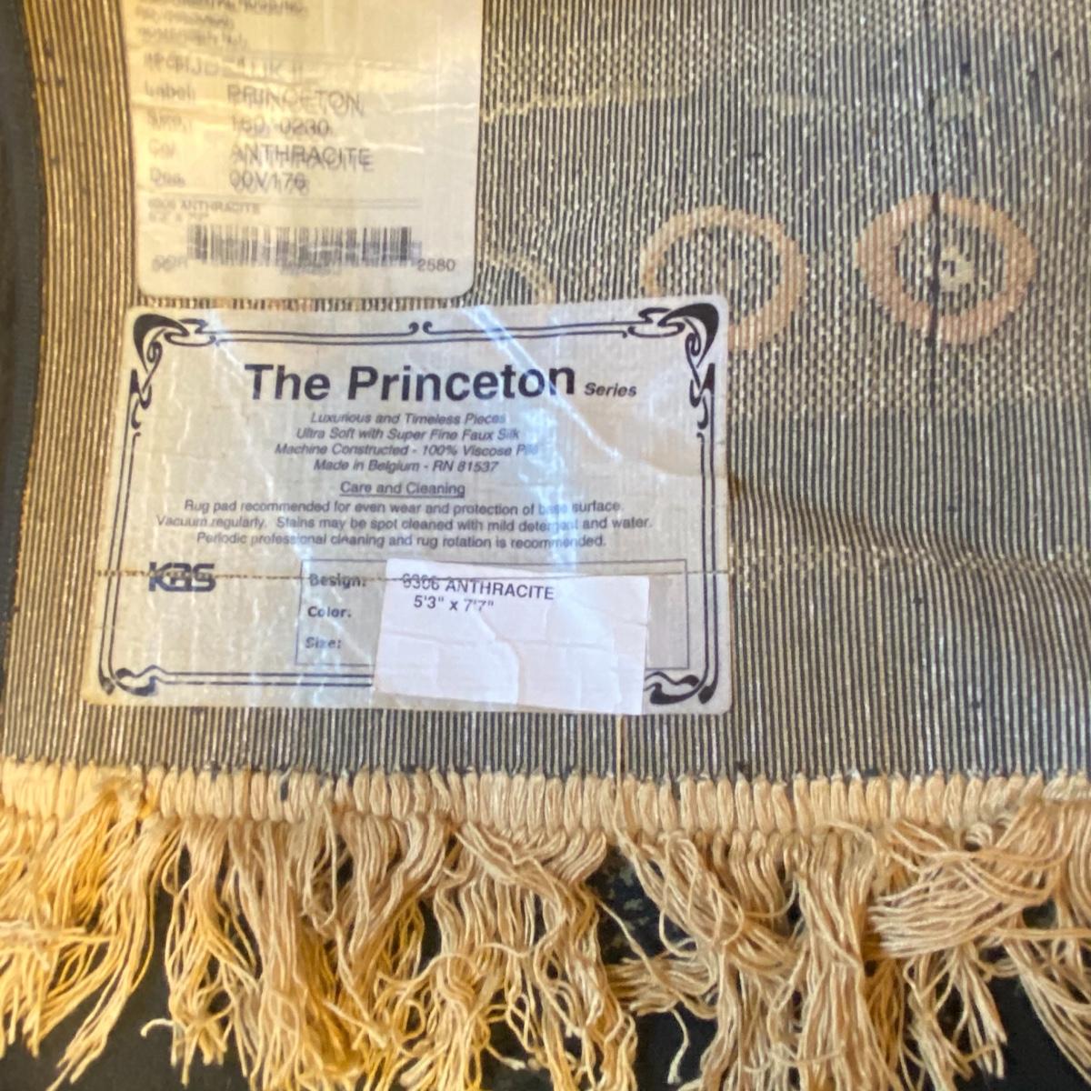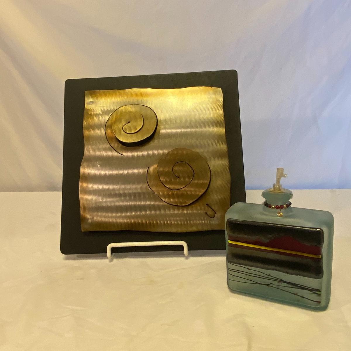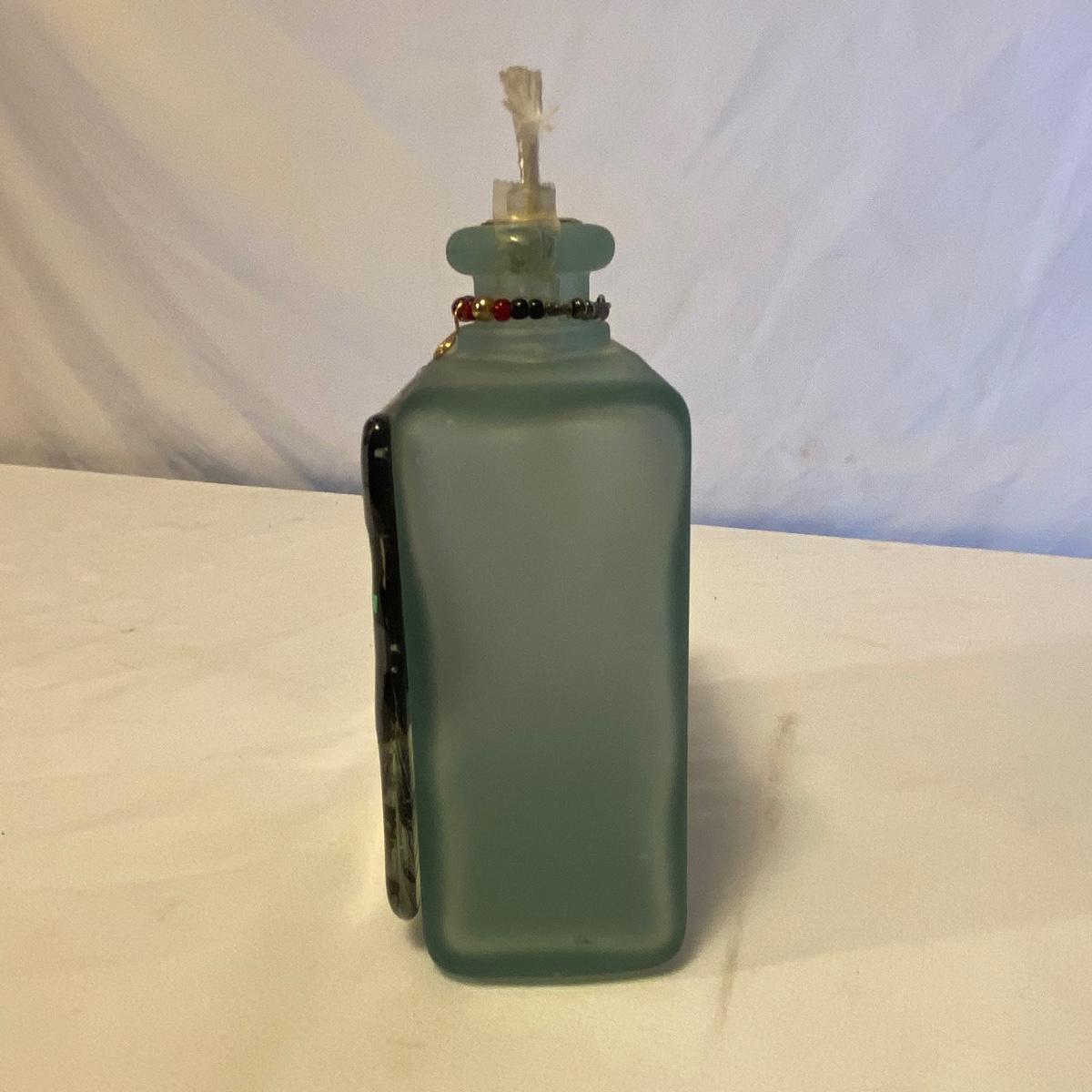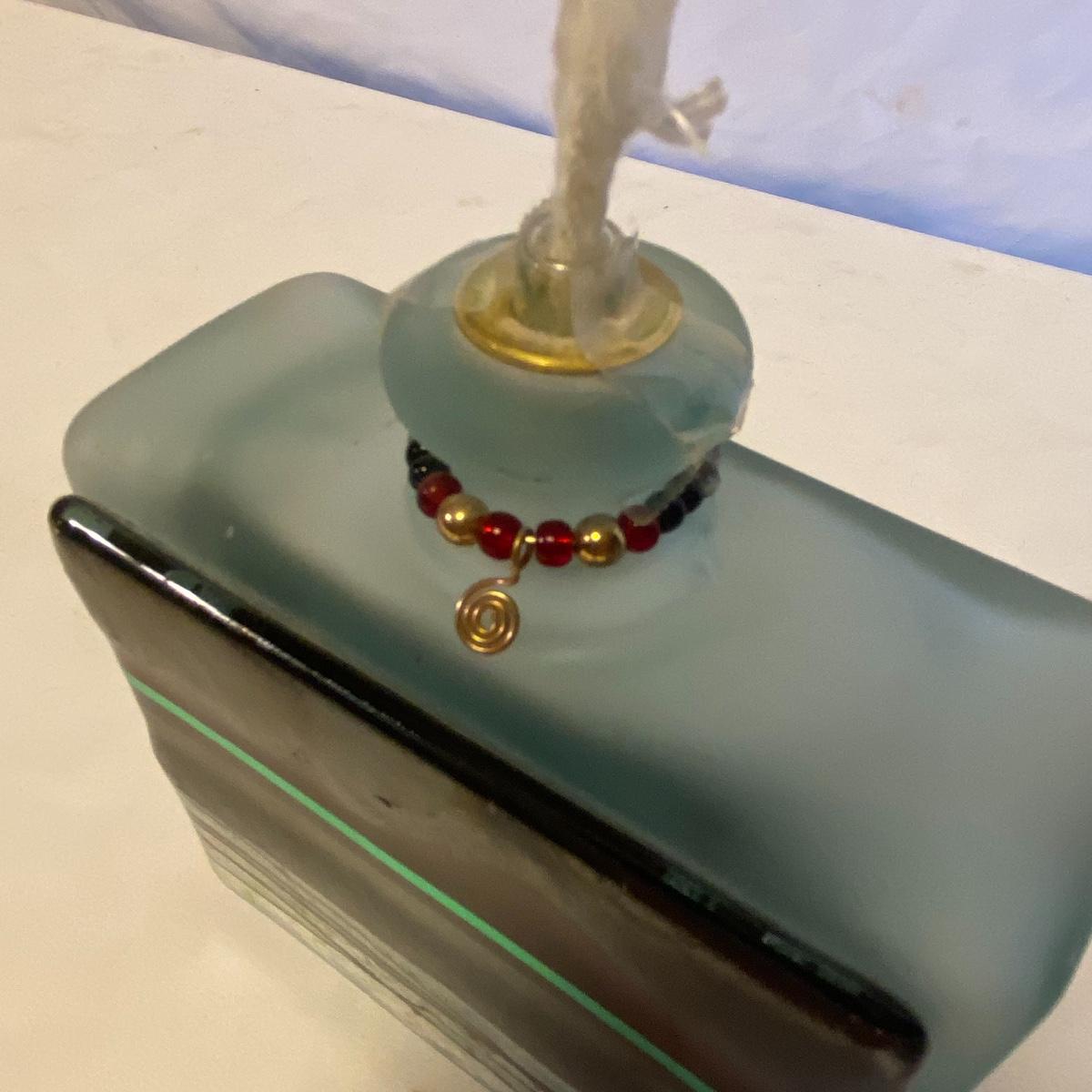 A beautiful blue-designed rug that measures 5'3"x7'7' has frayed ends and fun floral designs and shapes. See photos for close-up details. Lot also includes wall art measuring 12”x12’ and a small oil lamp that stand 7”tall. See photos. Local pickup only.