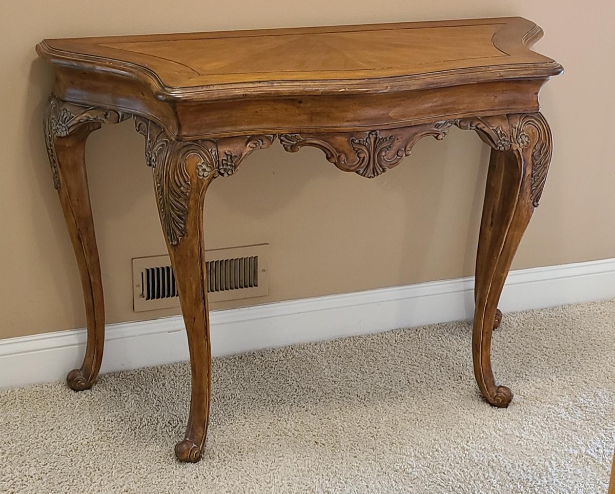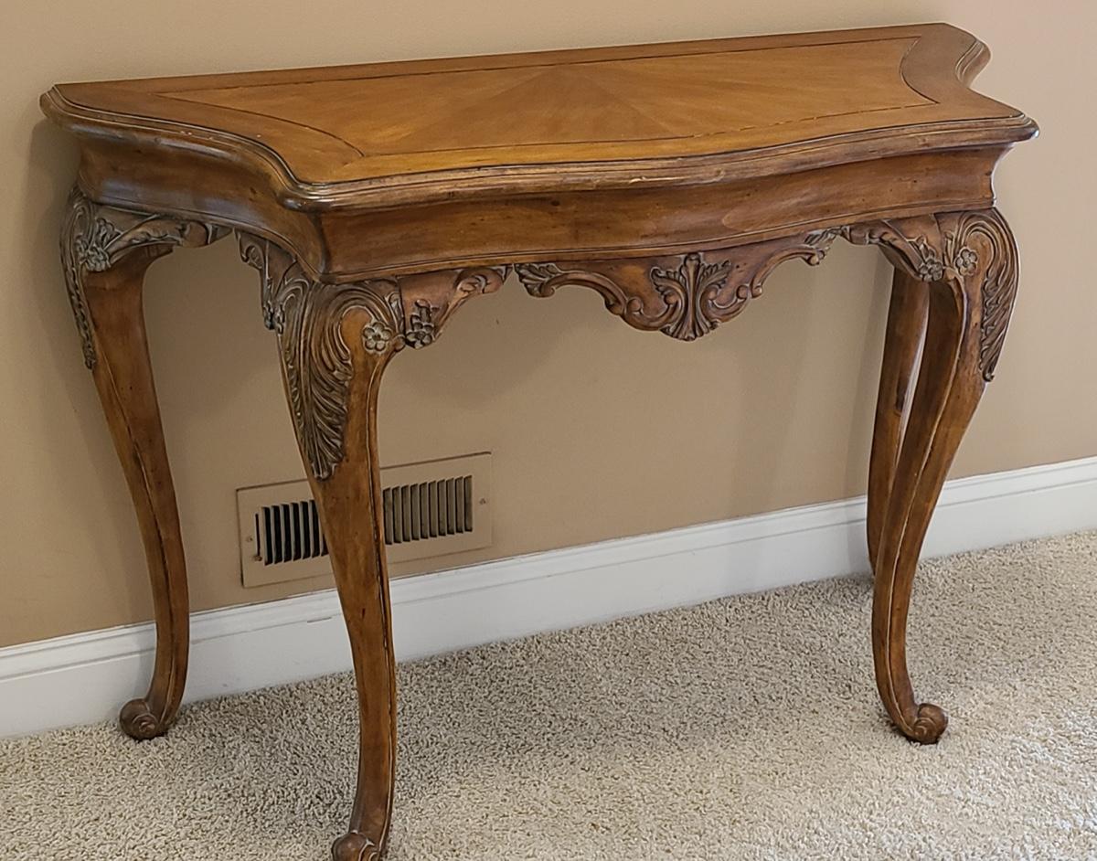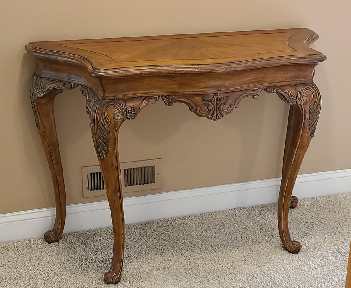 Beautiful carved legs, and gorgeous wood top, this would look amazing as an entryway table, but was used as an accent table with mirror over in hallway. Ready for a new home. Check out all of the details! 49x20x34 Please see all pictures for content of the lot, condition of the lot, and measurements if taken. Pictures are the best representation of the items listed and items are untested unless indicated in description. Thank you for looking and have fun bidding!