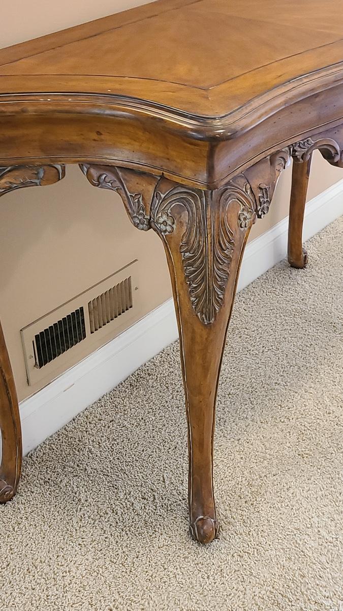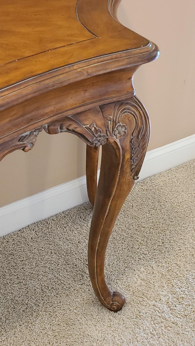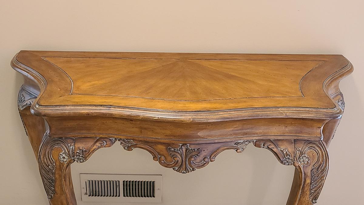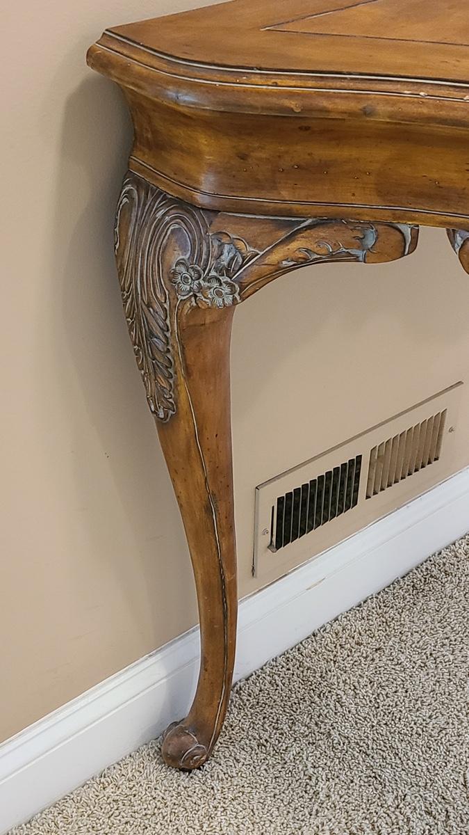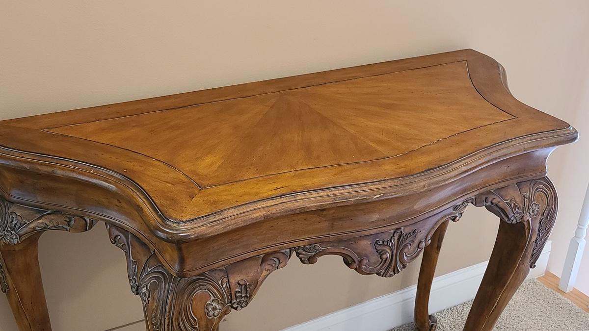 Beautiful carved legs, and gorgeous wood top, this would look amazing as an entryway table, but was used as an accent table with mirror over in hallway. Ready for a new home. Check out all of the details! 49x20x34 Please see all pictures for content of the lot, condition of the lot, and measurements if taken. Pictures are the best representation of the items listed and items are untested unless indicated in description. Thank you for looking and have fun bidding!