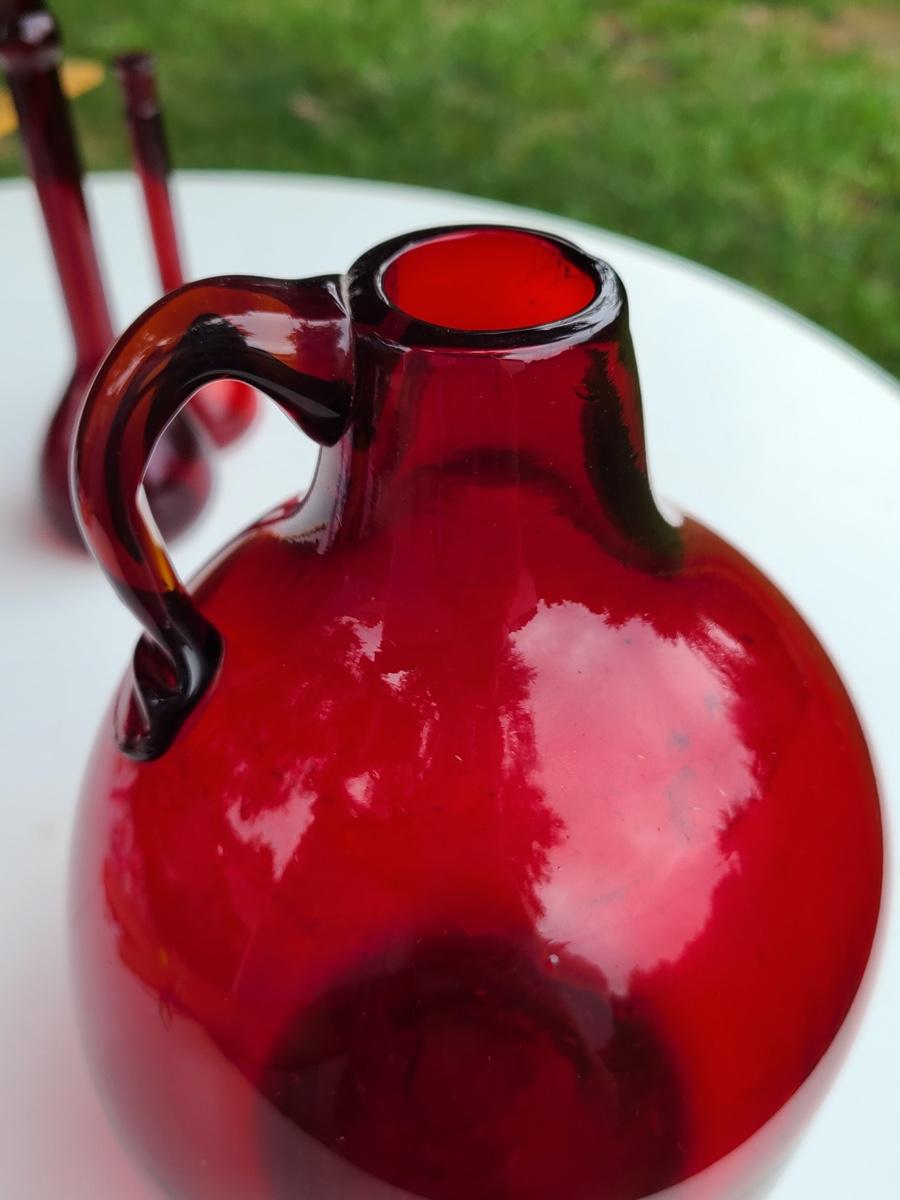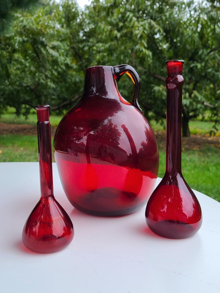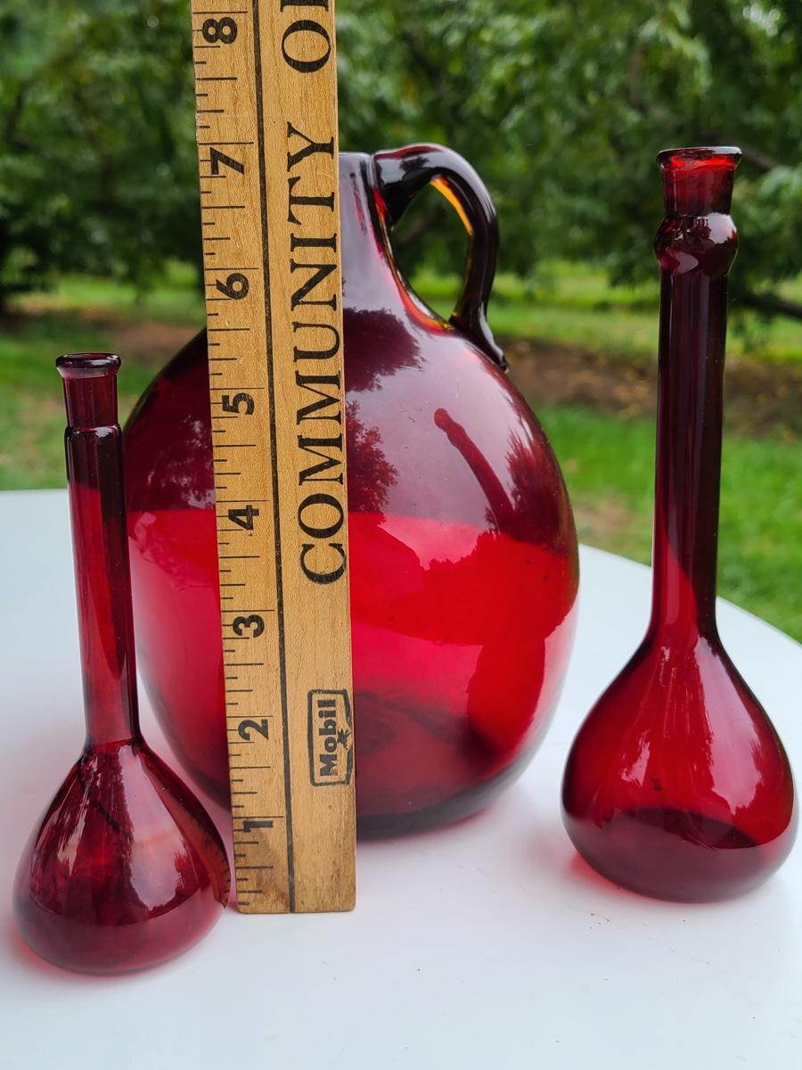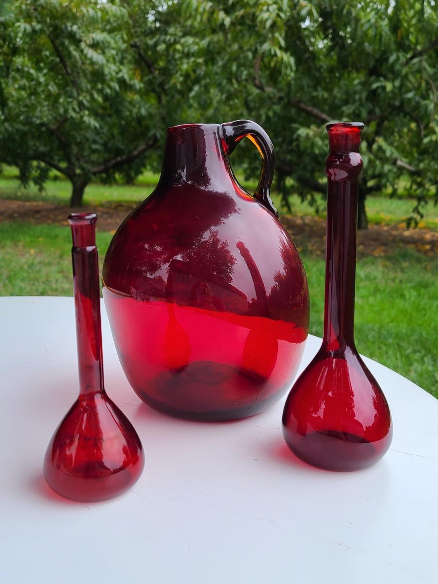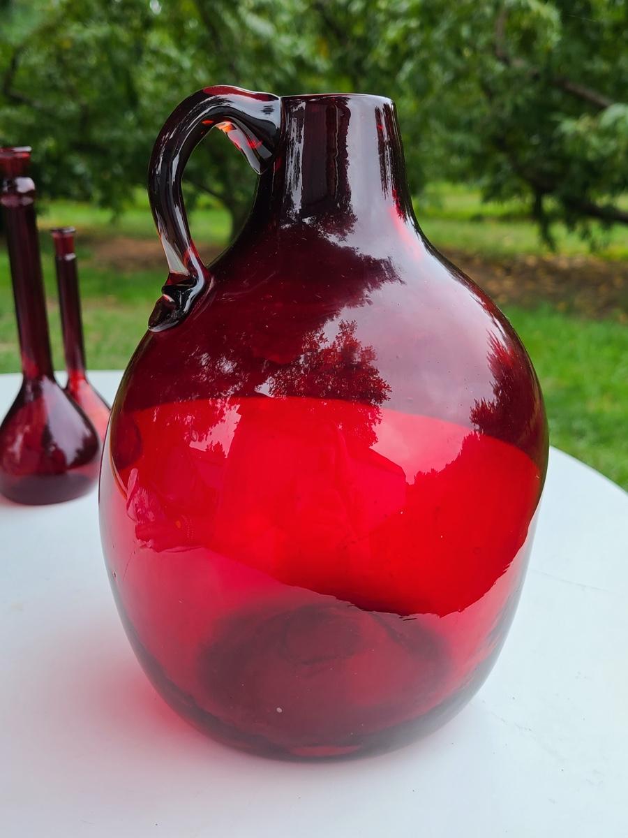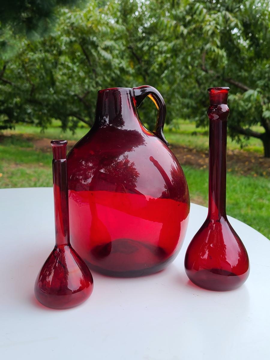 Lot 135: Antique/Vintage Ruby Red Hand Blown Glass Whiskey Pitcher and Flasks