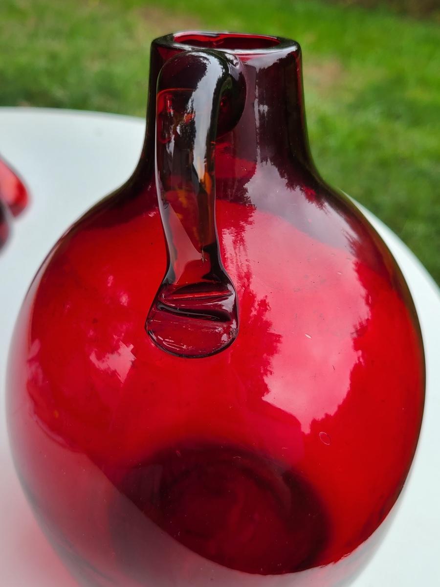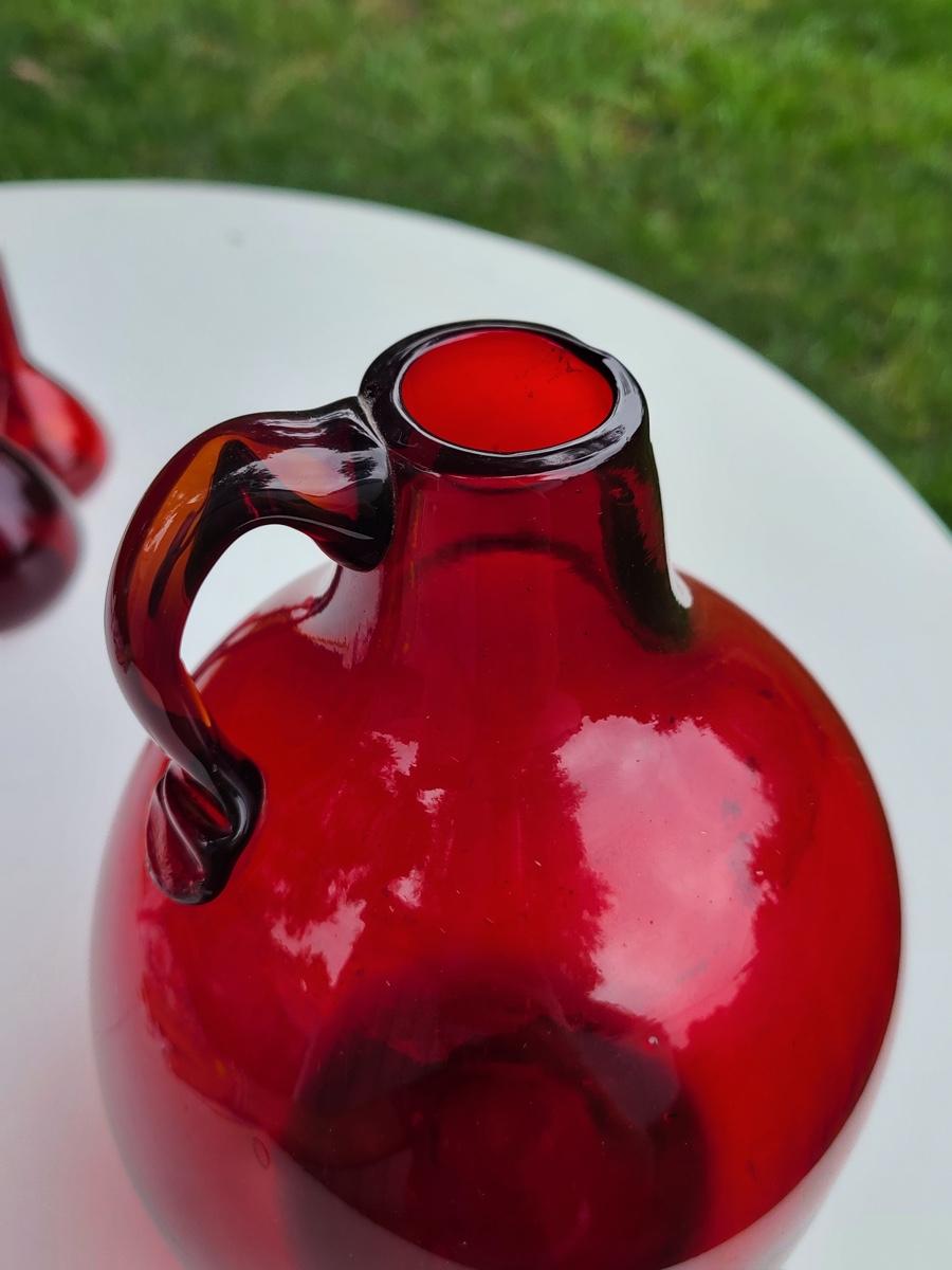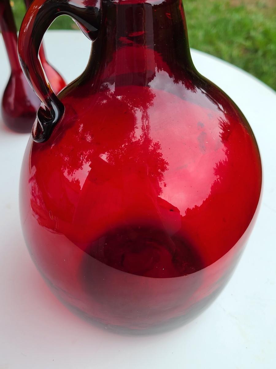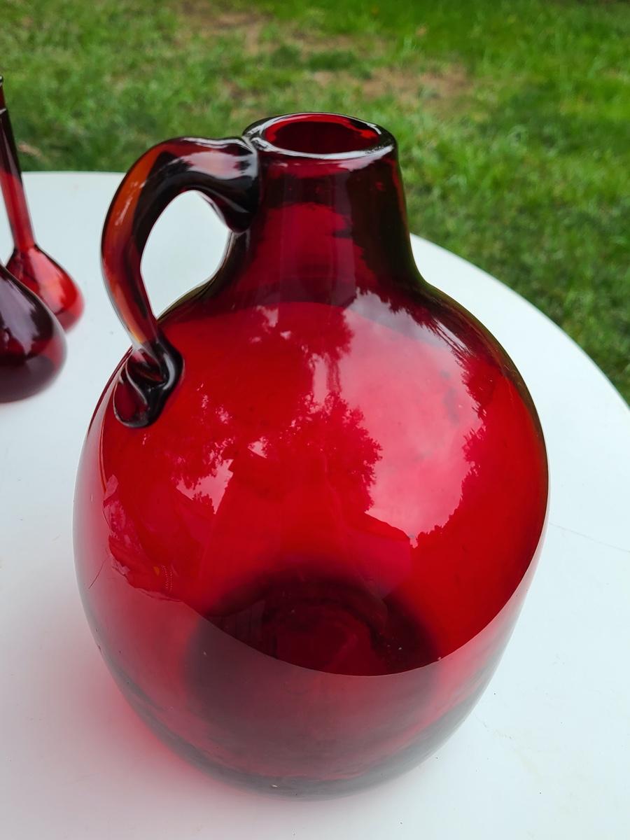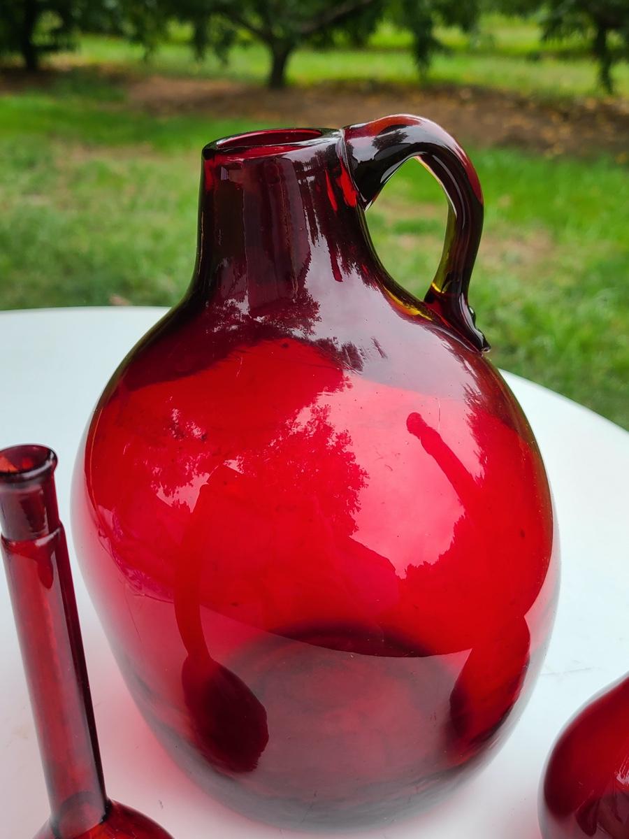 Lot 135: Antique/Vintage Ruby Red Hand Blown Glass Whiskey Pitcher and Flasks