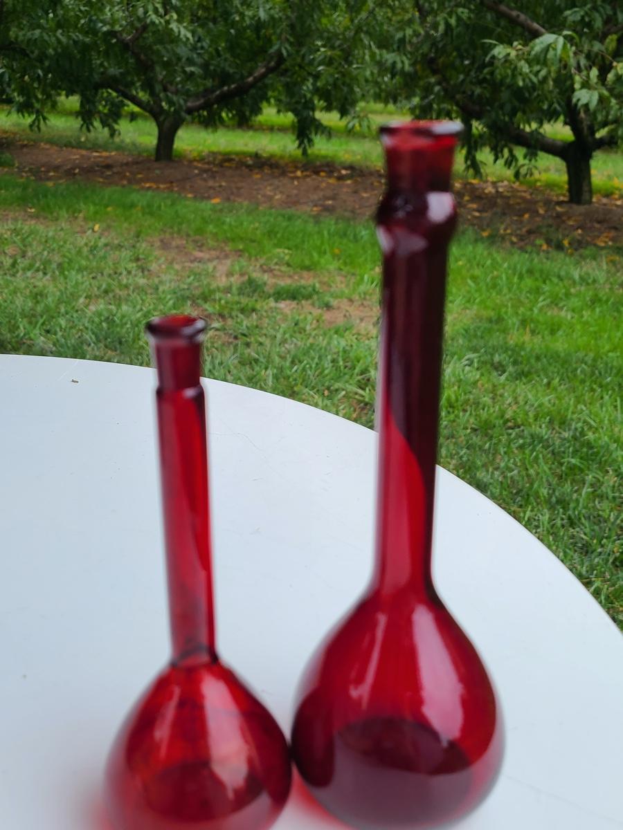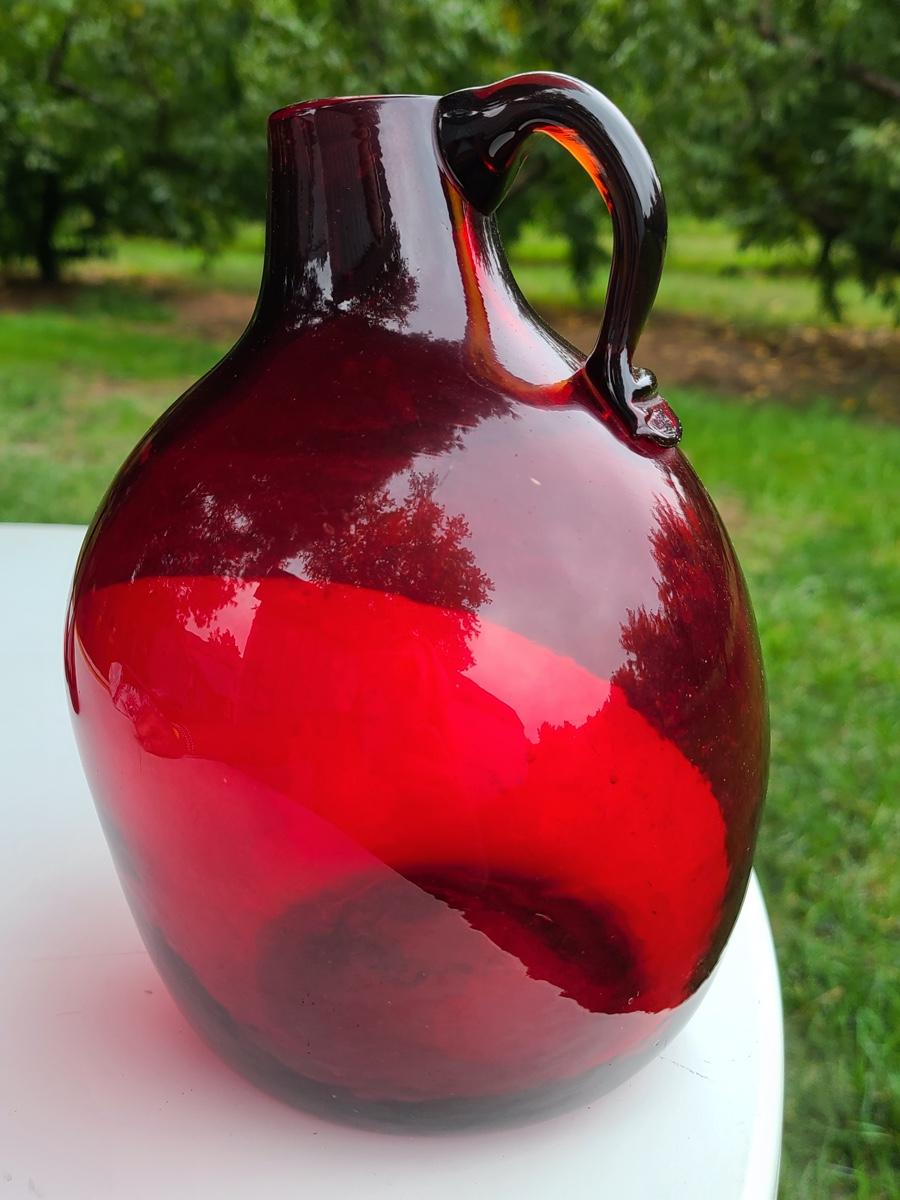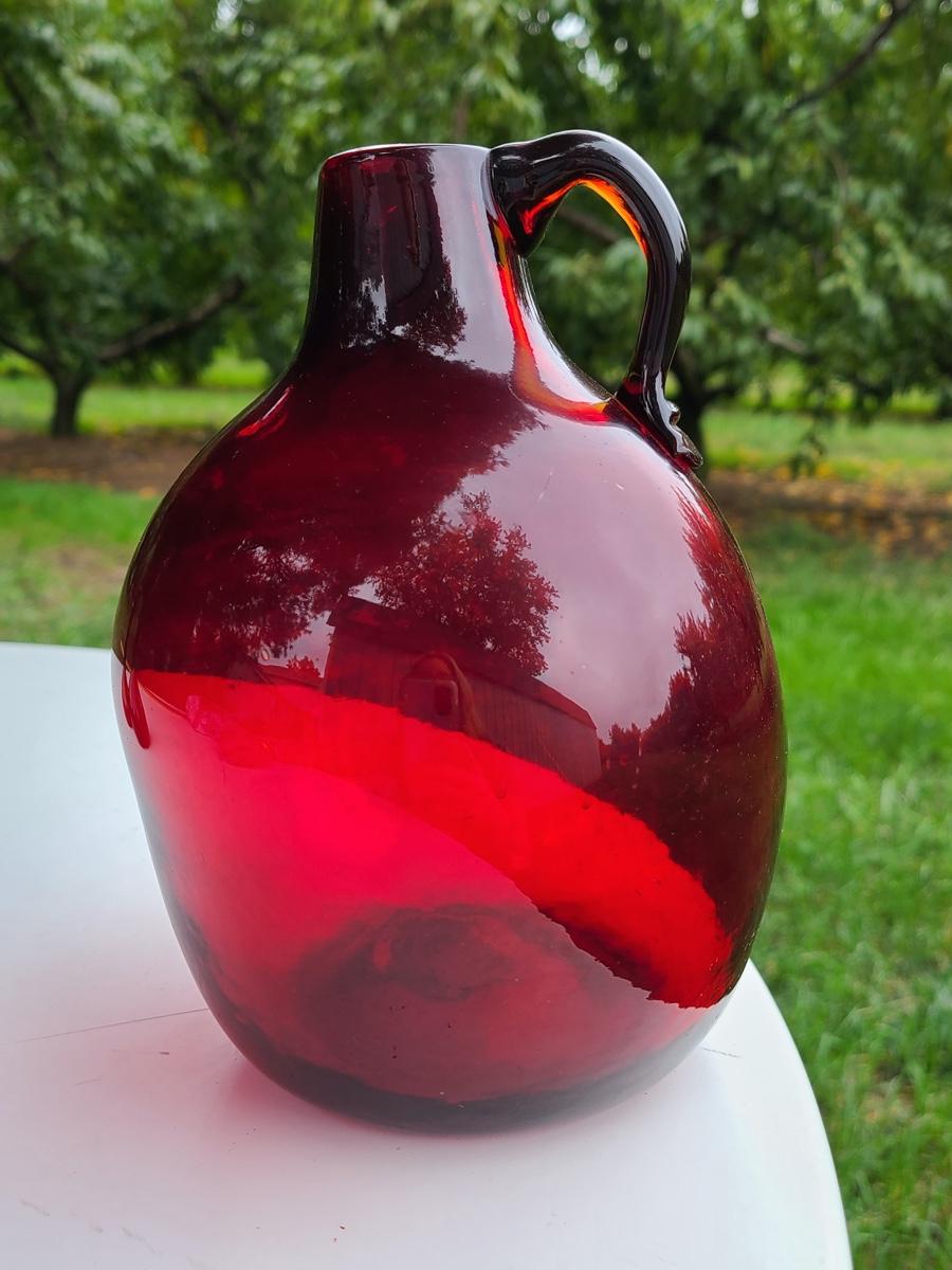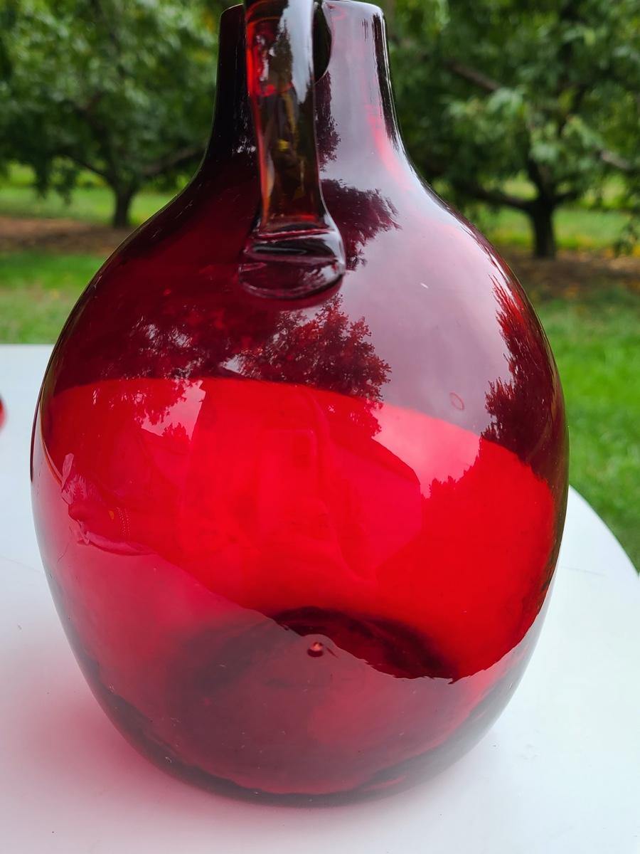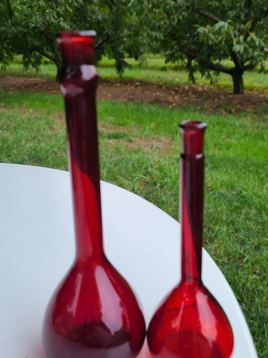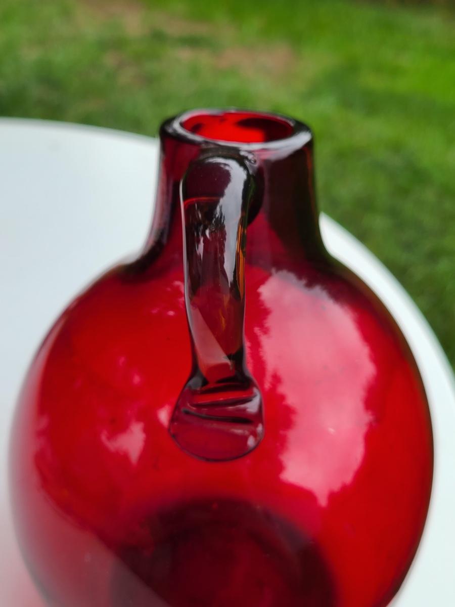 Lot 135: Antique/Vintage Ruby Red Hand Blown Glass Whiskey Pitcher and Flasks
