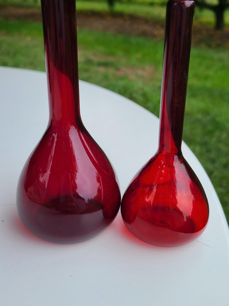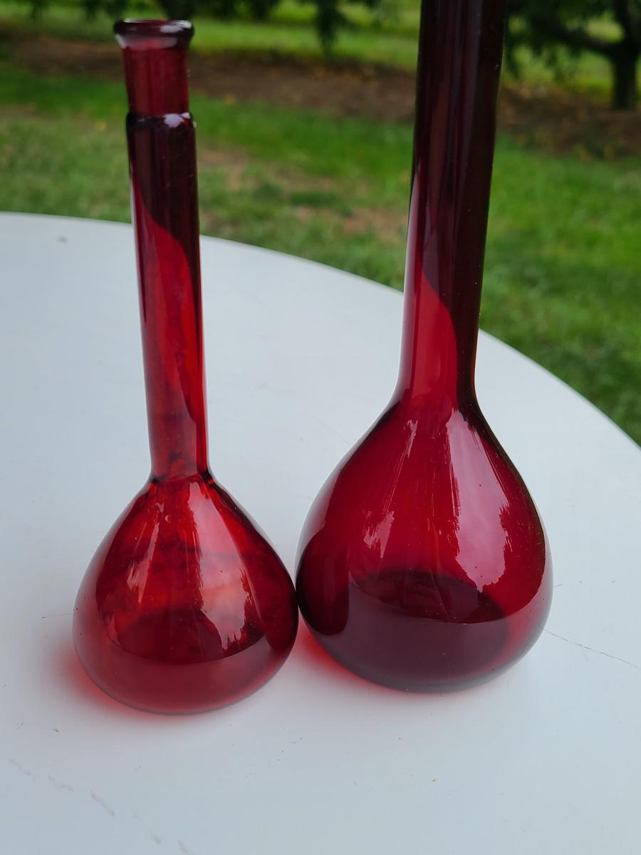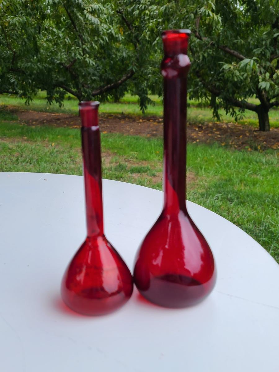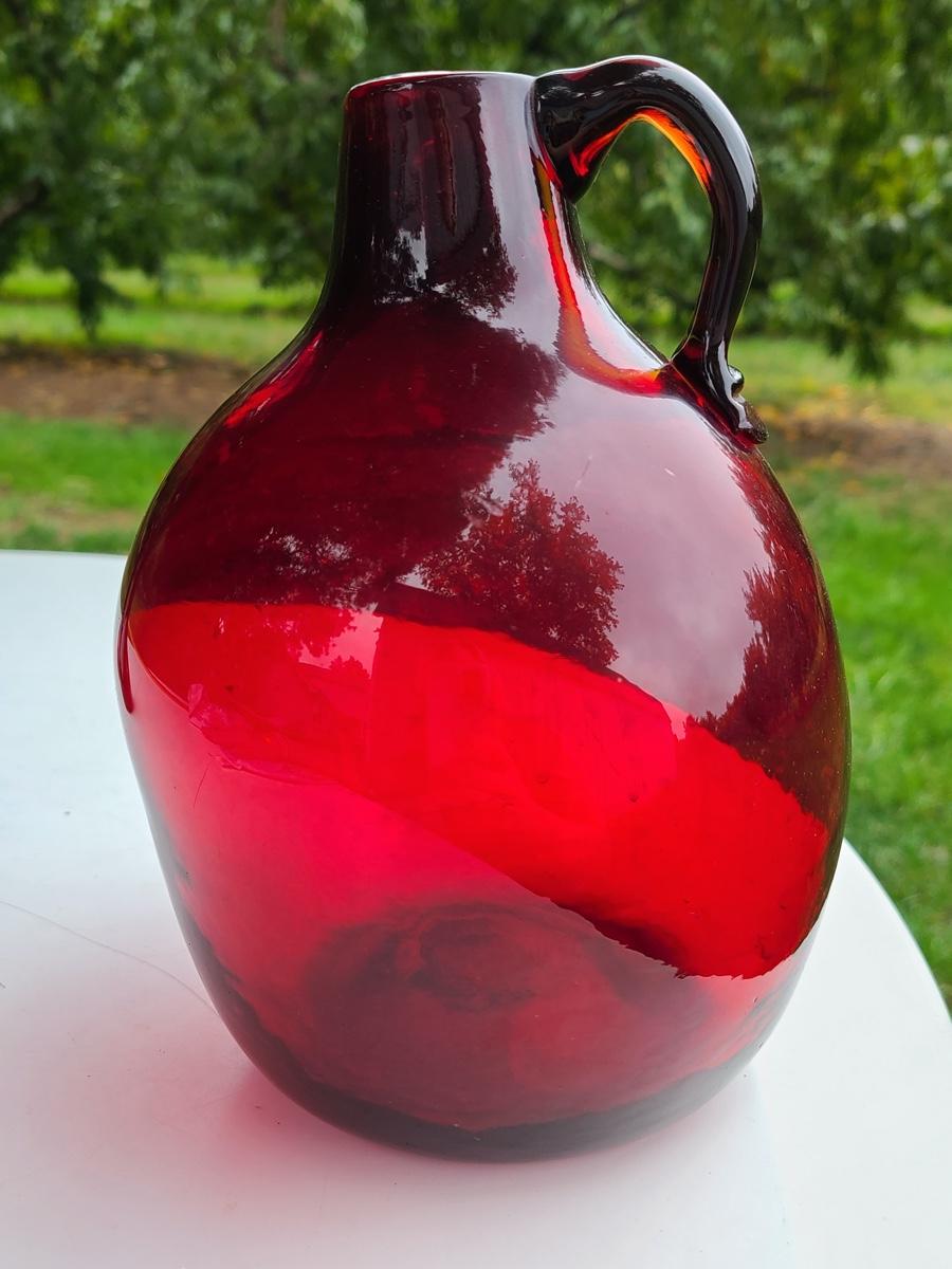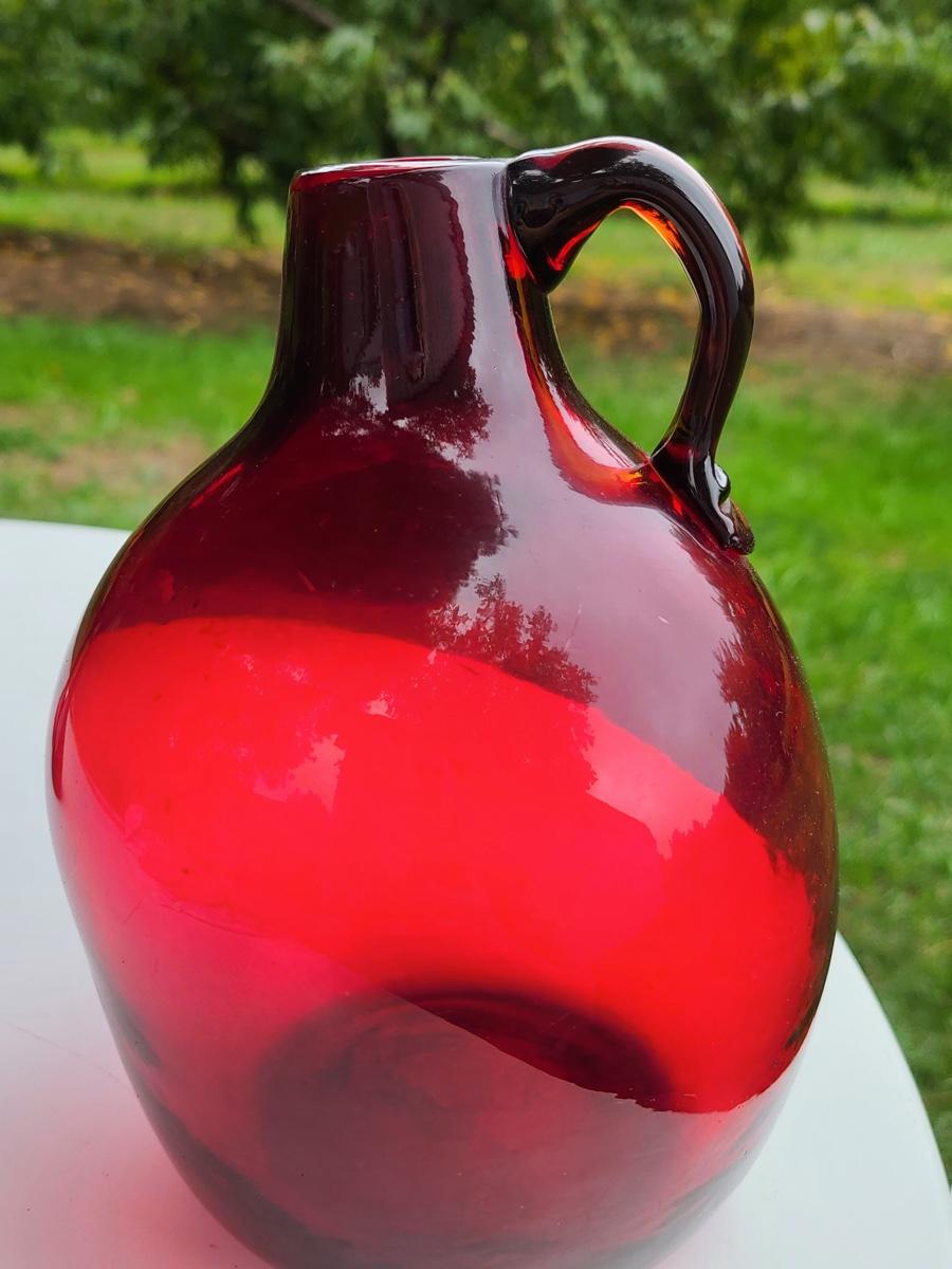 Lot 135: Antique/Vintage Ruby Red Hand Blown Glass Whiskey Pitcher and Flasks