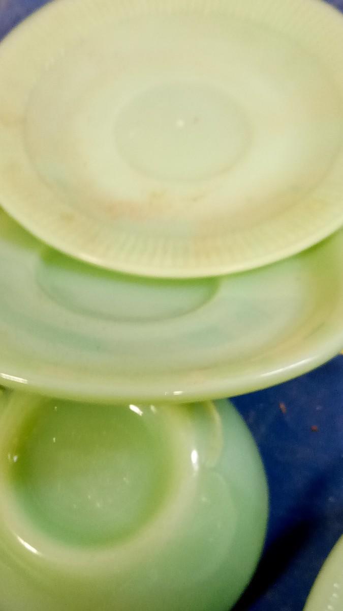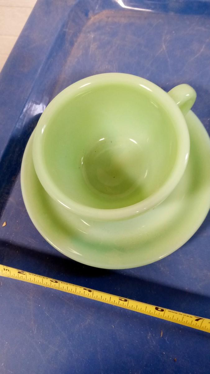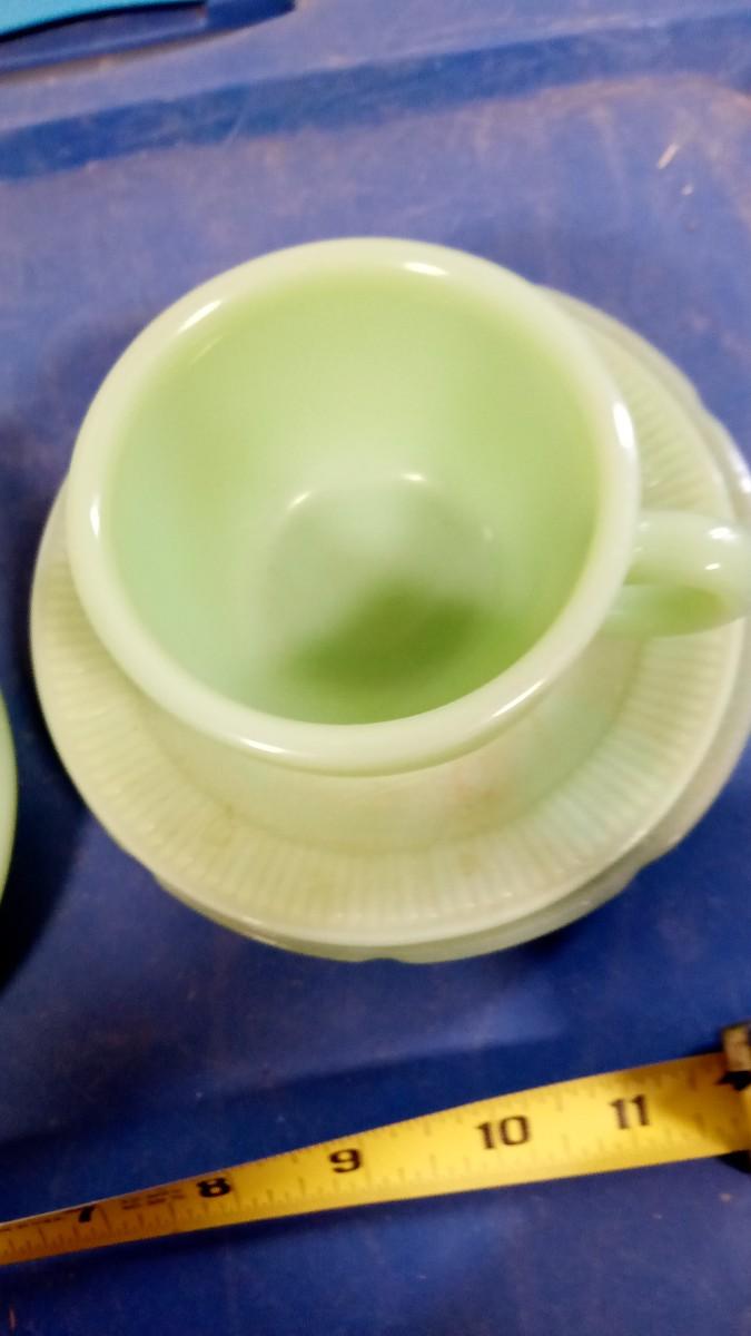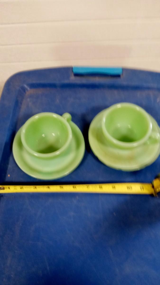 TWO HEAVY OLD CUPS THREE SAUCERS ONE THICK LIKE CUPS OTHER TWO NOT AS THICK AND DIFFERENT DESIGNS