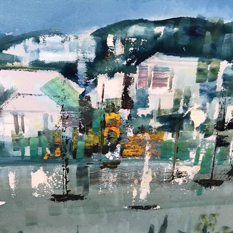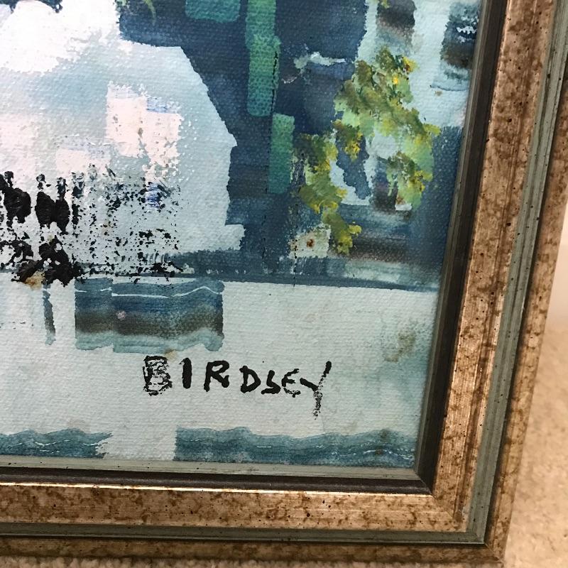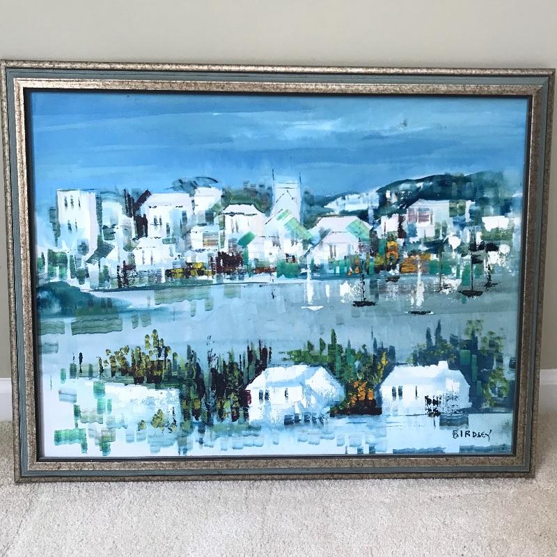 Stunning port scene signed Birdsey appears to be an oil painting on canvas. The art is not behind glass and the paint appears textured. Please come to the preview to see for yourself! The frame has an antiqued style and measures 26.5” x 21”. More Birdsey art can be found in lot 133. Shipping available. Please call UPS with dimensions at 828-252-6930 for a shipping quote prior to bidding.