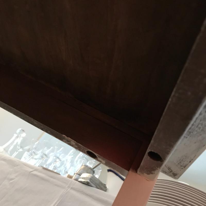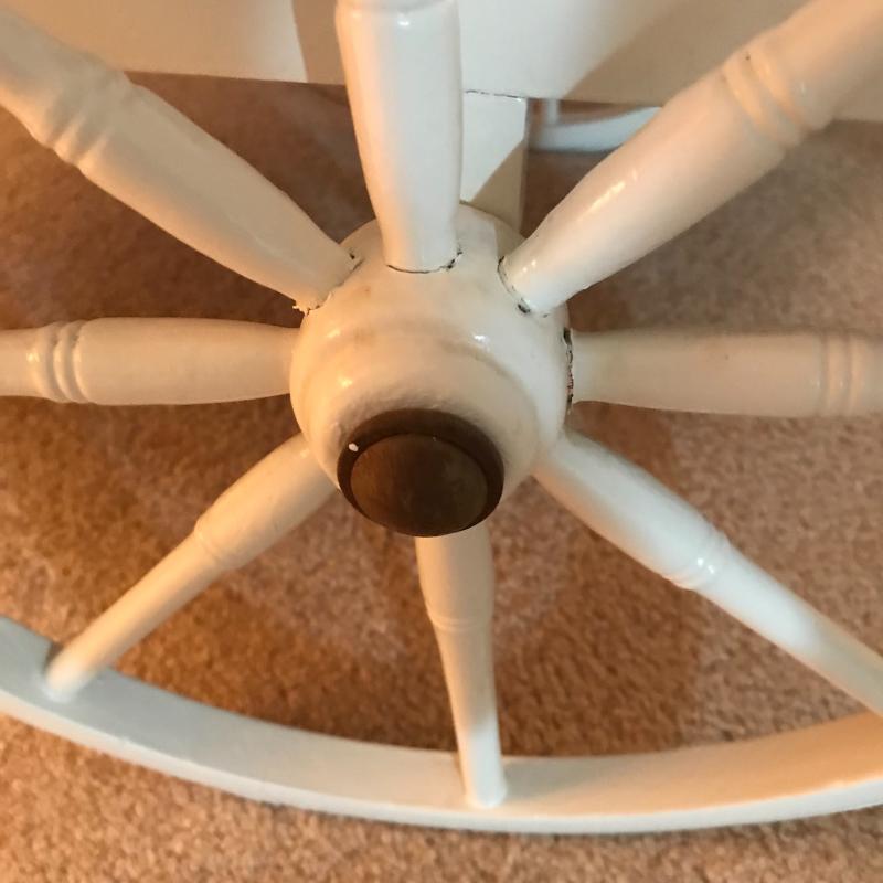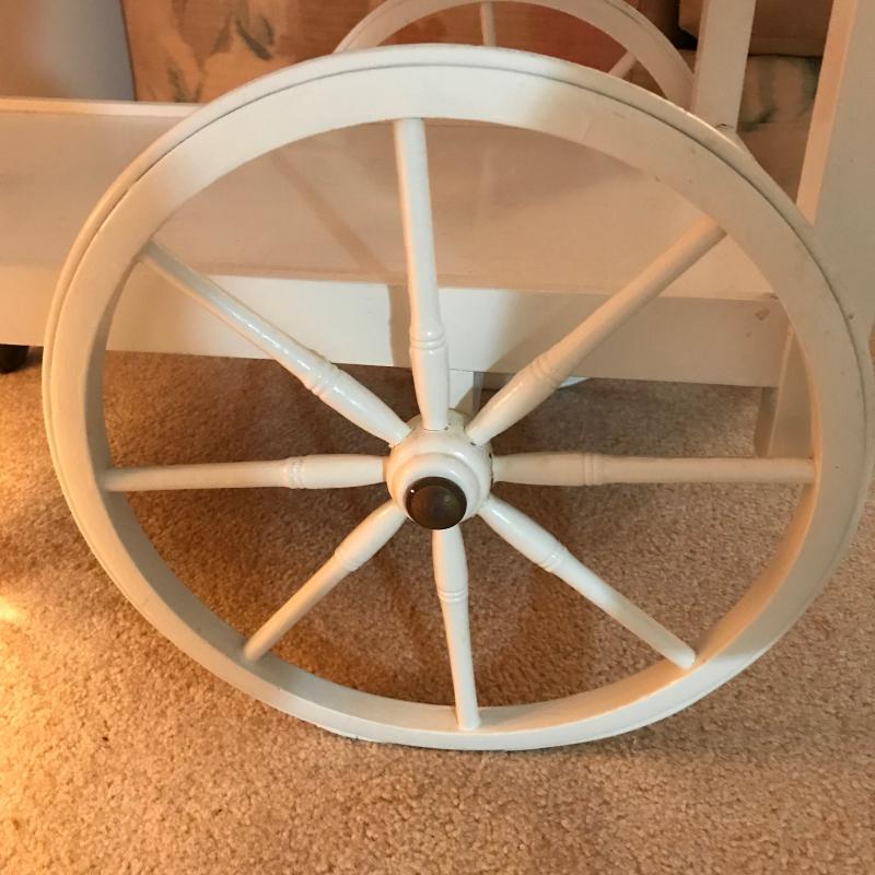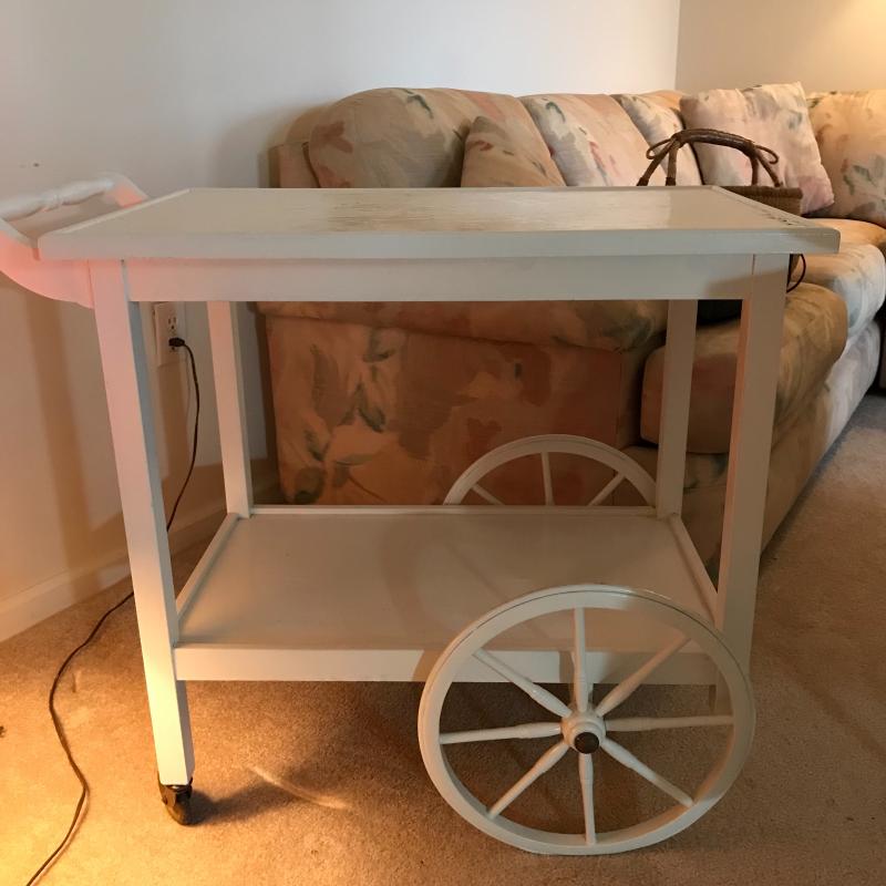 This sweet painted antique tea cart would be a charming addition to any dining room, kitchen, or bedroom. On casters, it rolls with ease and is relatively sturdy, though old. 32”l x 18”w x 28.5”h.