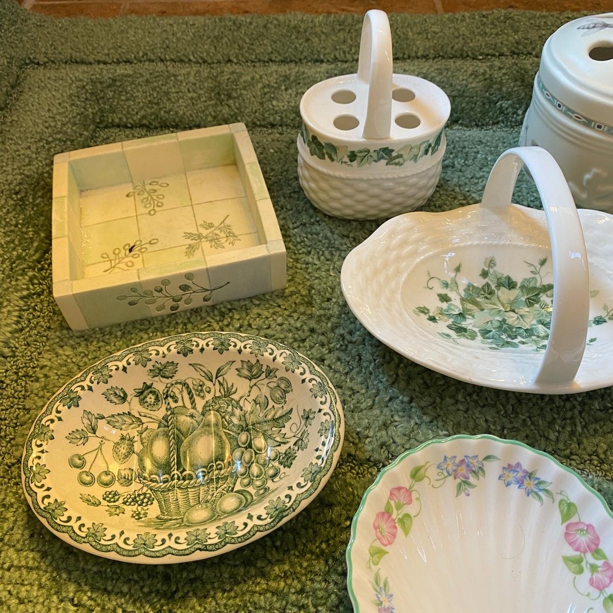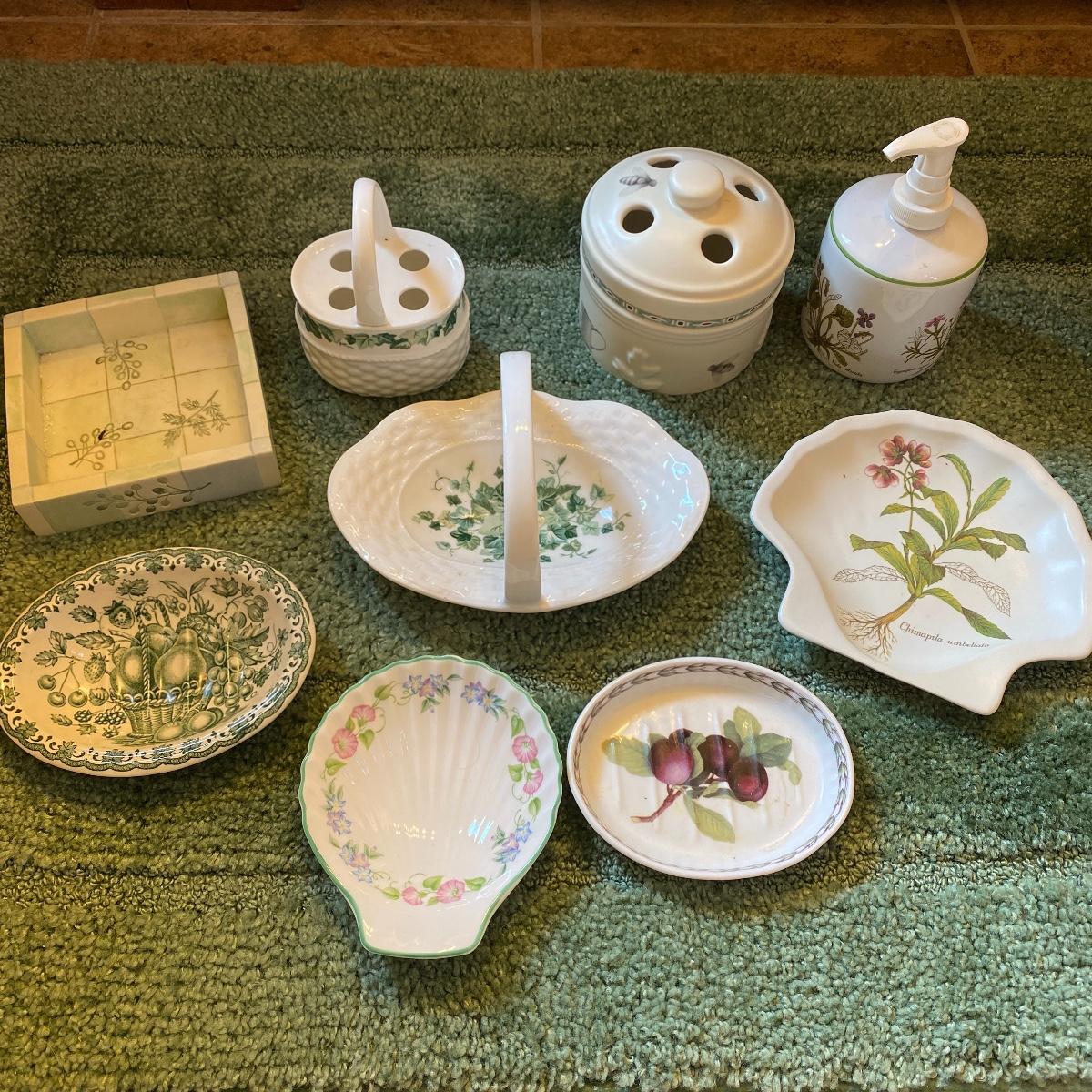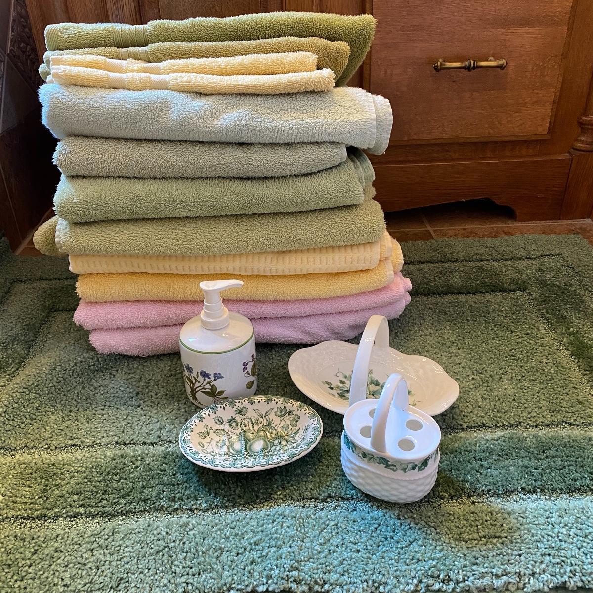 This lot includes a rainbow of colors to accessorize any bathroom! This lot includes pastel colored towels and bath mats as well a leopard print set and beach towels. There are several pairs of colorful hand towels and a bunch of bath mats in different colors, shapes and sizes. There is also several soap and toothbrush holders in green and white tones. Some English manufacturers like Wood & Sons and Poole. See photos for more details. Local pick-up only.