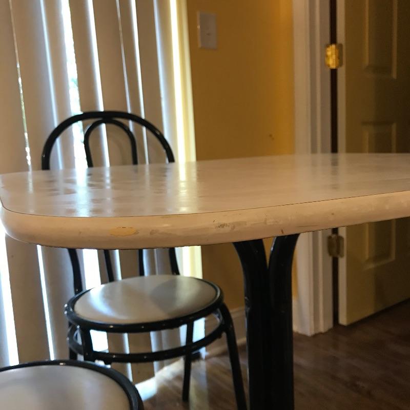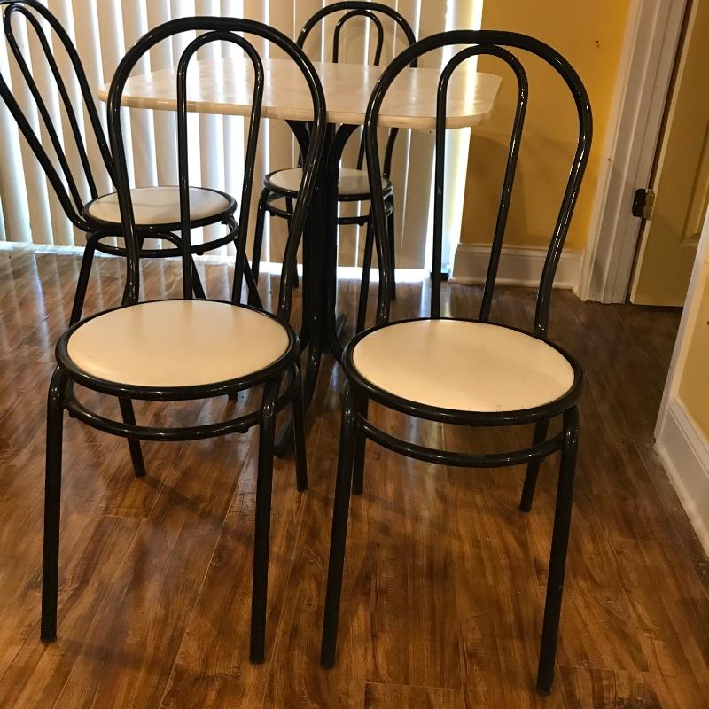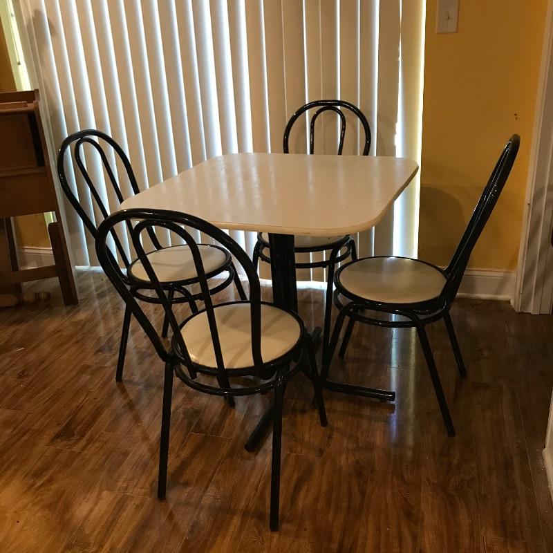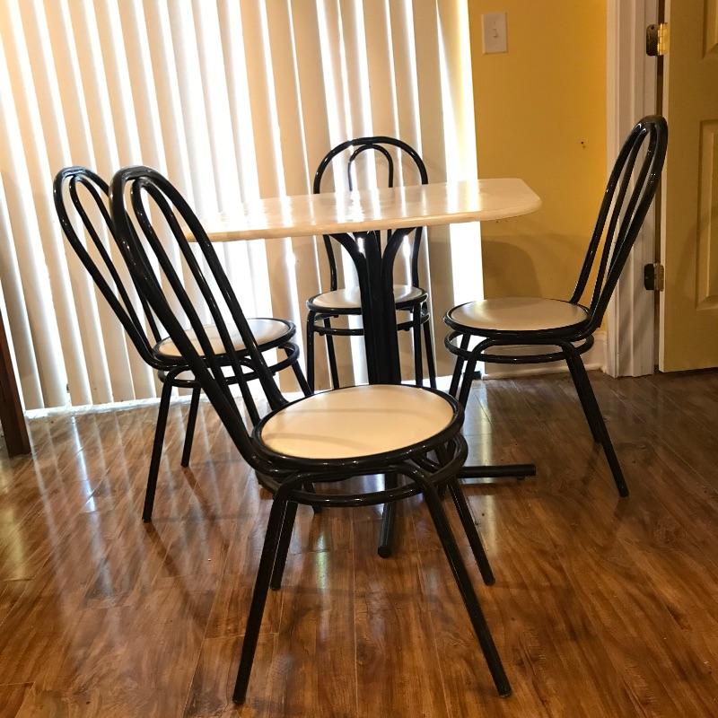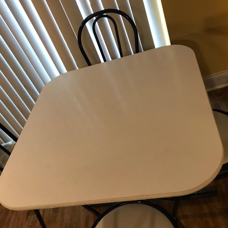 Nice small bistro table with four matching chairs. The table legs and chairs are a shiny black metal, the chair cushions are vinyl and a white laminate table top ties the pieces together. Pieces could use a quick wipe with your favorite cleaner, it appears most blemishes can be wiped away. All pieces are a little dirtier than images show, but they are sturdy and chic, perfect as a breakfast nook or your new homeschool spot. Table measures 30”sq x 29”, chairs measure each 14” x 19” x 34.5” with a seat height at 17”. Table top looks like it can be removed with a Phillips head screwdriver for transport. Local pick up only.