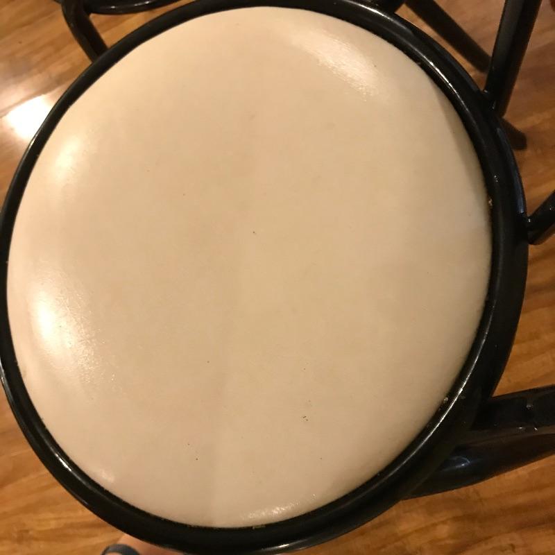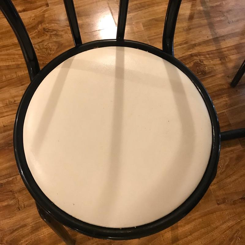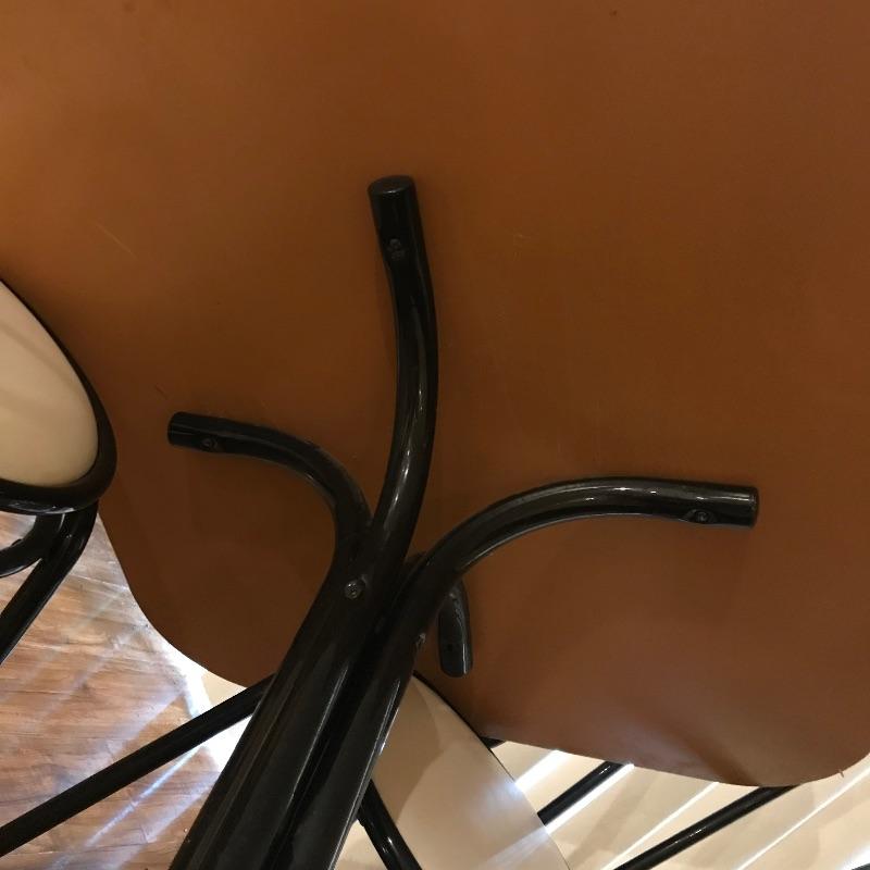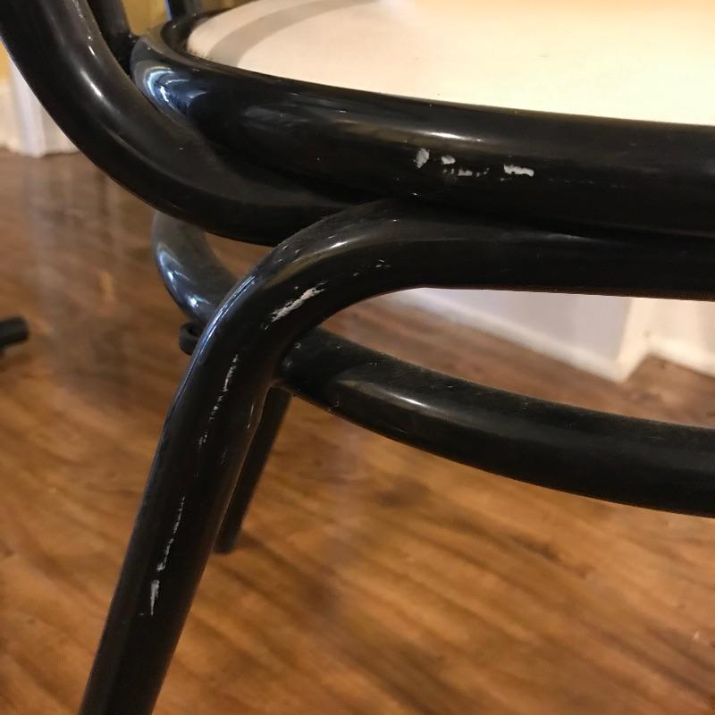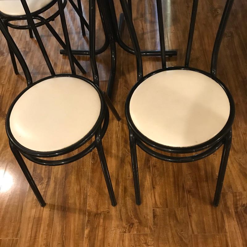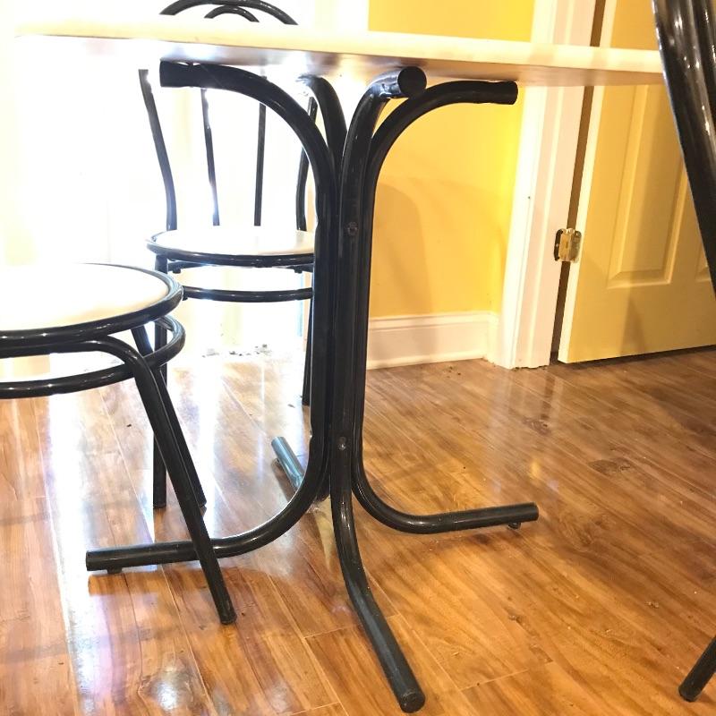 Nice small bistro table with four matching chairs. The table legs and chairs are a shiny black metal, the chair cushions are vinyl and a white laminate table top ties the pieces together. Pieces could use a quick wipe with your favorite cleaner, it appears most blemishes can be wiped away. All pieces are a little dirtier than images show, but they are sturdy and chic, perfect as a breakfast nook or your new homeschool spot. Table measures 30”sq x 29”, chairs measure each 14” x 19” x 34.5” with a seat height at 17”. Table top looks like it can be removed with a Phillips head screwdriver for transport. Local pick up only.