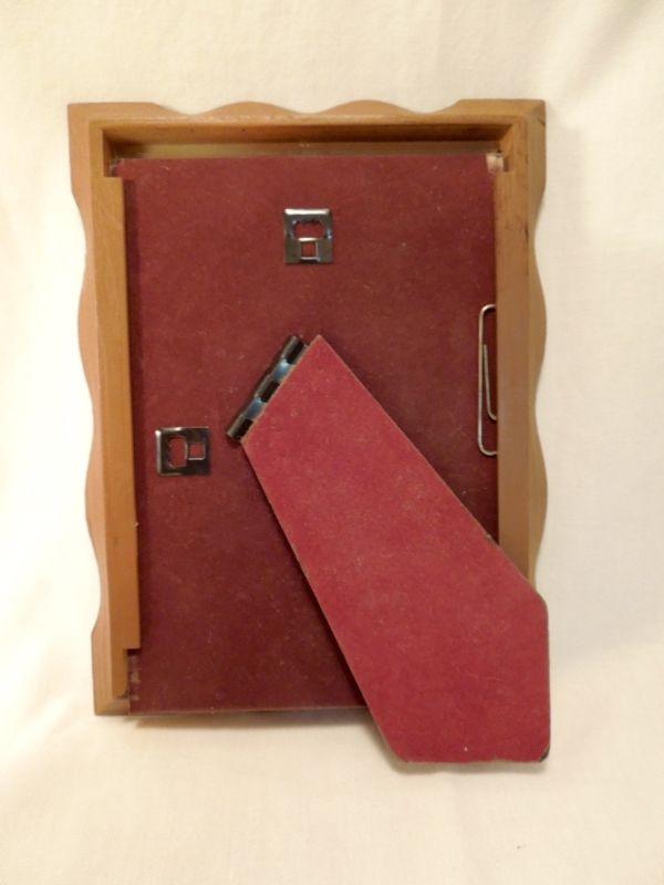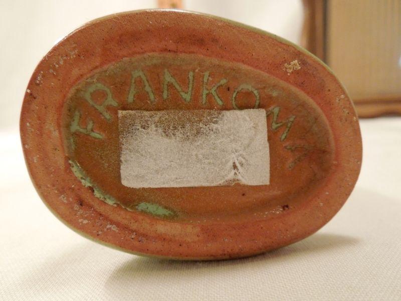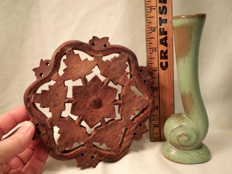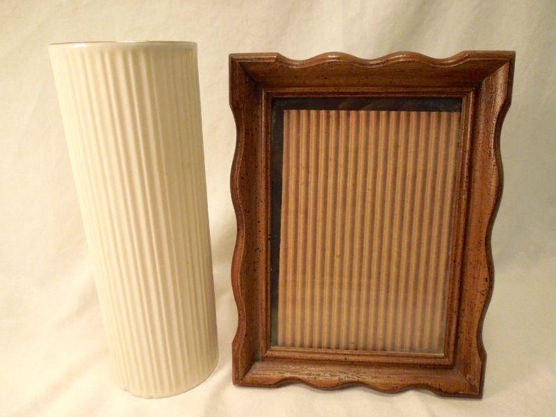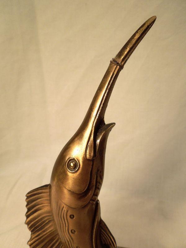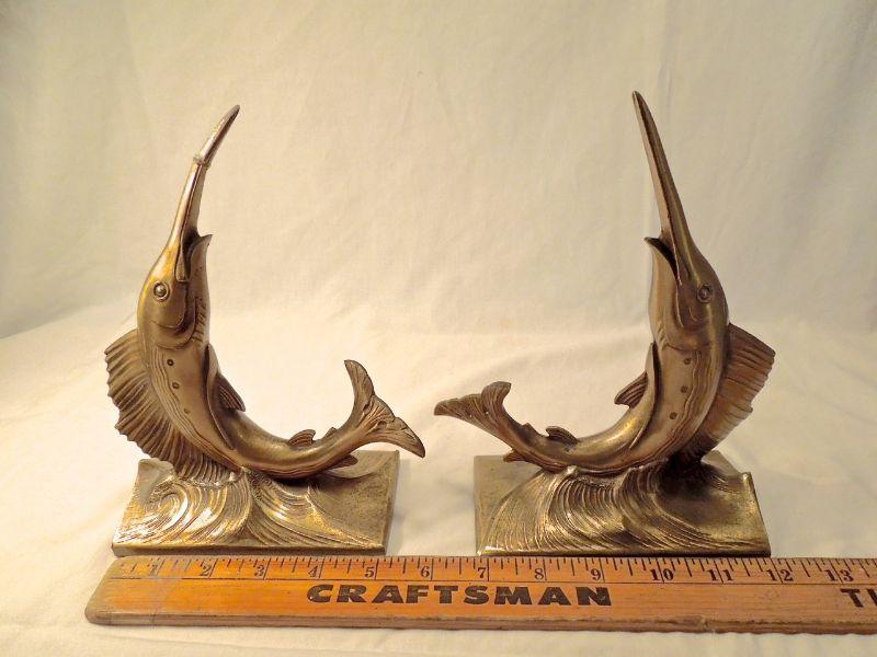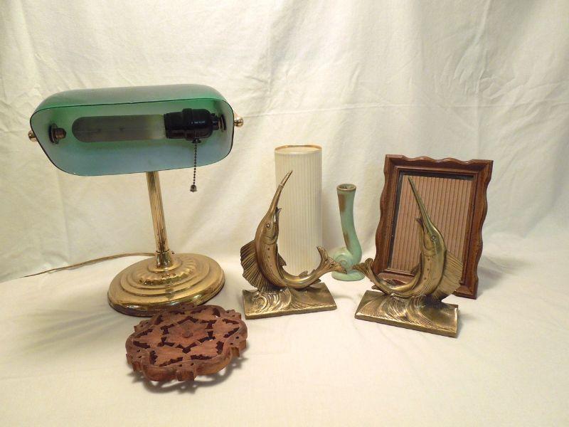 8 x 5.5 " brass marlin bookends (one has a broken bill); 6x9 frame; vintage Frankoma 6.5" green bud vase; 8.5" Lenox porcelain vase (small chip); 5.5" wooden carved trive; 13" tall repro green shade bankers lamp.