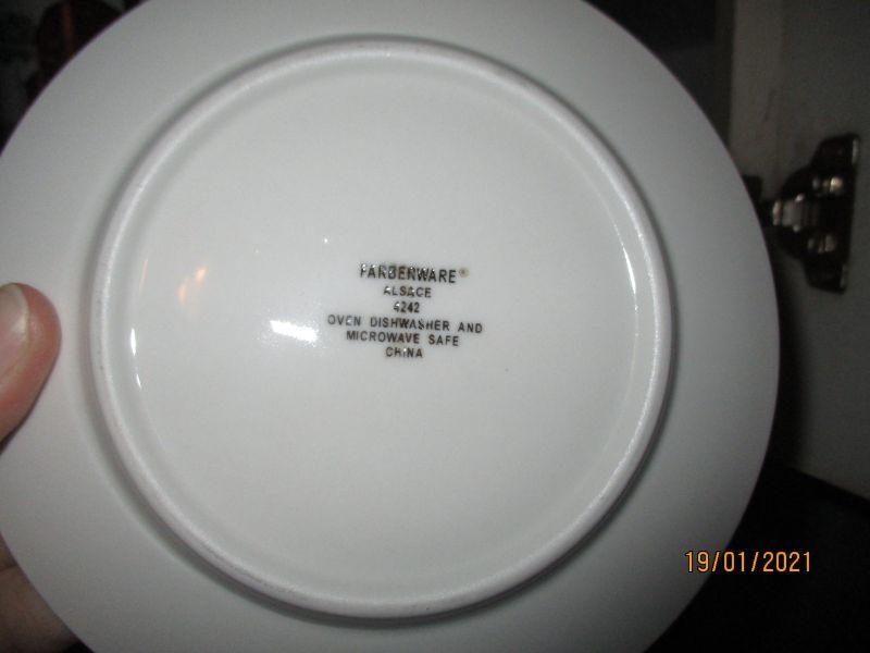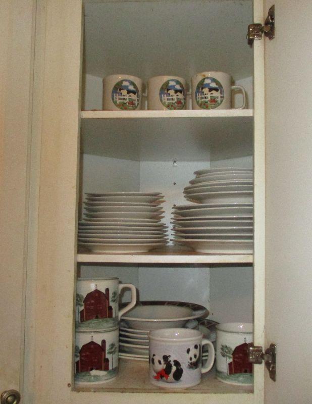 The dishes on the middle shelf are all the same pattern by Farberware. It is at least a 4 place setting, but it is missing the cups. All of the dishes and mugs are in good condition.