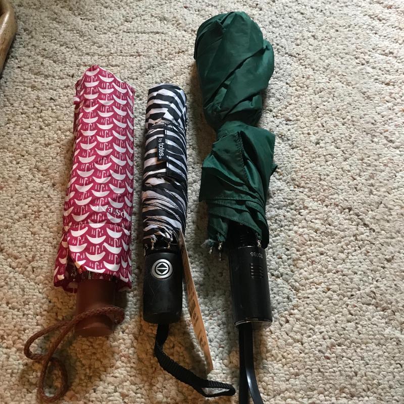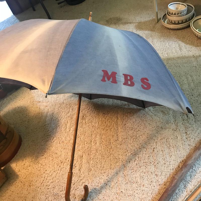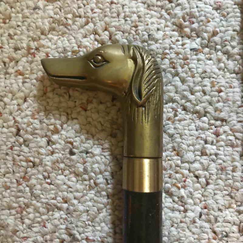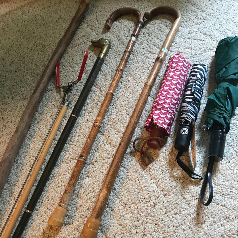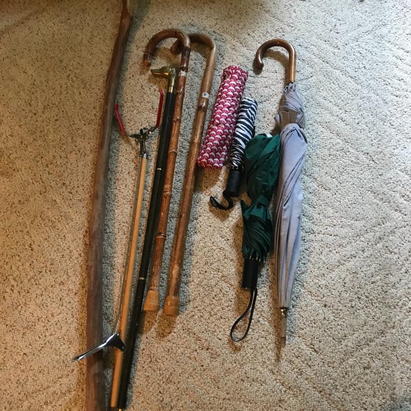 Natural wood and bamboo cane as well as an ornate 4 piece wood and brass cane with dog bust. Large walking stick measures 52” long. Three small umbrella, 2 are totes with one still having tags. One cotton and wood parasol and a grabber too. Local pick up only.