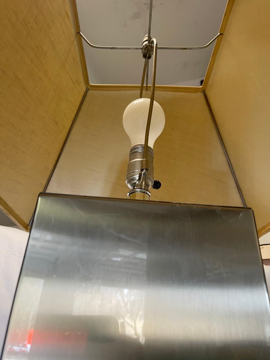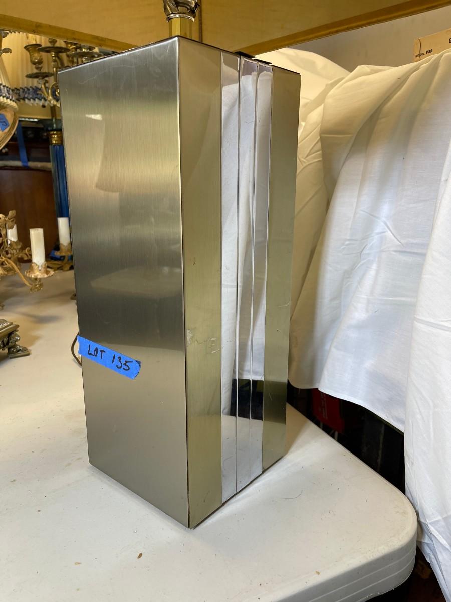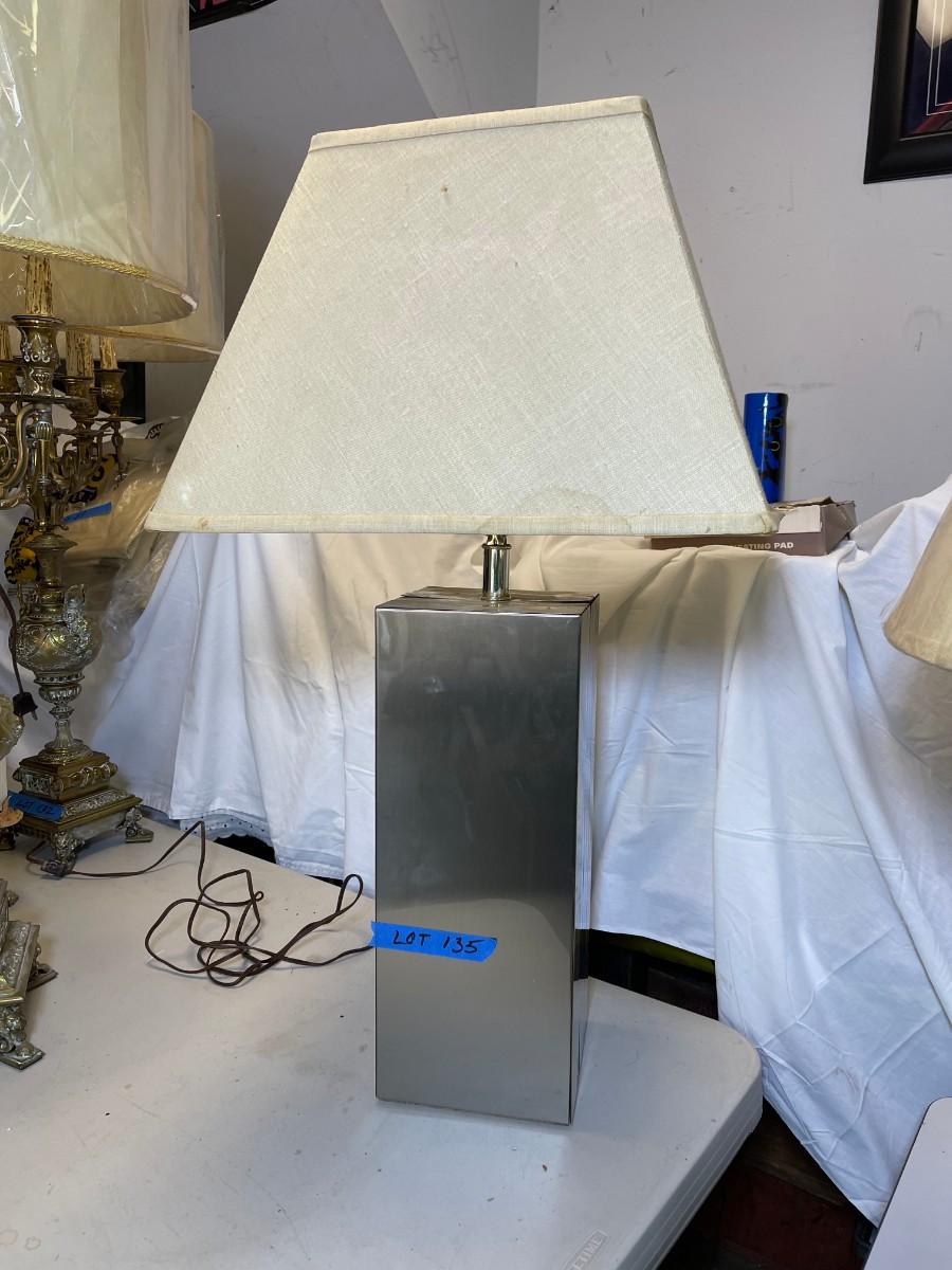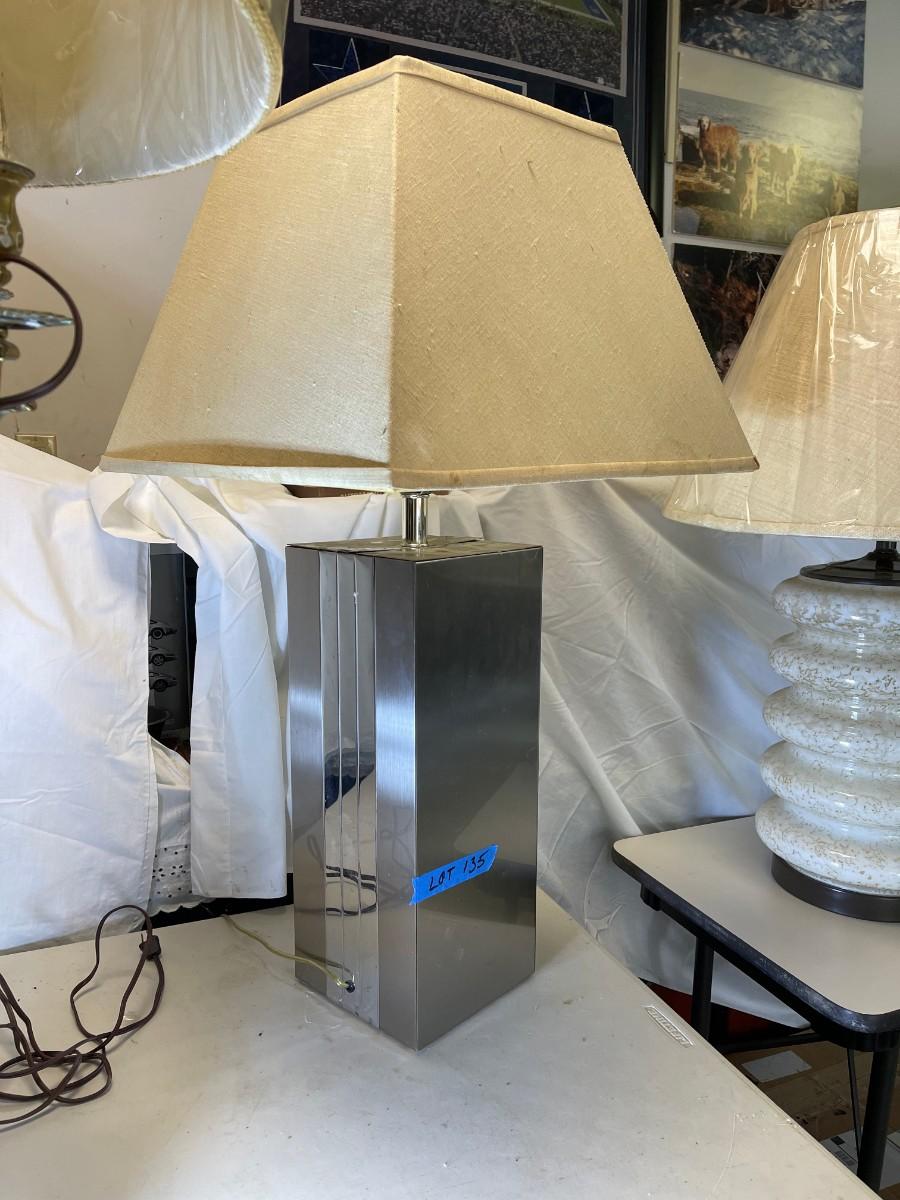 Modern chrome base lamp with 3 stripped mirror like accents.