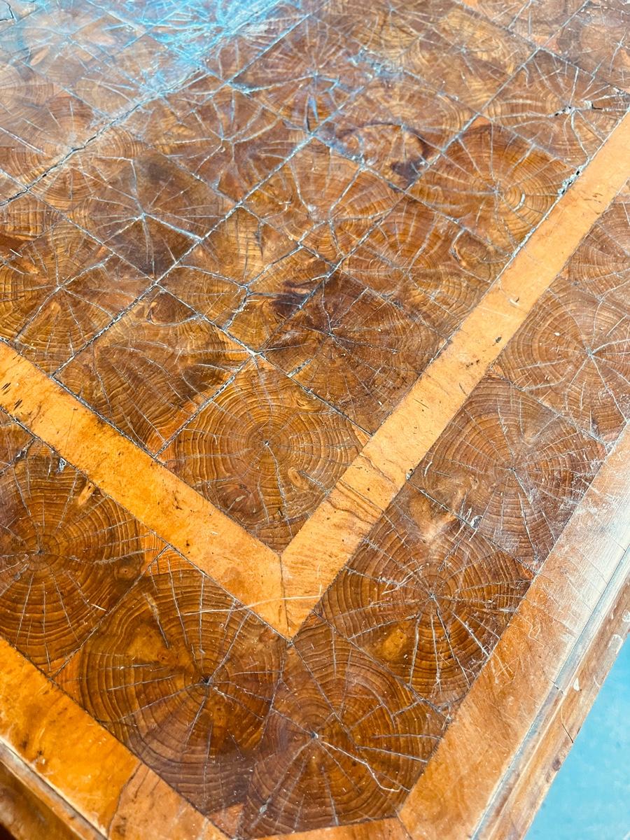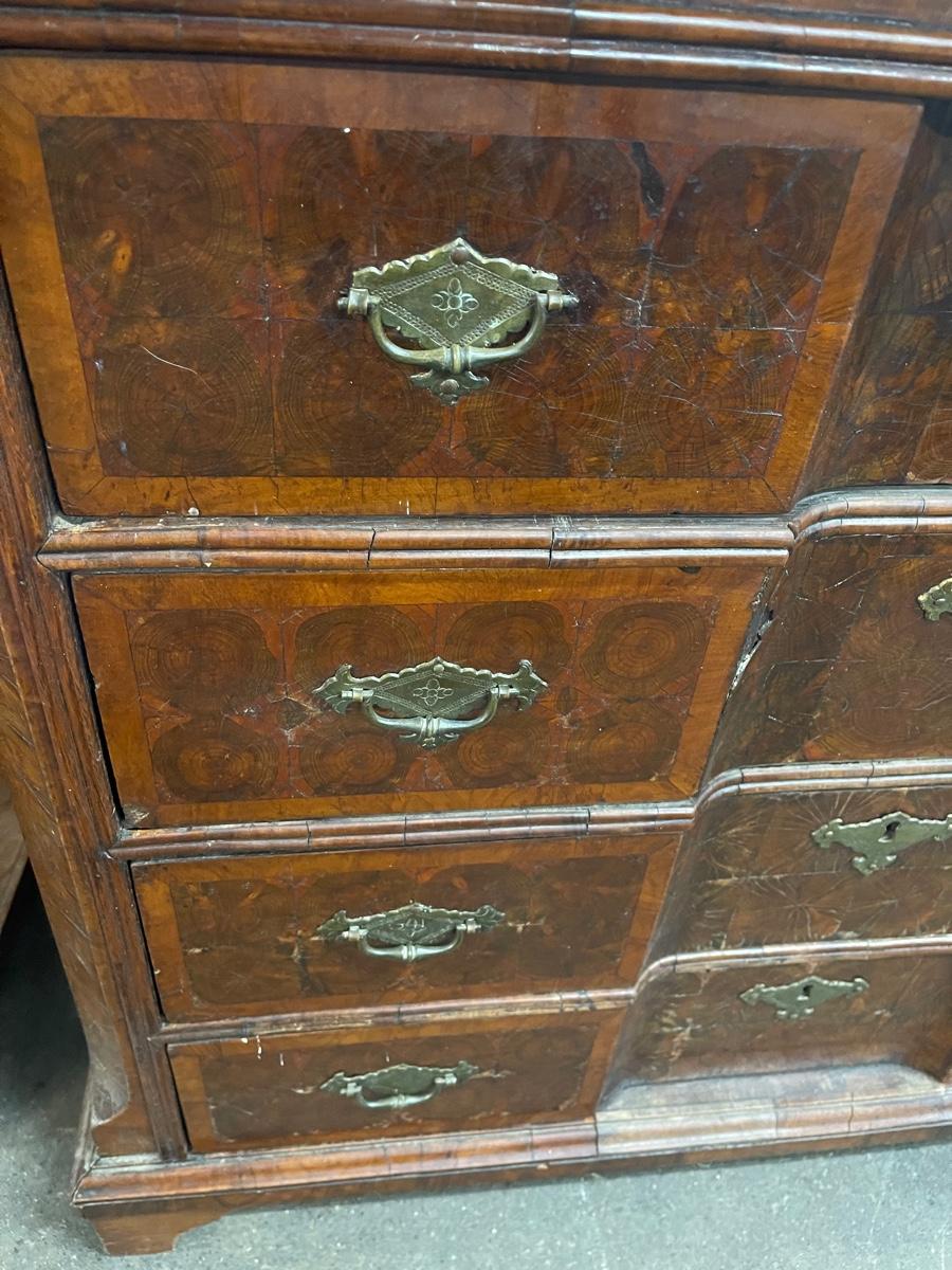 LOT 135 - Early 18th Century Oyster Veneer Chest of Drawers. It is early 18th century and likely English or Anglo-Dutch. It has some condition issues and should be viewed in person before bidding. This item is part of the David-Pleydell-Bouverie Estate at Bouverie Ranch in Glen Ellen. This item can be viewed at our Green + Cate Showroom in Sebastopol from July 15th - July 18th between the hours of 9am-5pm. For the benefit of the Bouverie Preserve of Audubon Canyon Ranch.