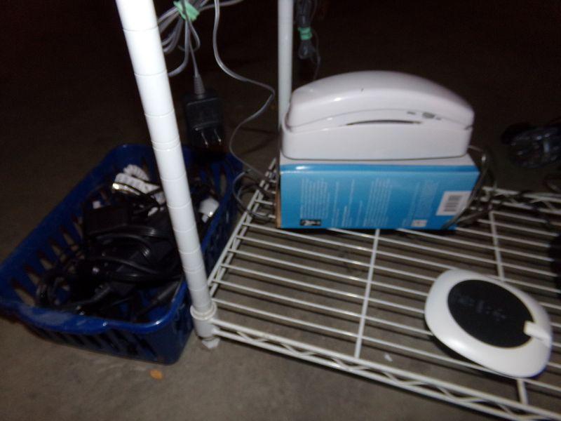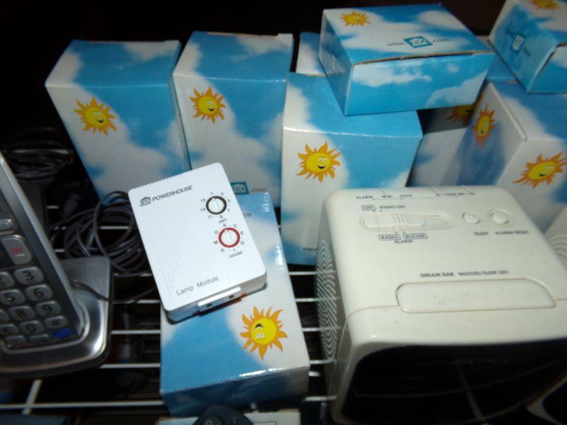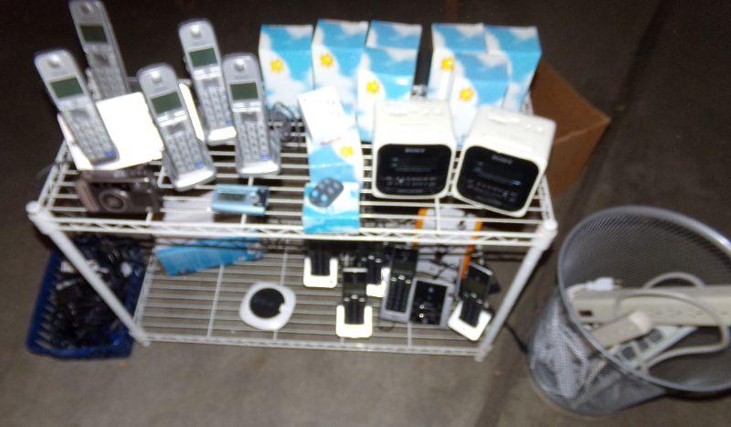 2 SONY ALARM CLOCKS, 5 HANDSET CORDLESS PHONES X 2, SURGE PROTECTORS, POWERHOUSE LAMP MODULES AND MORE