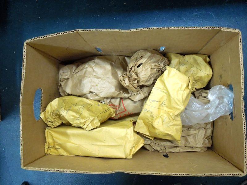 Contains card specimens, unakite, essonite, smoky quartz, stadrolete, thulite and more in the paper bags. Some sorted. Collected in the 60's and 70's.