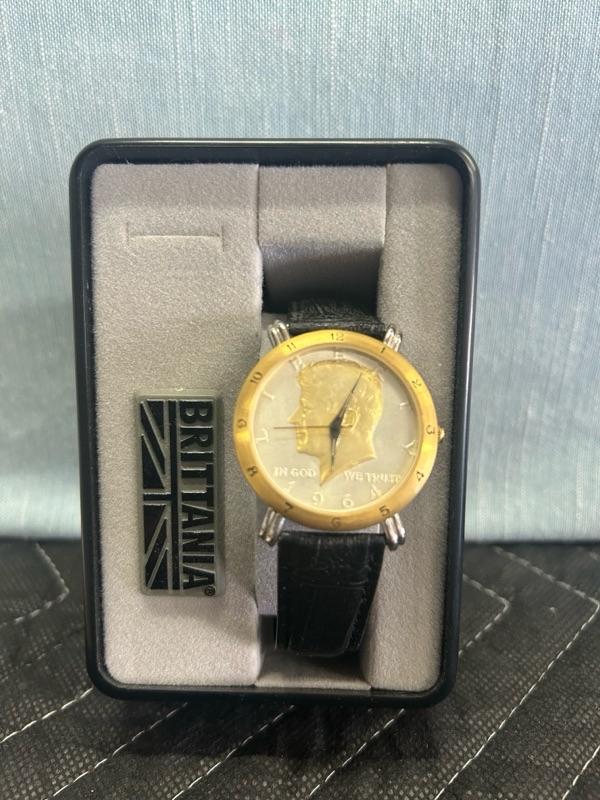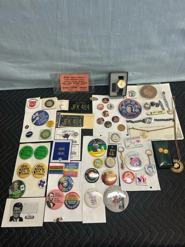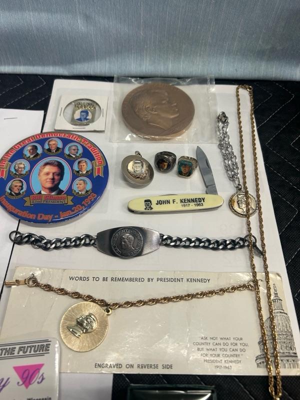 Various Kennedy pins, necklace, bracelet, watch, clips, knife