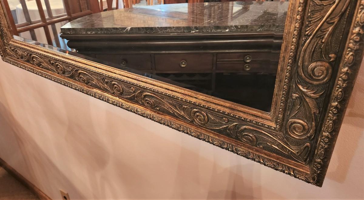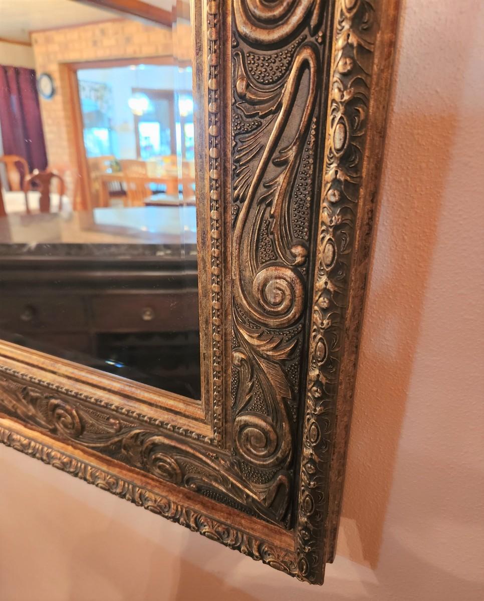 Striking contemporary beveled glass wall mirror with 4.5" wide frame. Bronze tones. 48" across, 38" tall - it's a beauty.