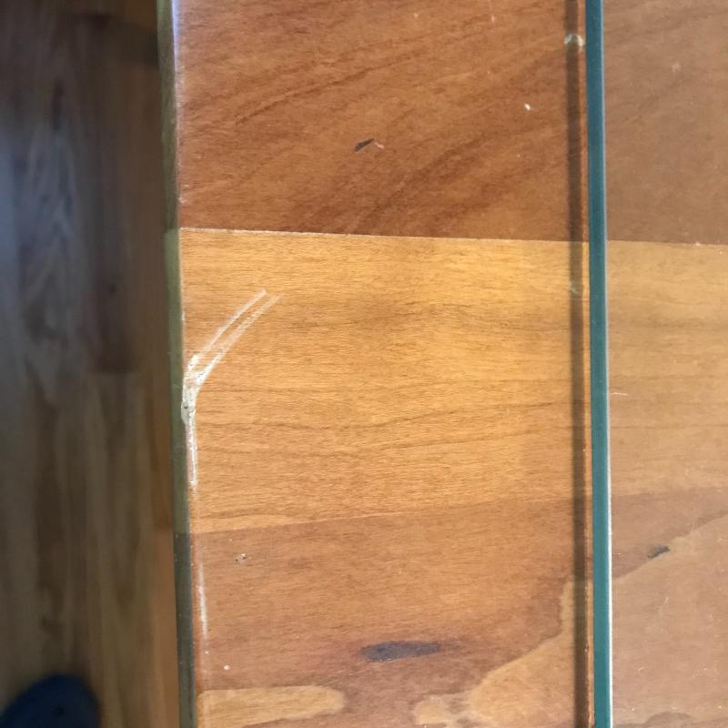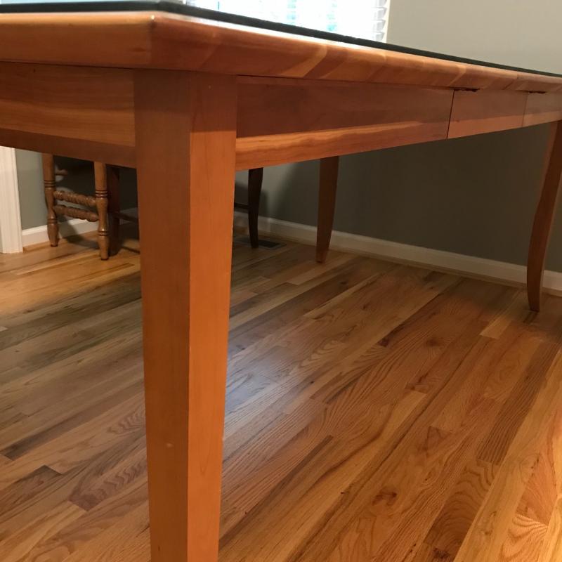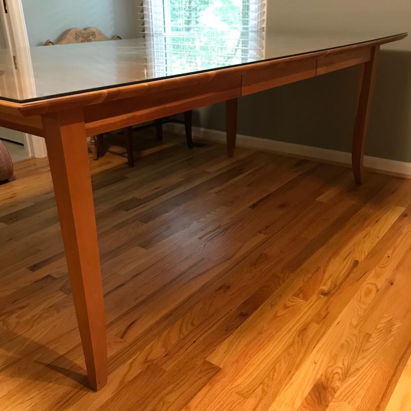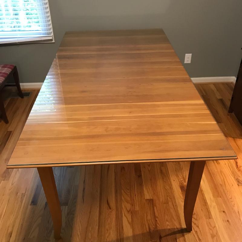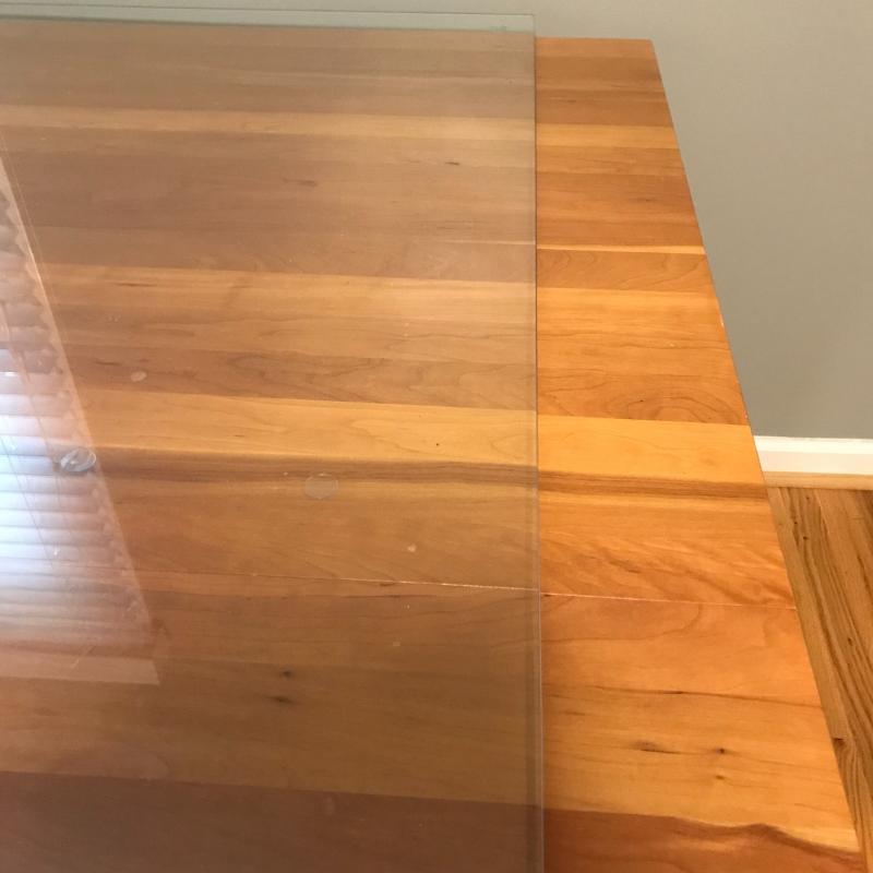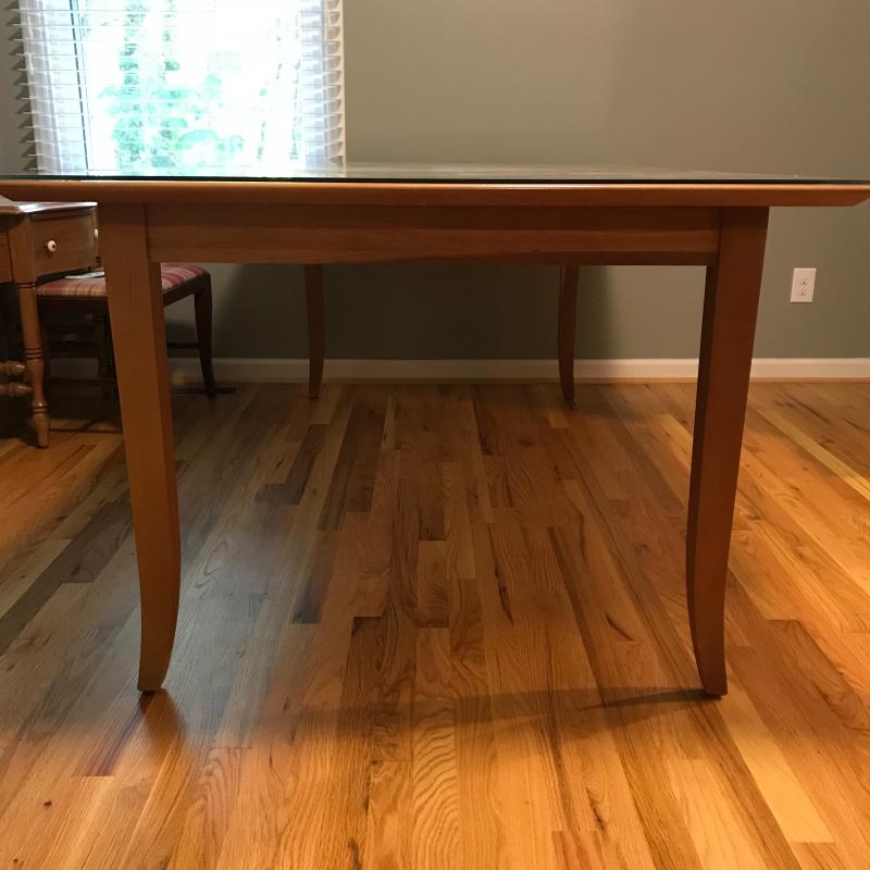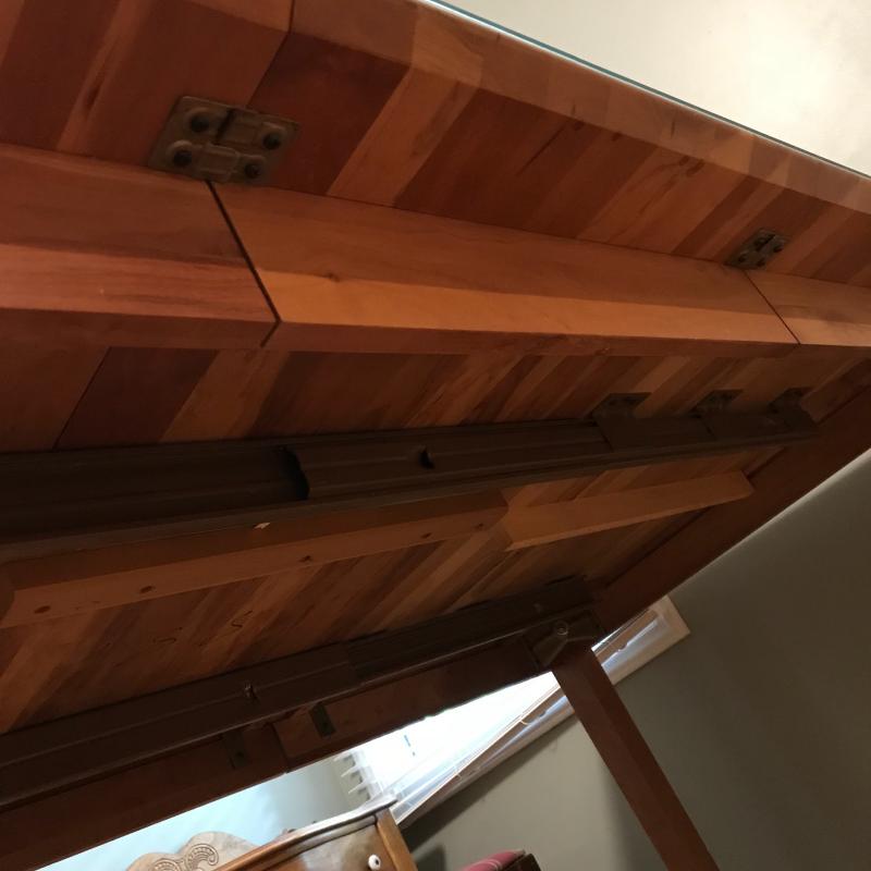 Large wooden dining table pictured with leaf measures 82”x42”x30.5”h. Leaf adds 20”. Table has metal rails to slide apart for leaf and a heavy, large protective custom glass top. Some wear noted in photos, but table is in great shape overall. Local pick up only, please bring help to load.