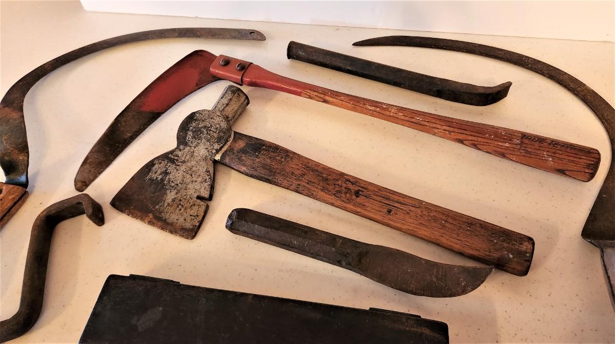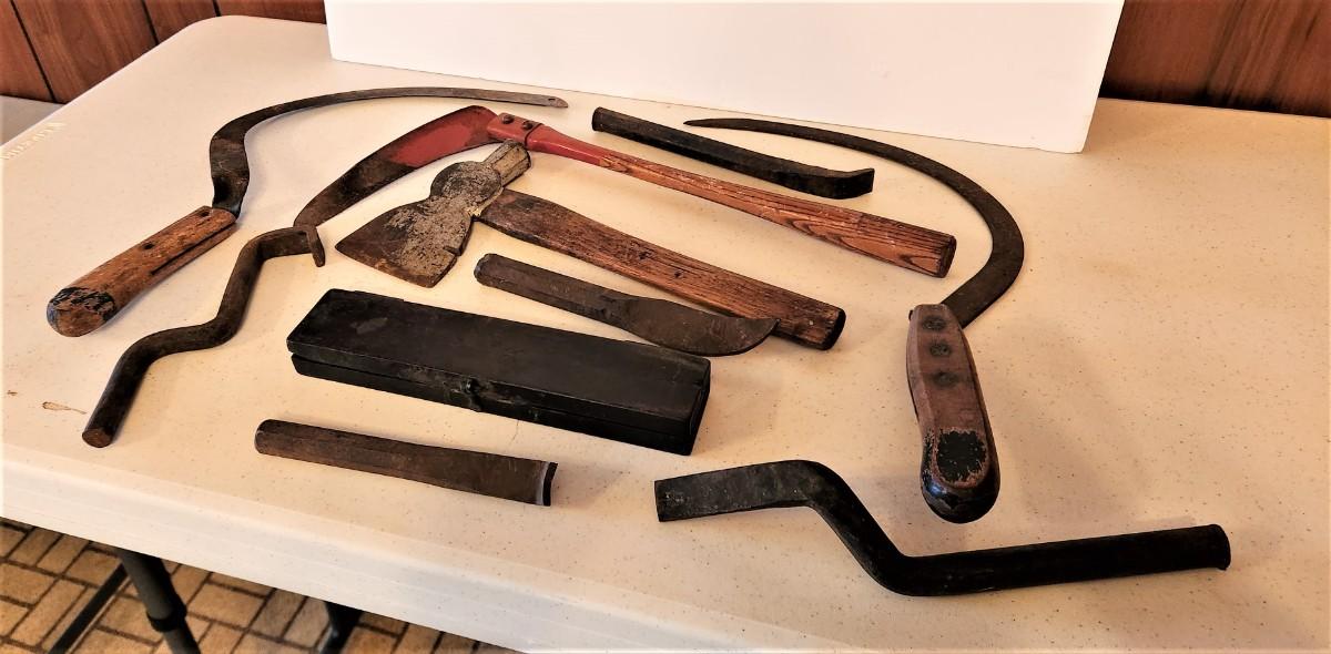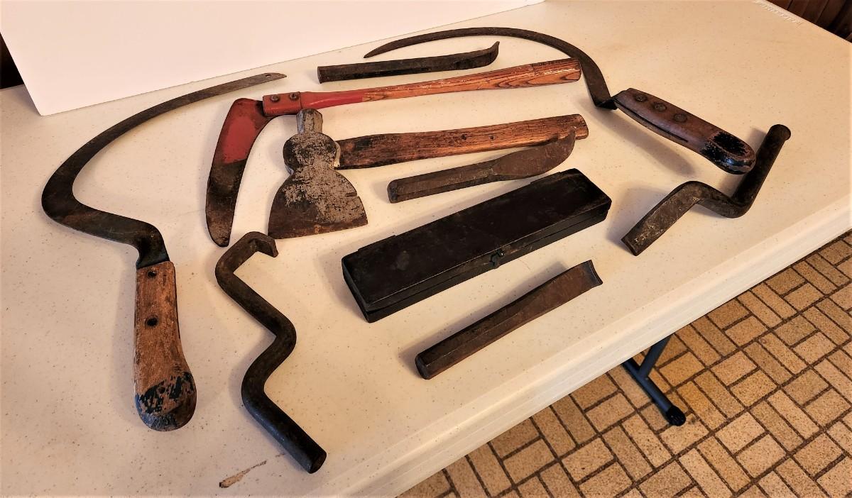 Good lot of antique tools - all you see here. Hatchet, and couple of scythes, etc. 10 pieces in all.