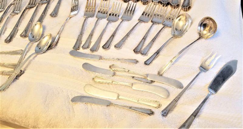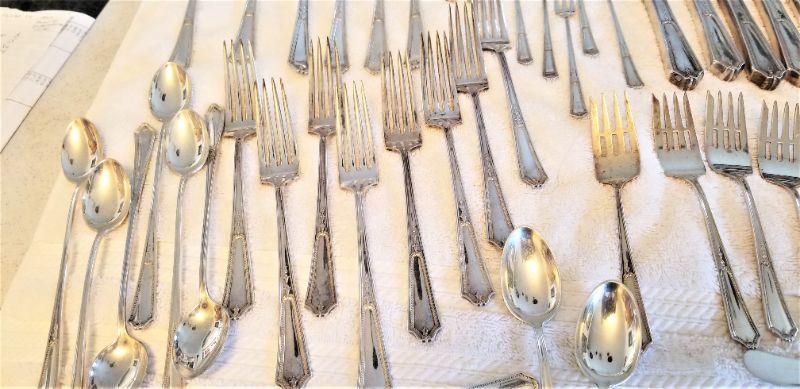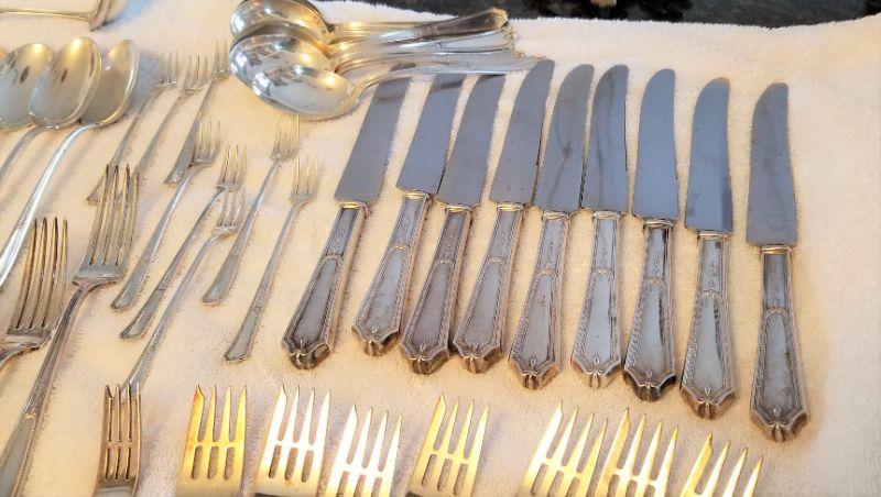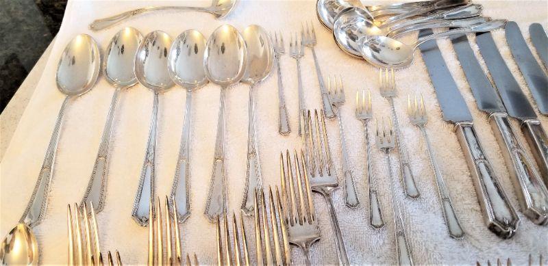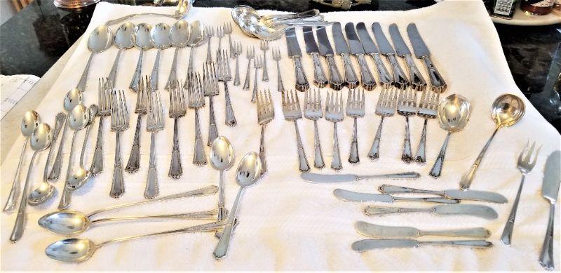You get all you see here - 70 pieces of Sterling silver flatware by the Jennings Silver Co. in the "Georgian Maid" pattern. The pattern originated in 1923 and was discontinue before 1943, when the company was purchased by International Silver. This is approximately 66 troy ounces. You get 8 dessert forks, 8 dinner forks, 8 seafood forks, 8 Iced tea spoon, 8 cream soup spoons, 6 table spoons, 6 butter knives, 9 dinner knives, 7 miscellaneous serving pieces, and 2 tea spoons. NOTE: There is a reserve price on this silver. We are not selling it for scrap.