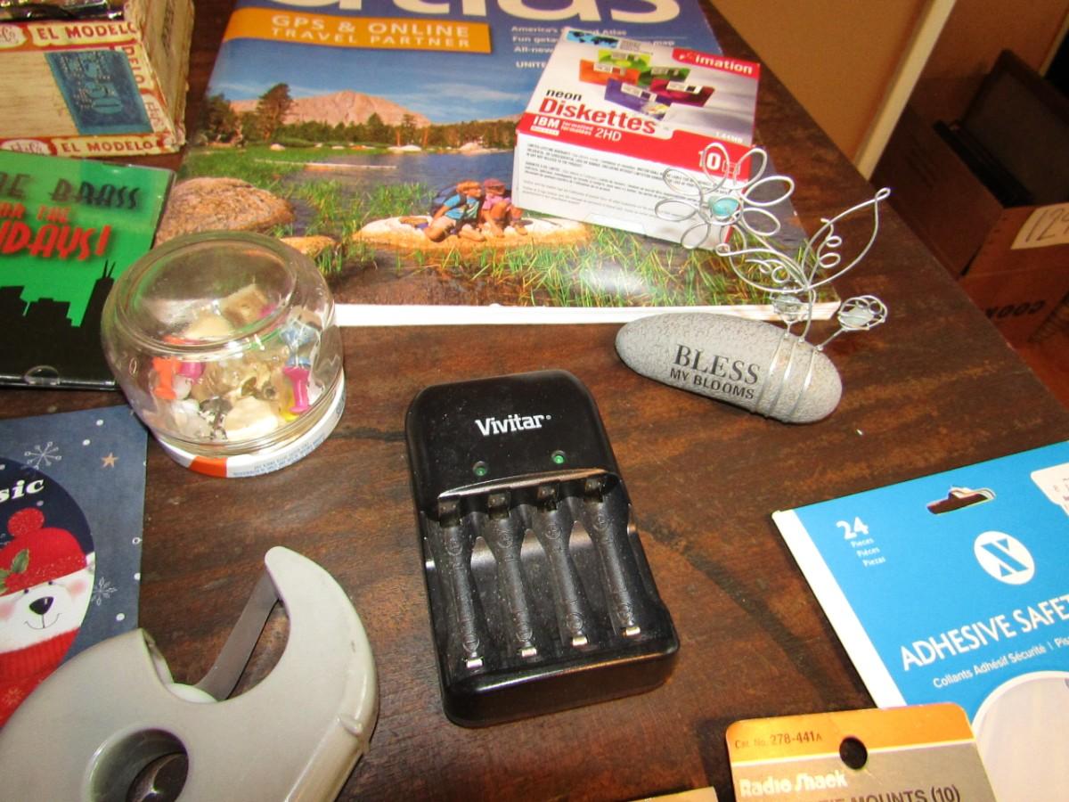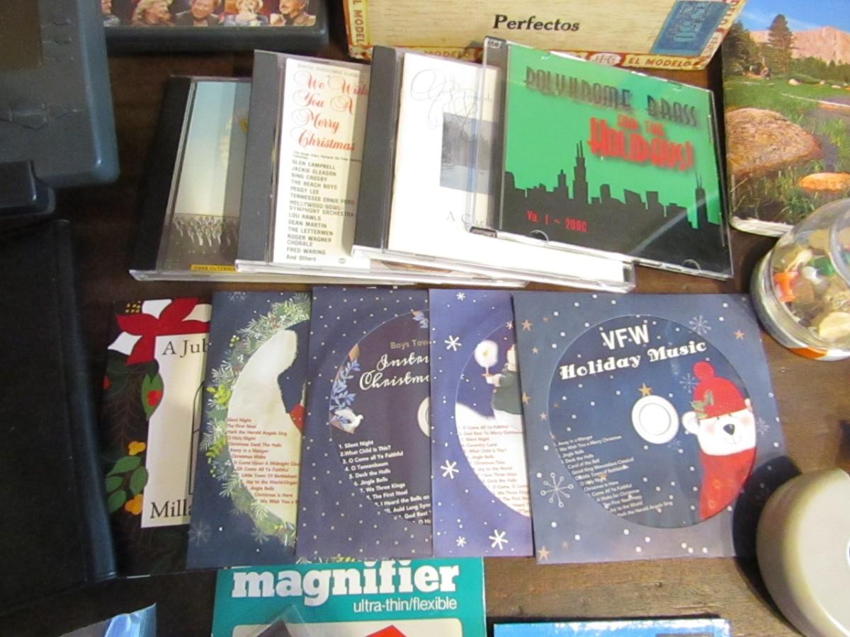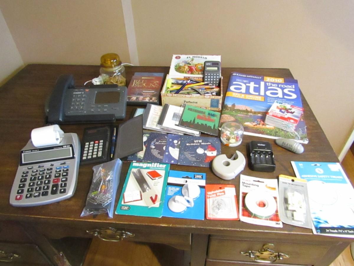 ELECTRIC AND SOLAR CALCULATORS, TELEPHONE, BATTERY CHARGER, MUSIC ON CD'S, PENS AND PENCILS IN A VINTAGE CIGAR BOX AND MORE