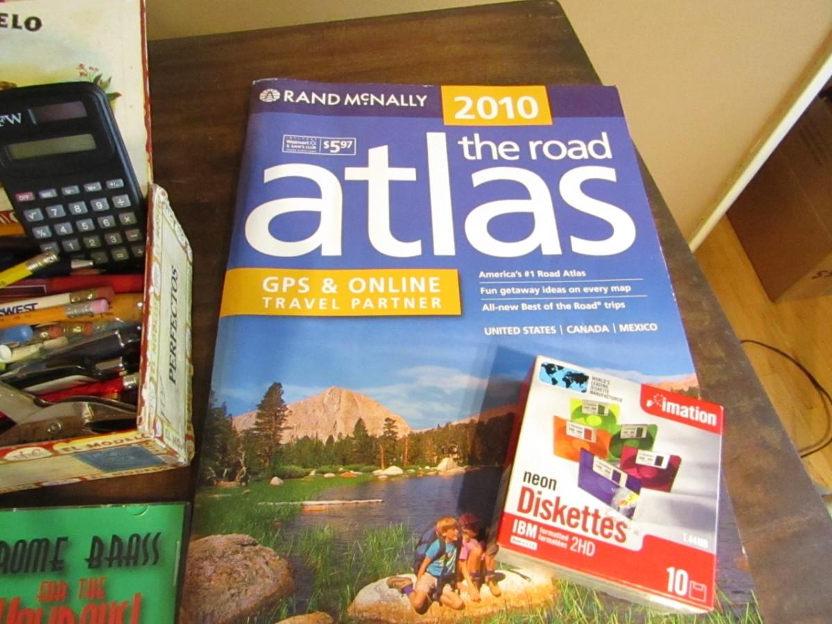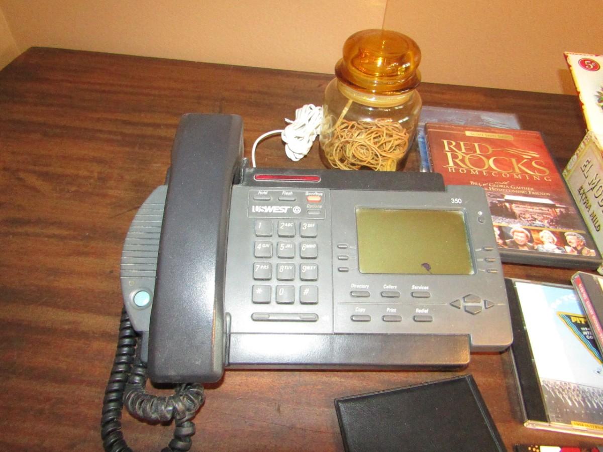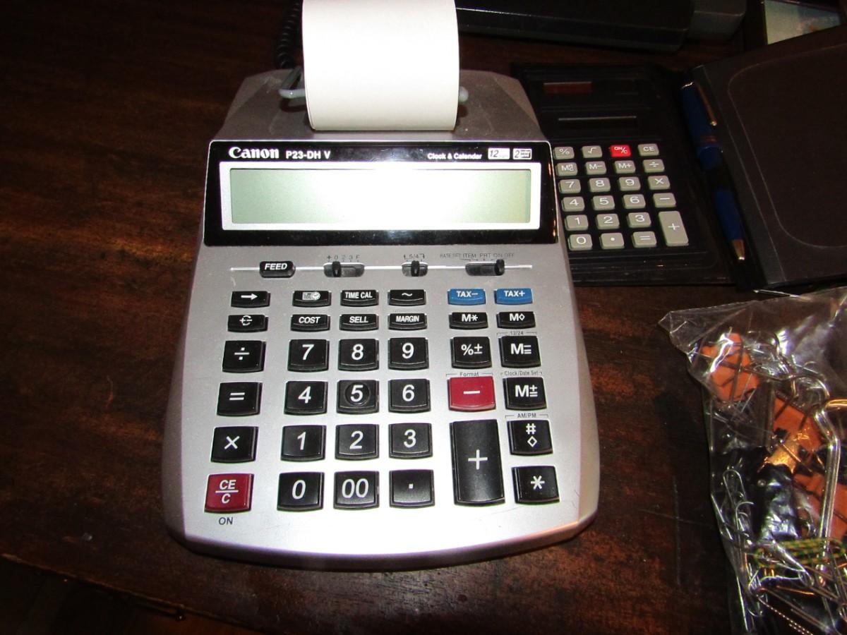 ELECTRIC AND SOLAR CALCULATORS, TELEPHONE, BATTERY CHARGER, MUSIC ON CD'S, PENS AND PENCILS IN A VINTAGE CIGAR BOX AND MORE
