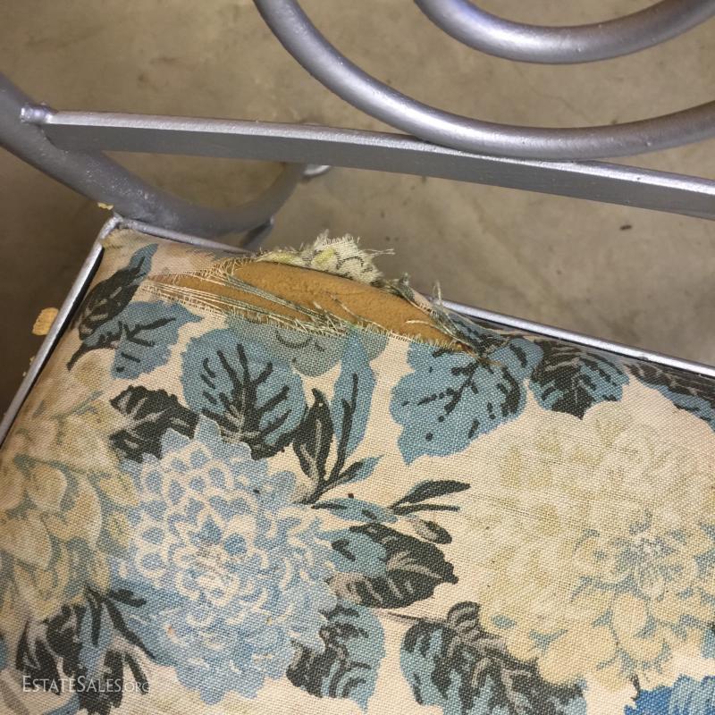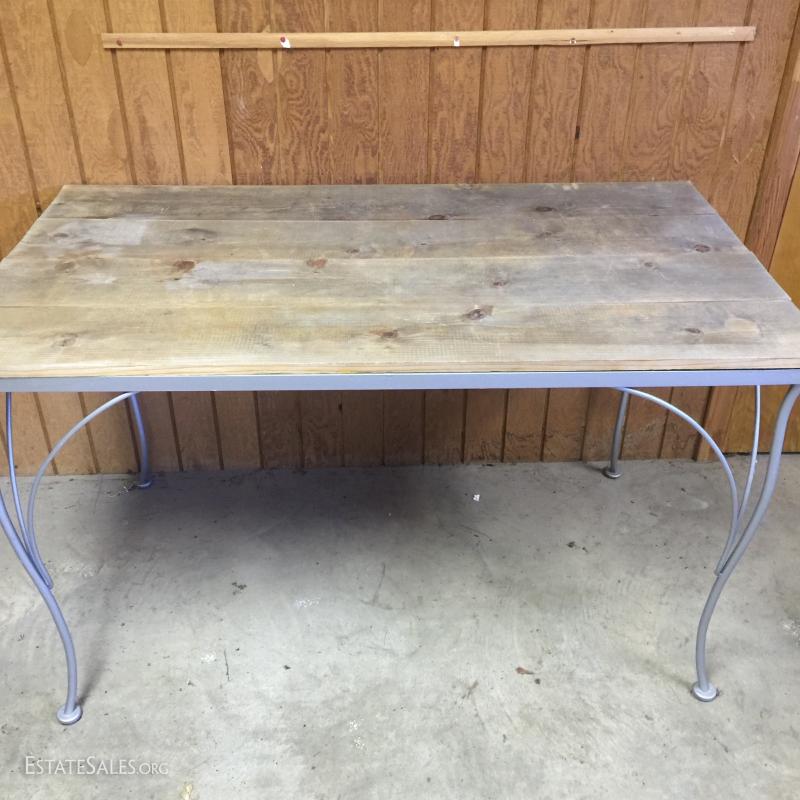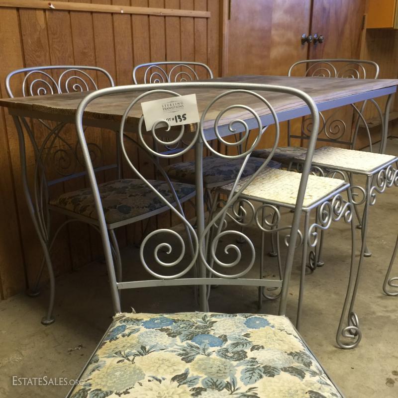 Outside table, chairs and plant stands. Painted metal frames. Natural wood top table cushion seats