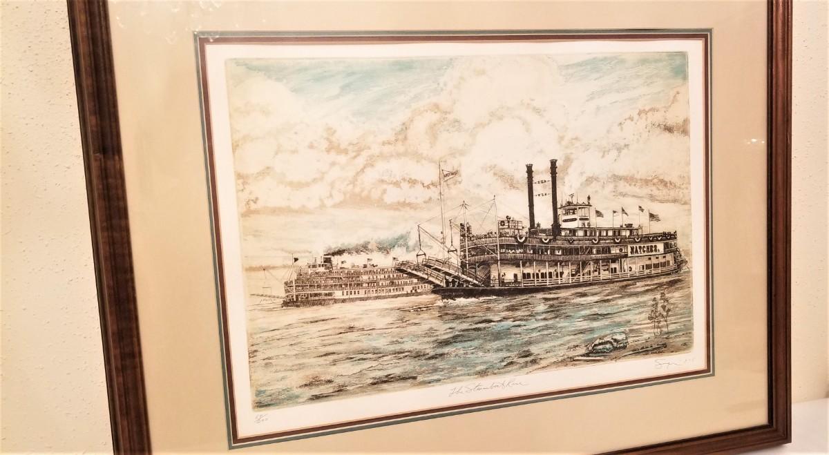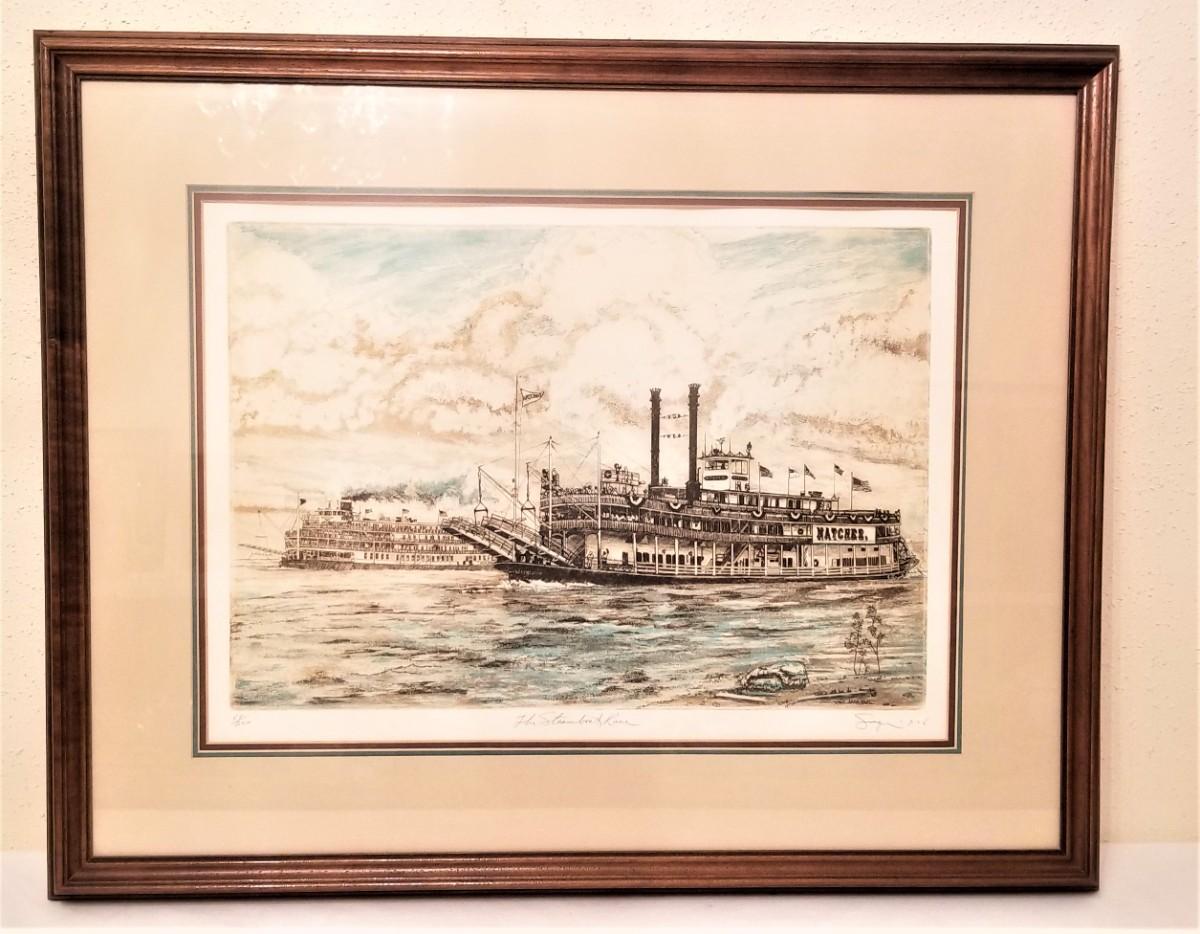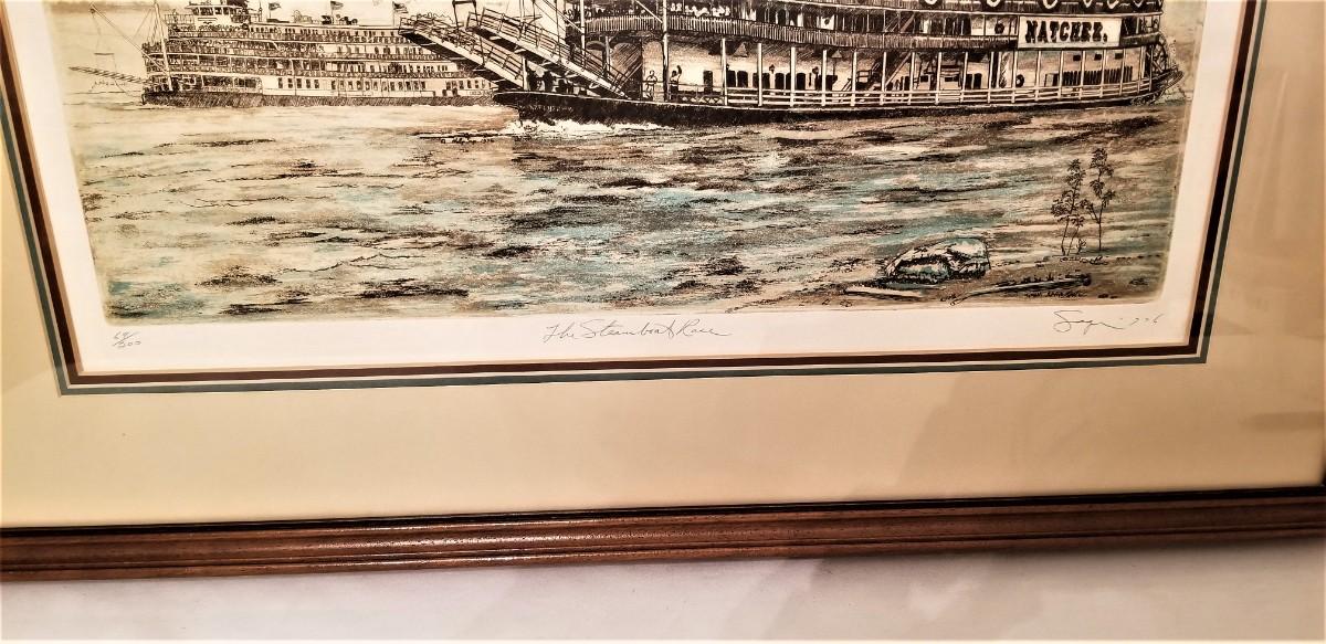 Nice Phillip Sage limited edition print, 64/200 - triple matted, signed, numbered. The Steamboat Race - 30" wide, 24" tall, Done in 1976. Good condition.