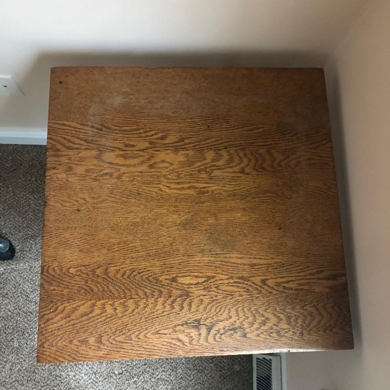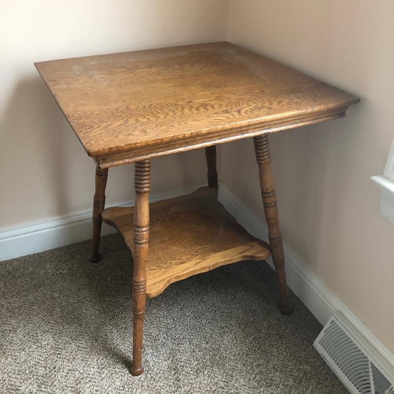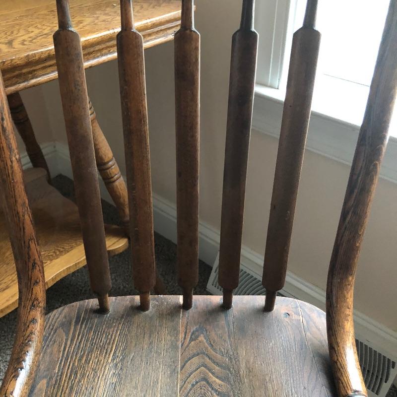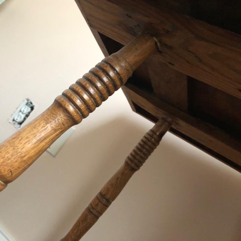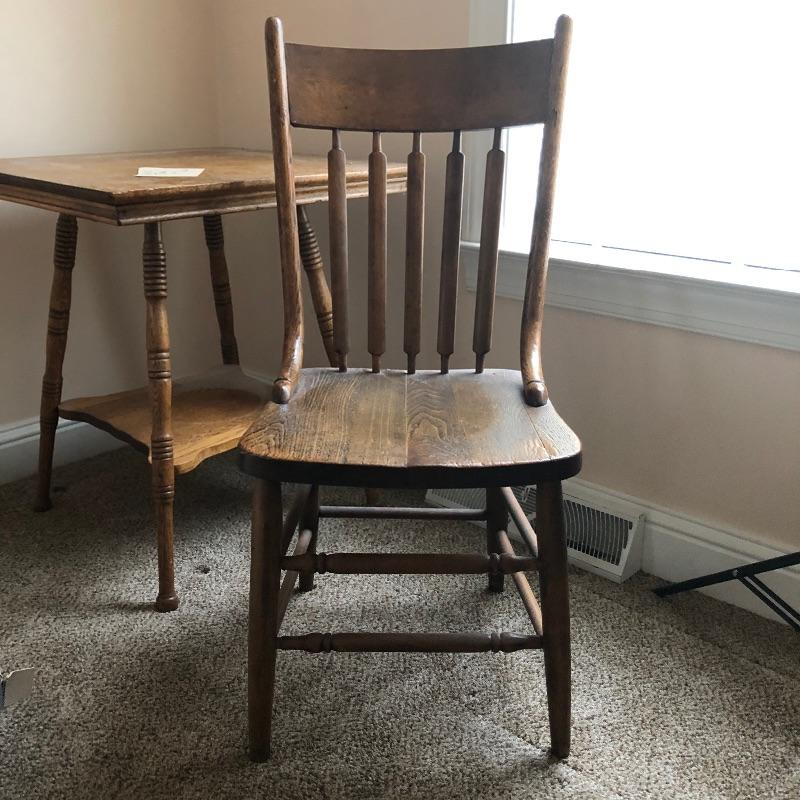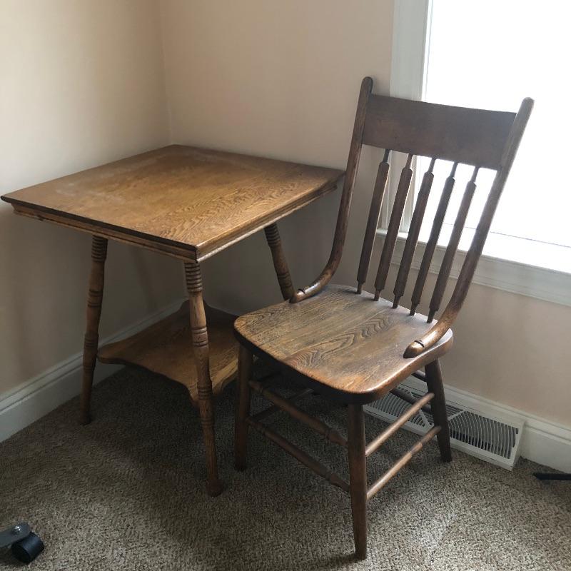 Really nice wood side table and chair. Add charm to your space with this combo. Table has lovely detail on its legs and a shelf and measures. 24” x 24” x 28”. The chair that we paired with the table measures 15” x 16” x 36”, seat is 17”. Please note blemishes on chair shown in last photo.