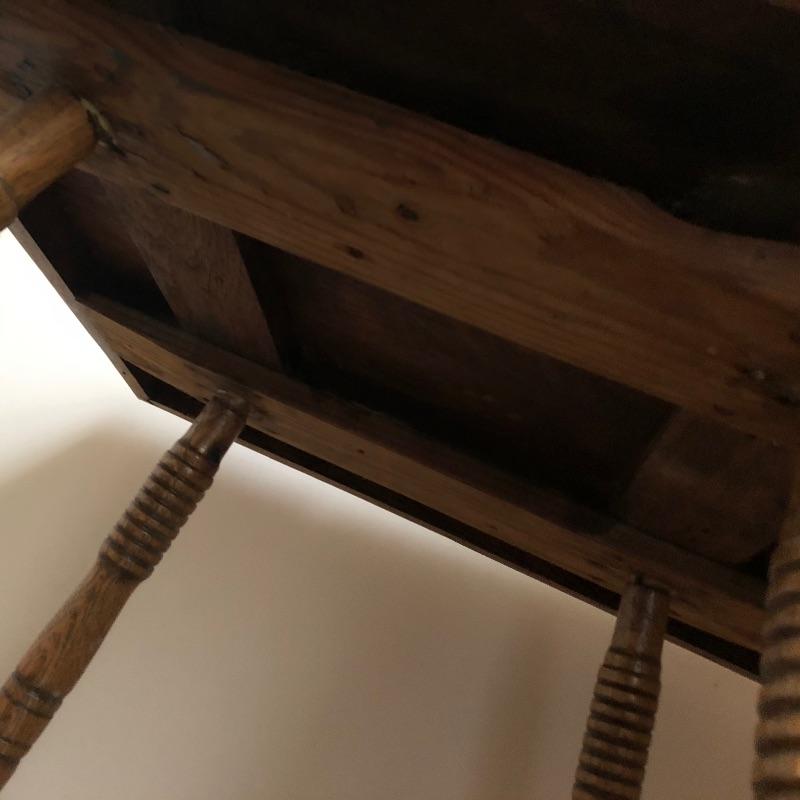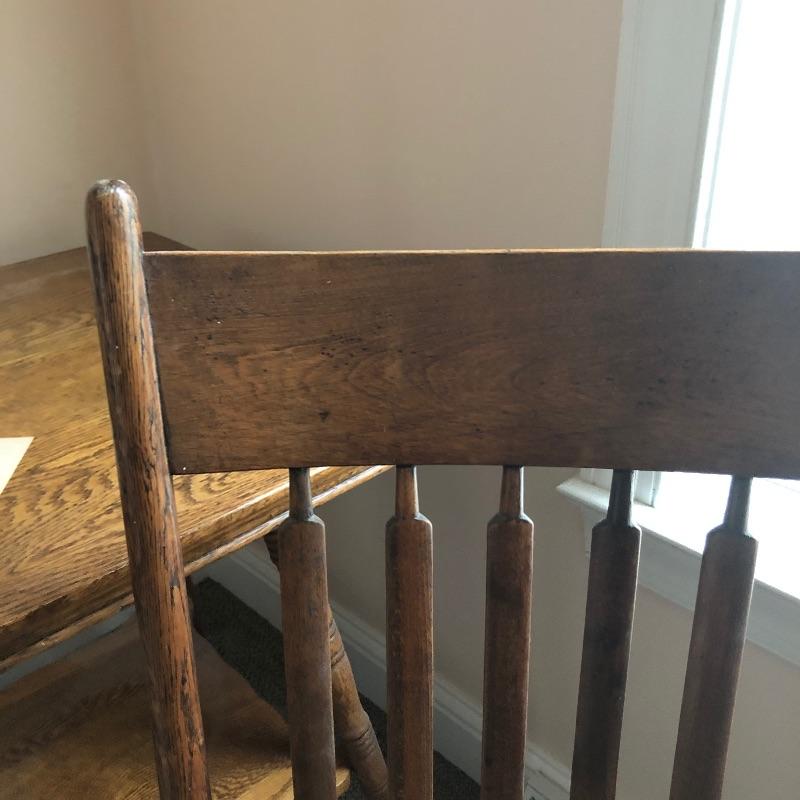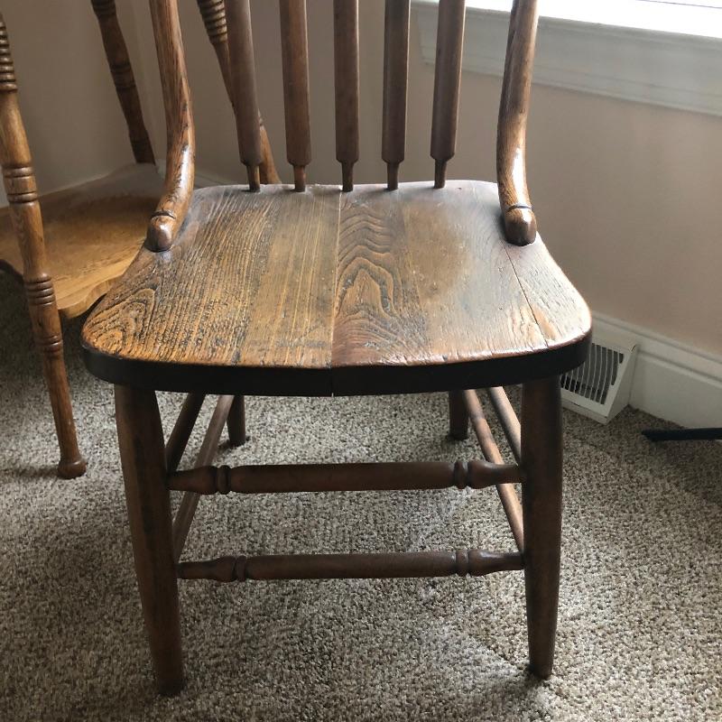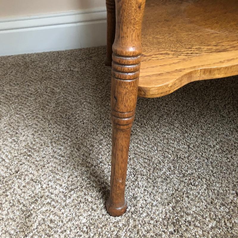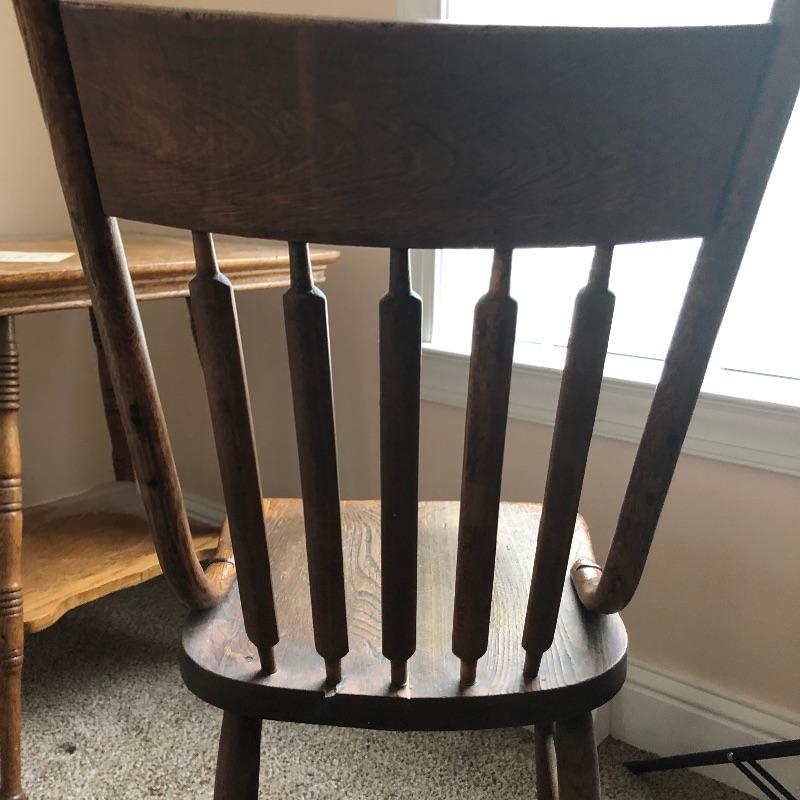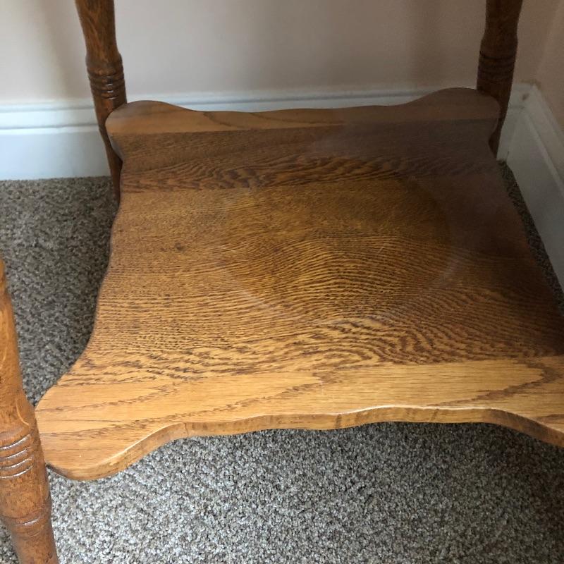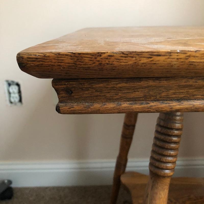 Really nice wood side table and chair. Add charm to your space with this combo. Table has lovely detail on its legs and a shelf and measures. 24” x 24” x 28”. The chair that we paired with the table measures 15” x 16” x 36”, seat is 17”. Please note blemishes on chair shown in last photo.