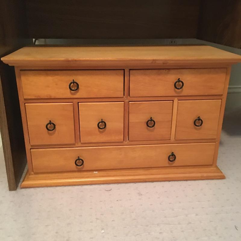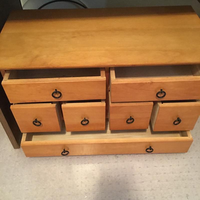 Small seven drawer box will be a great piece on your dresser or in the living room. Cabinet has two small indents on the top, see pictures.